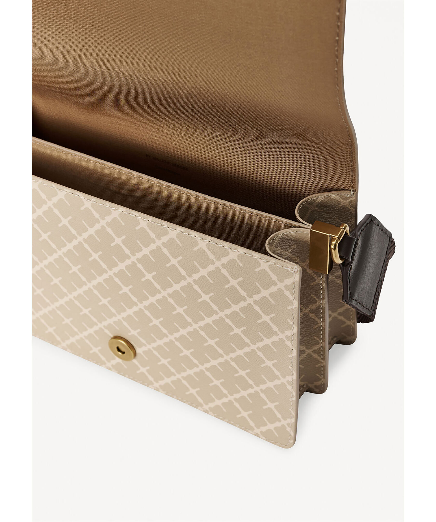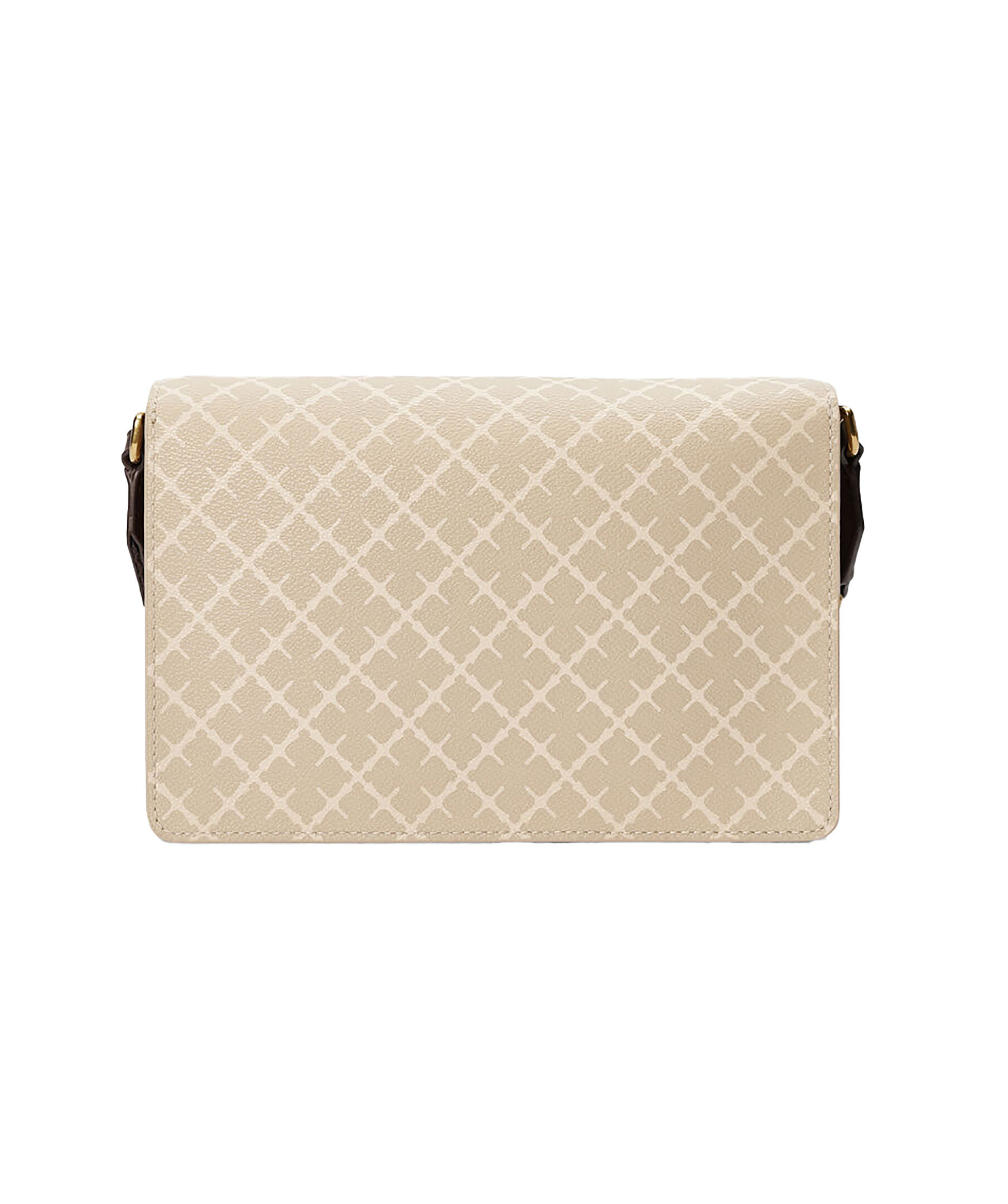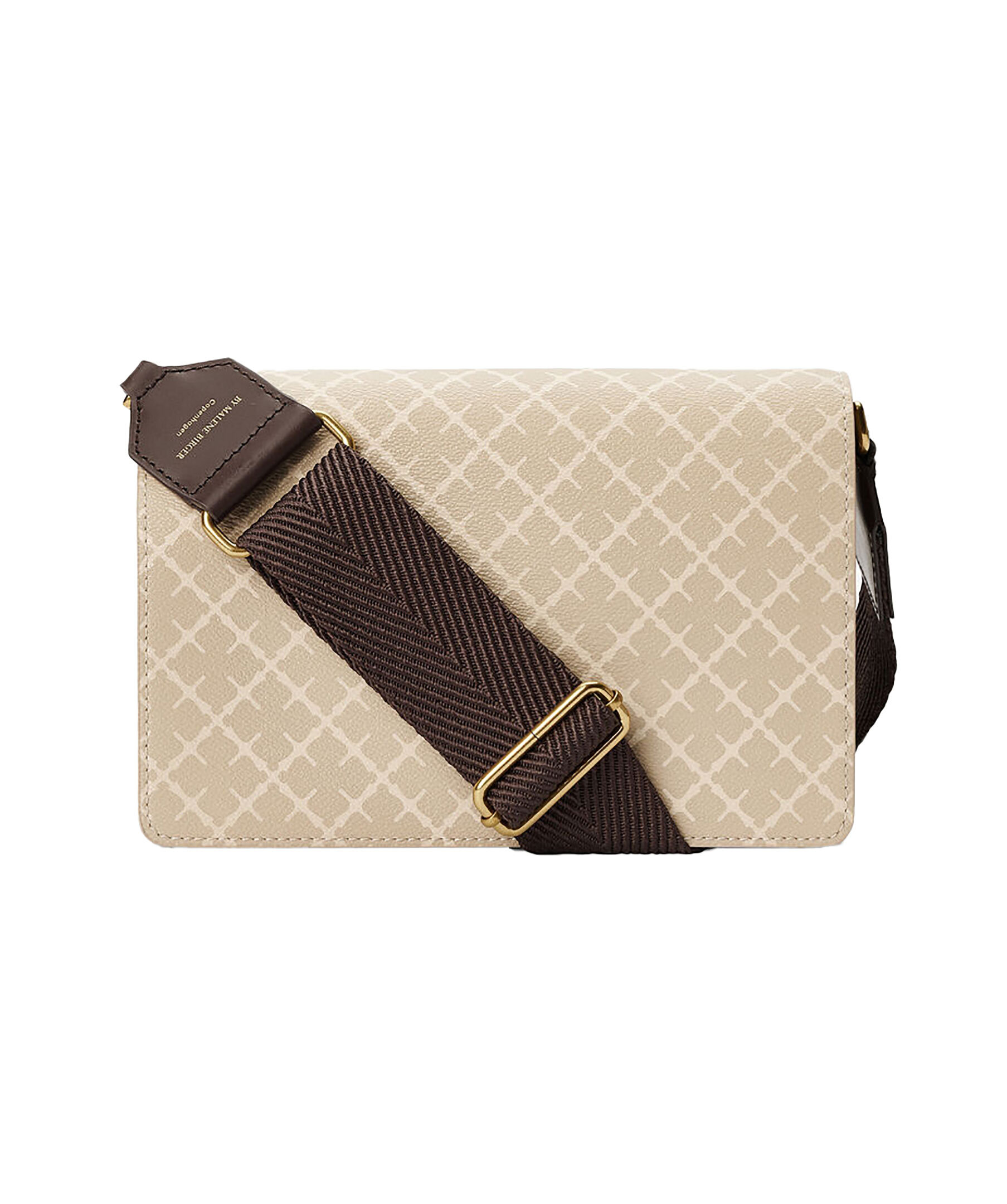 Beige, mönstrad väska från By Malene Birger. Locket stängs med magnetlås. Justerbar axelrem med detaljer i läder. Guldfärgade detaljer i metall. Väskan har två fack. Väskans mått: L 24cm x H 17 cm x 8.5 cm. Axelremmen är 109 cm lång.