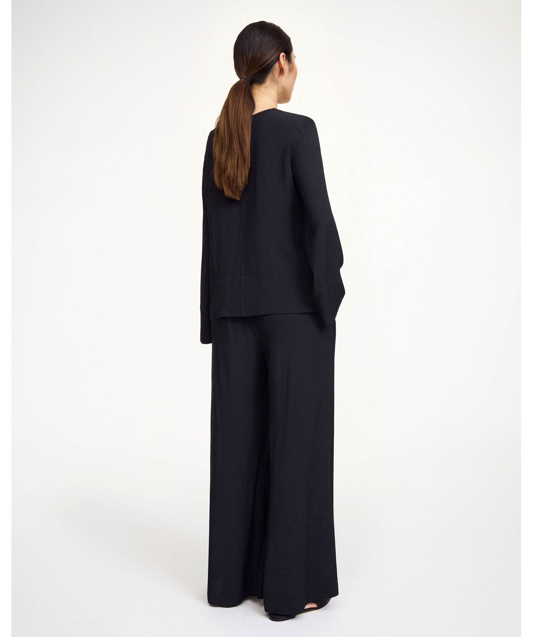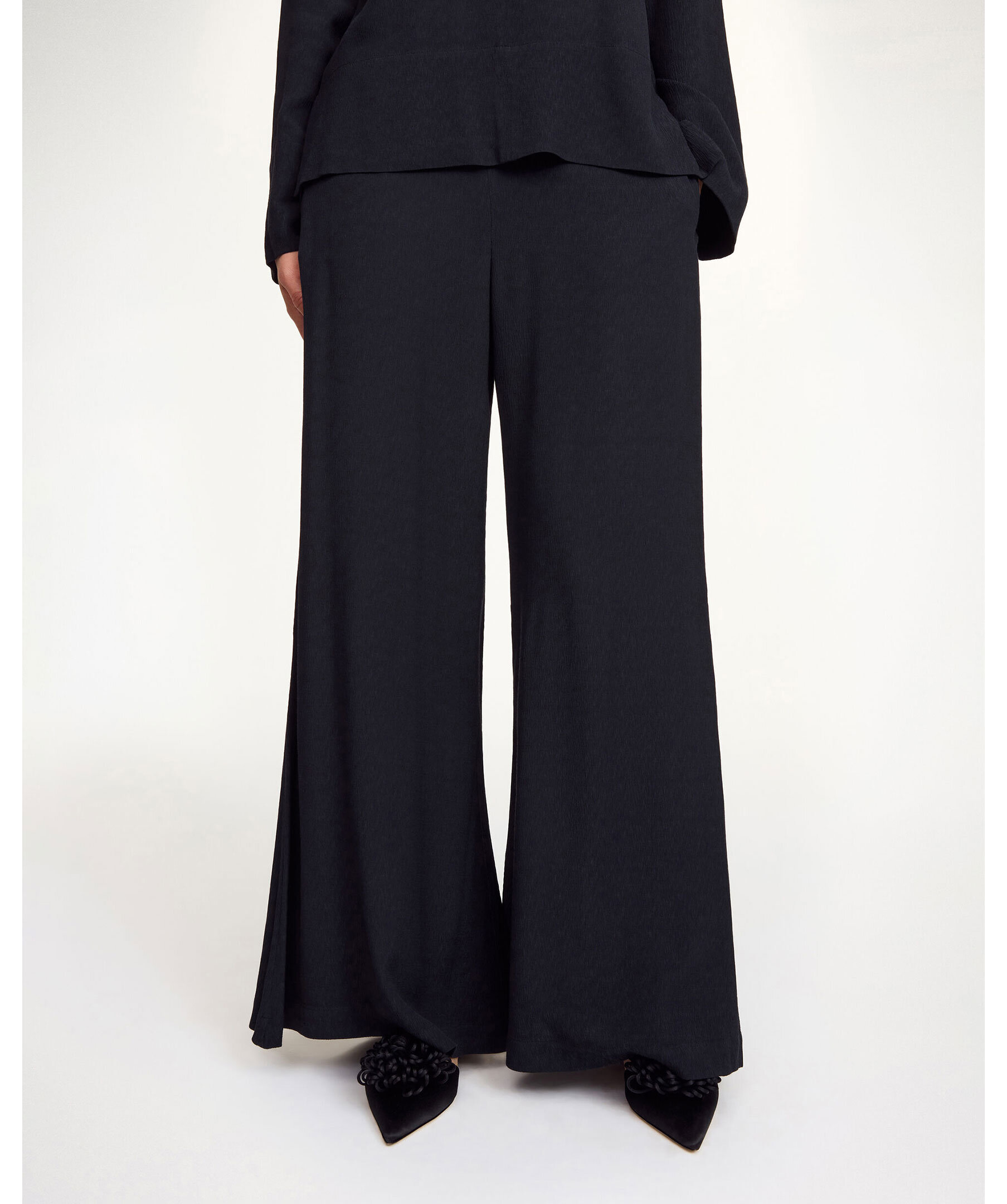 Svarta byxor från By Malene Birgers med vida, utsvängda ben och en hög midja som skapar en elegant silhuett. De är det perfekta plagget att bära från kontoret till kvällens middag – kombinera dem med en oversize kavaj för en modern look eller en bohemisk blus för en mer avslappnad, feminin stil.