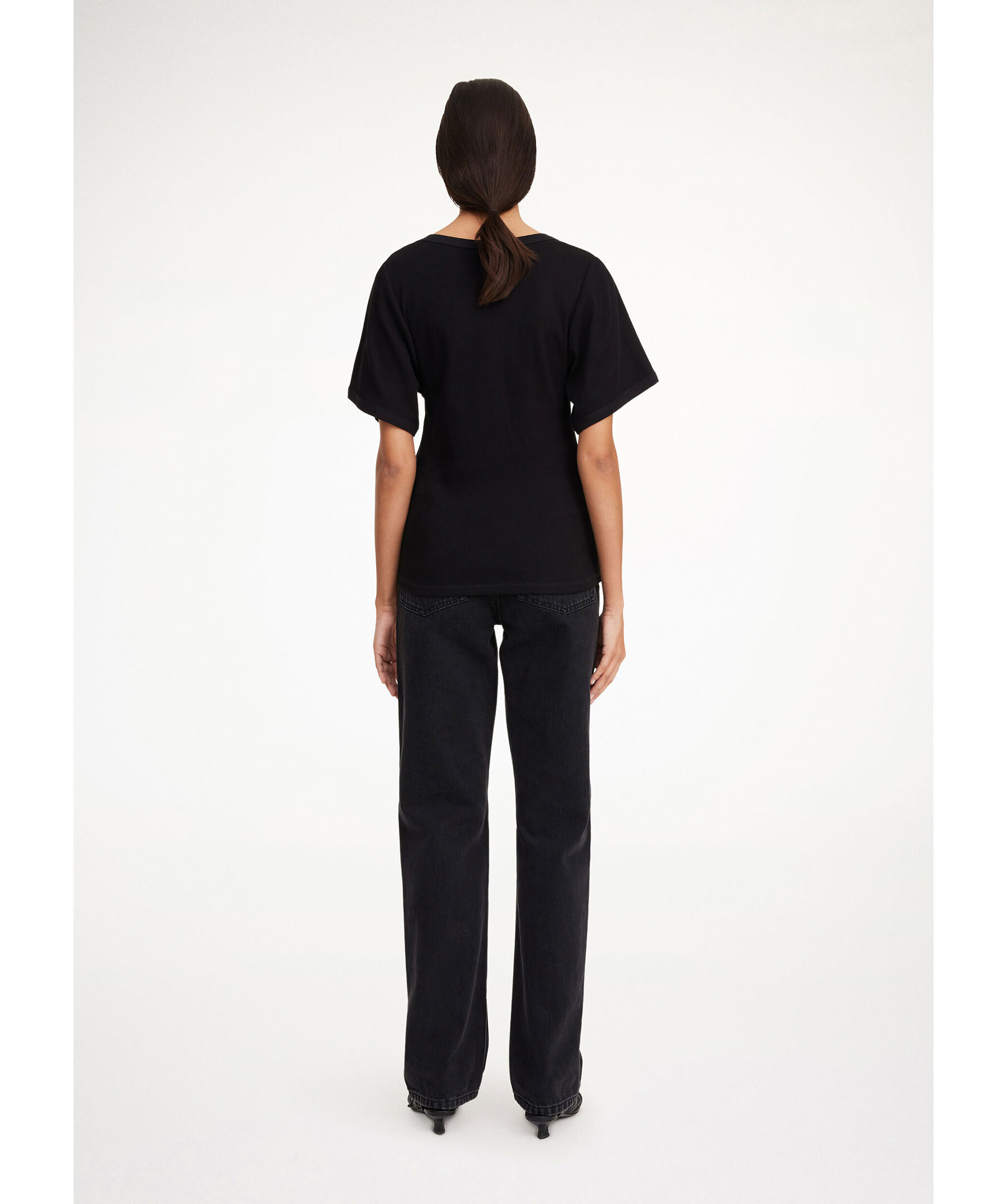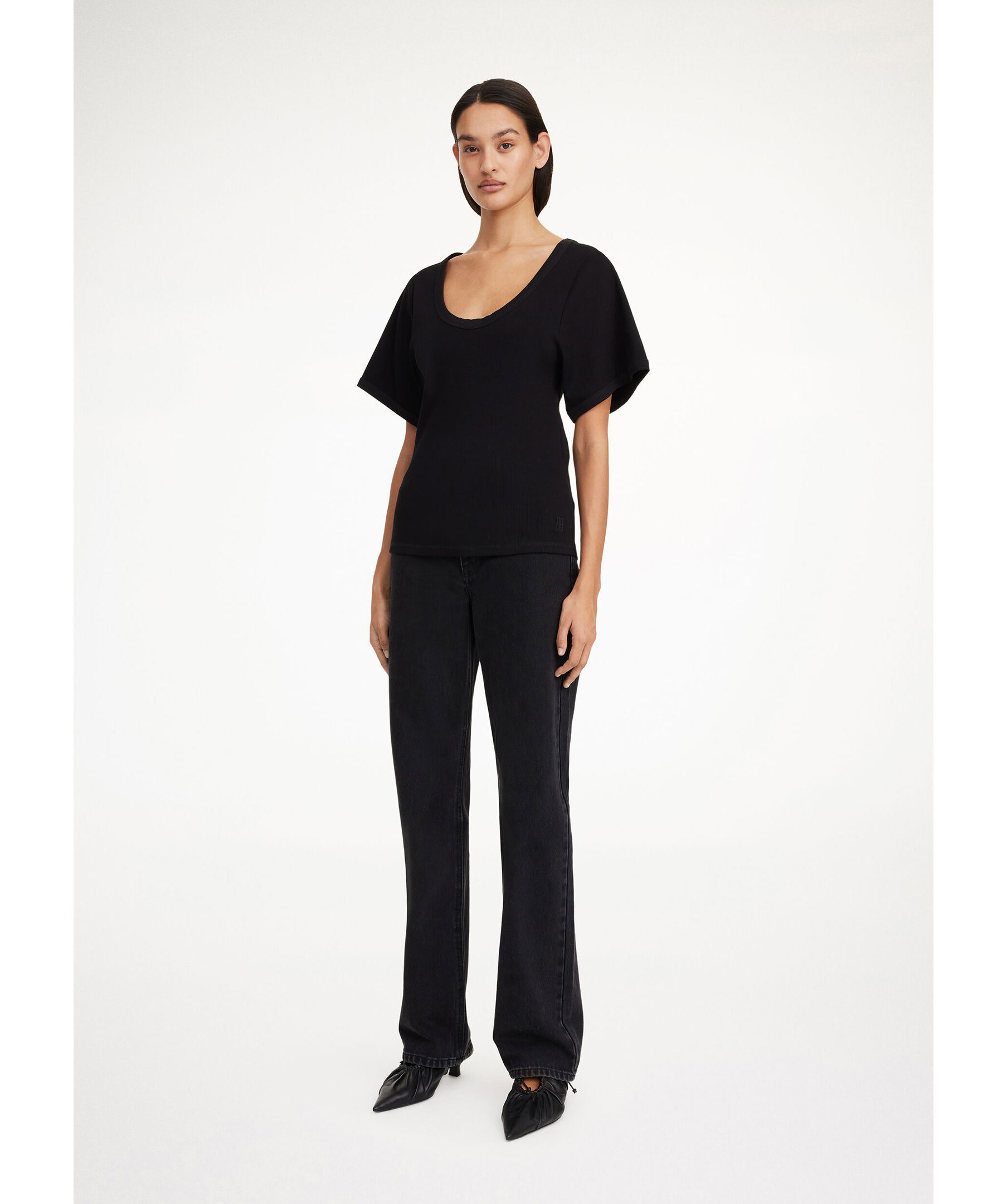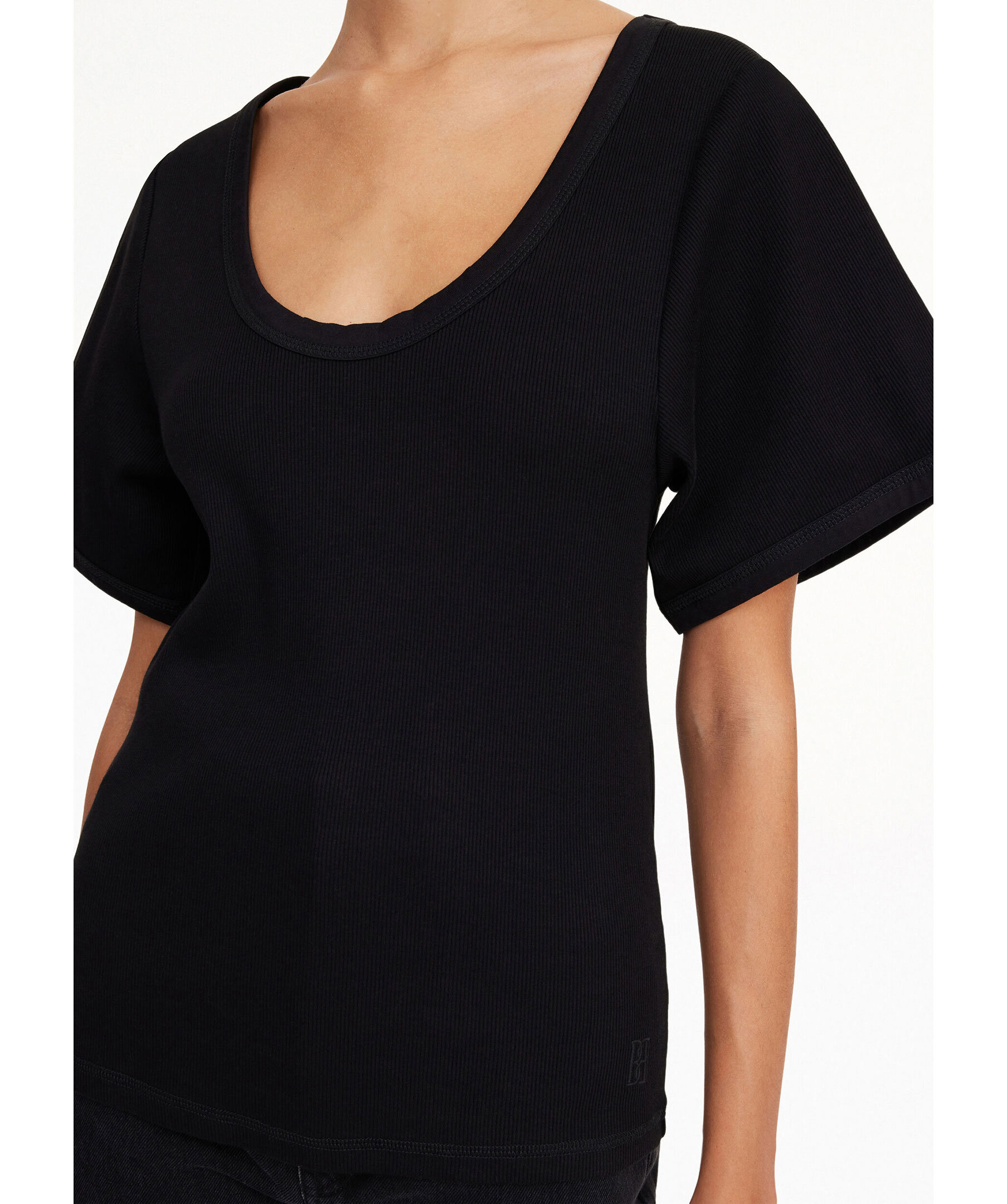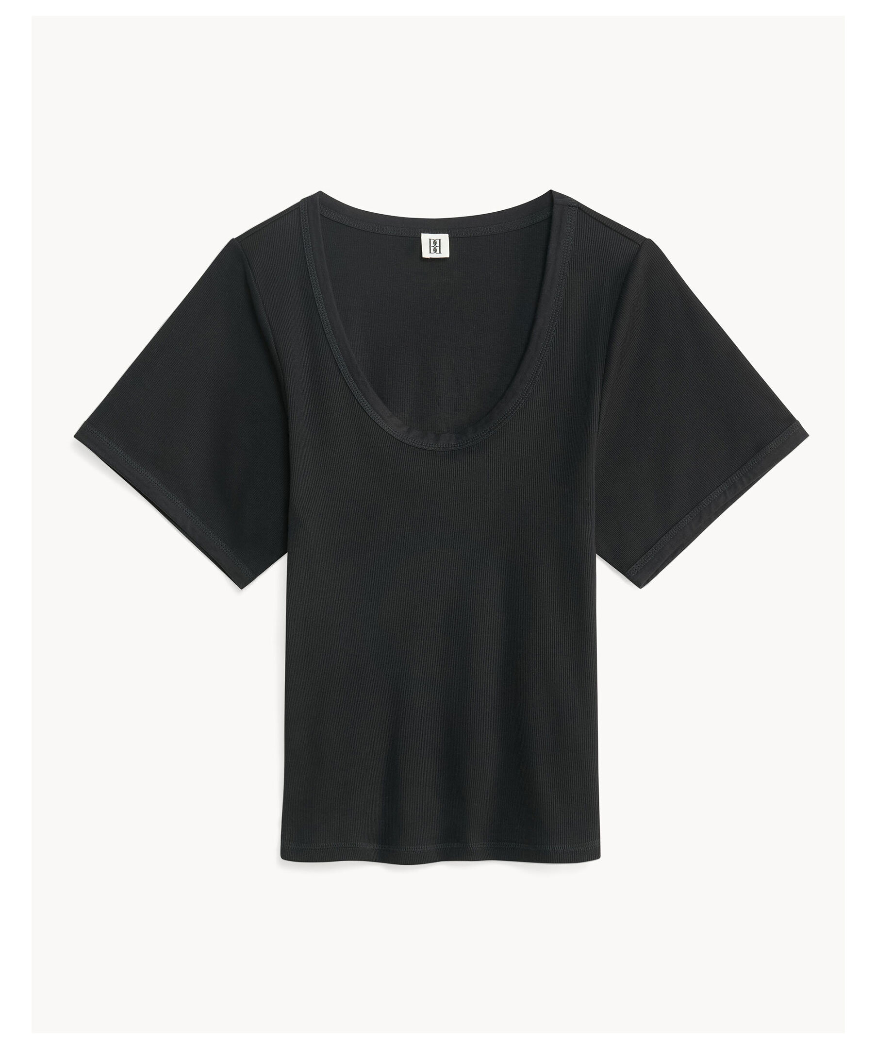 Svart, ribbstickad topp med korta ärmar från By Malene Birger. Toppen har en djup halsringing och vida, korta ärmar samt en figursydd design. Tillverkad i en stretchig organisk bomullsblandning.