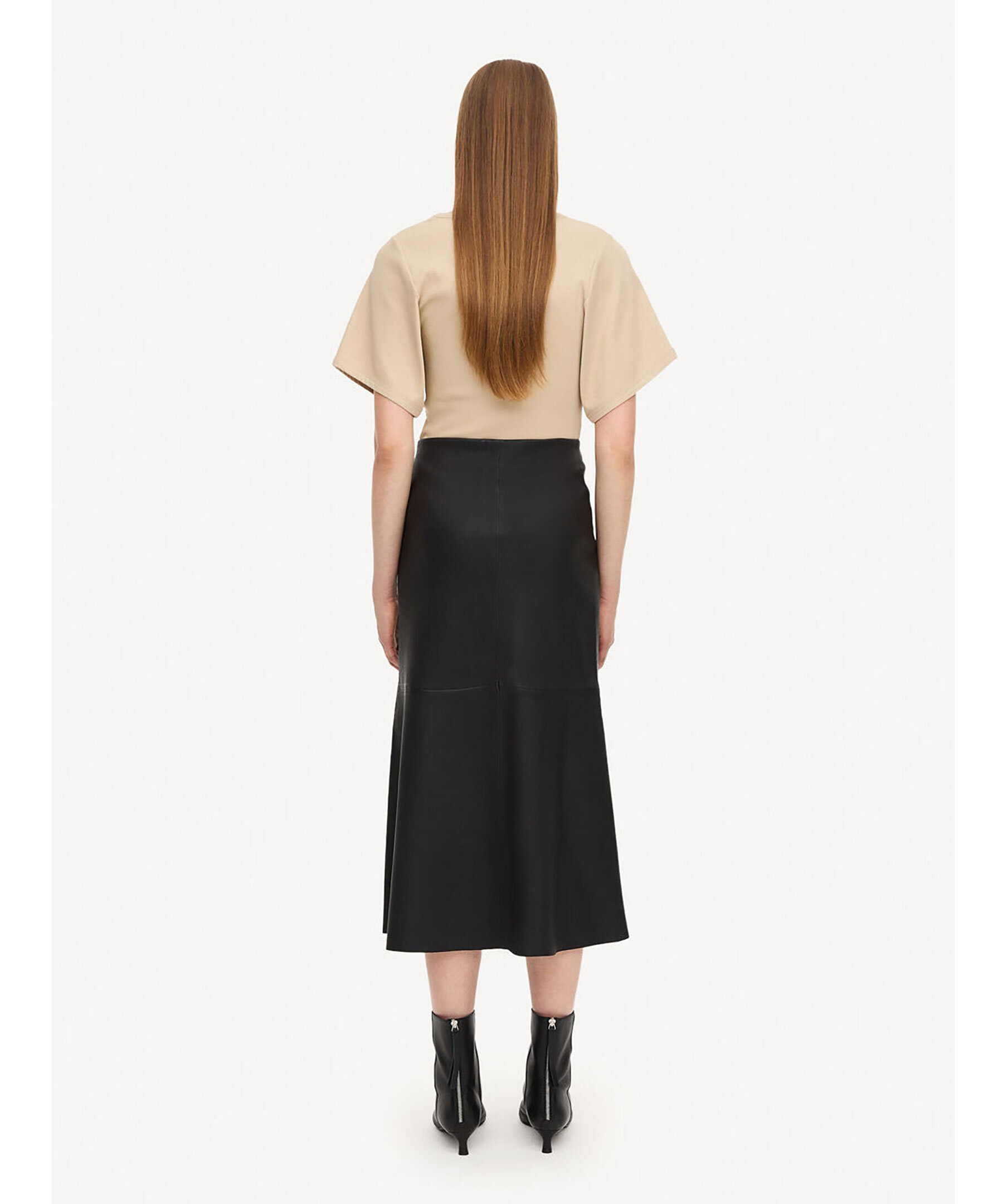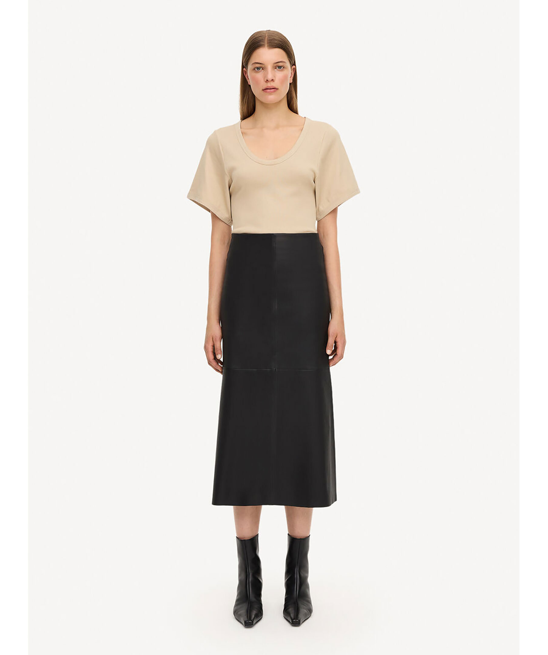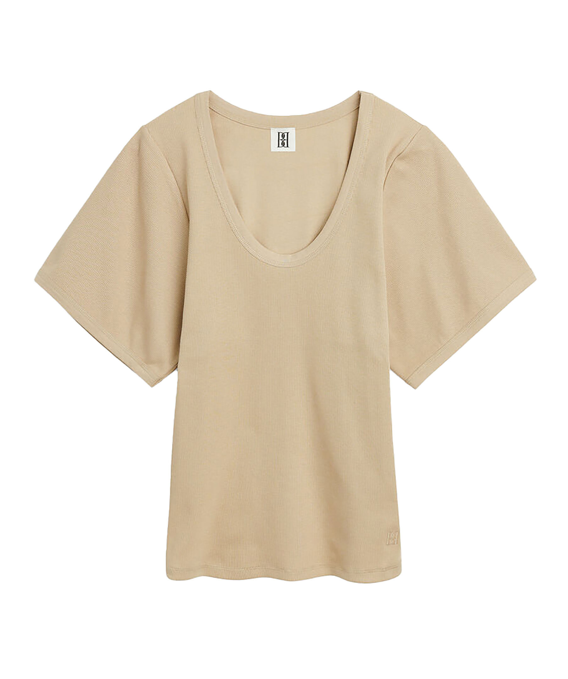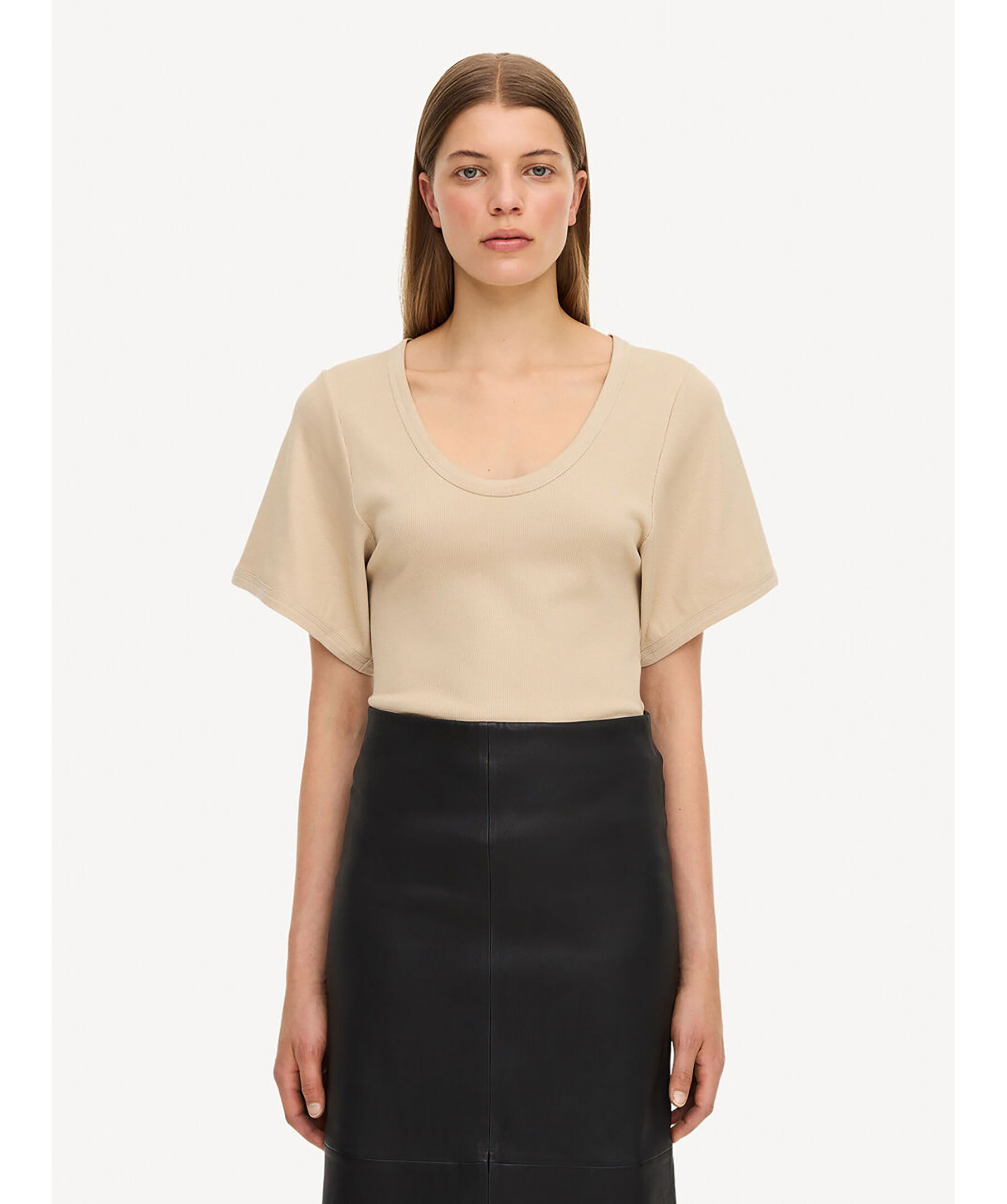 Beige ribbad T-shirt med vida ärmar från By Malene Birger. Rund och djup ringning. Broderad logotyp på vänster sida vid plaggslut. Tillverkad i 98% organisk bomull, 2% Elastane.