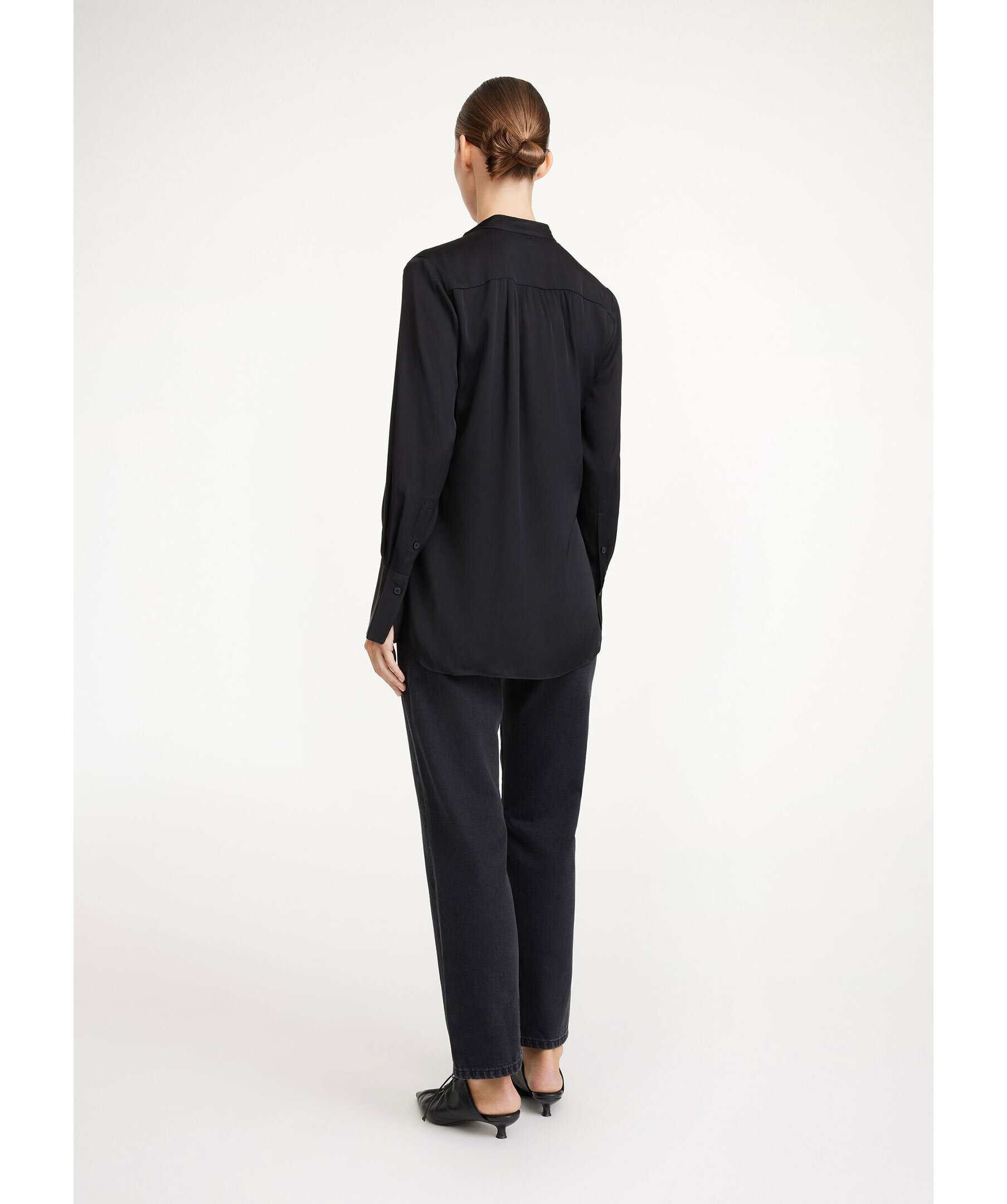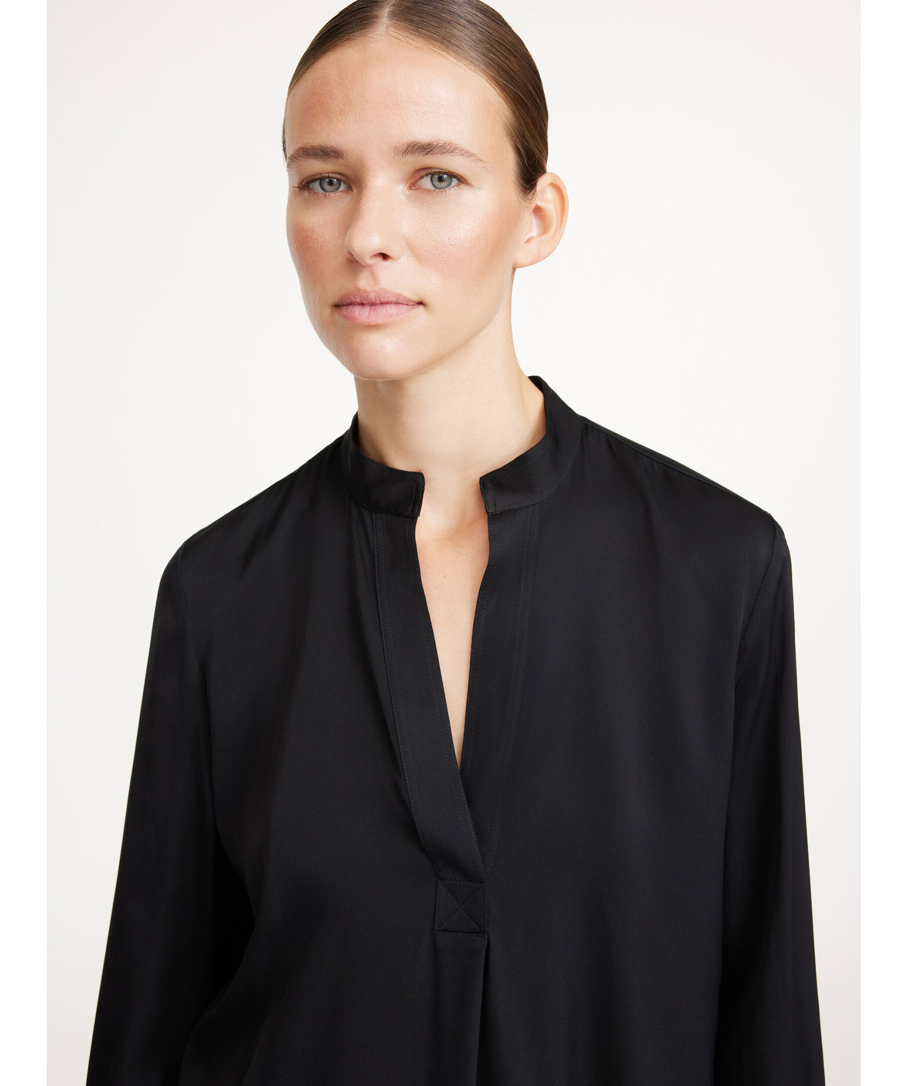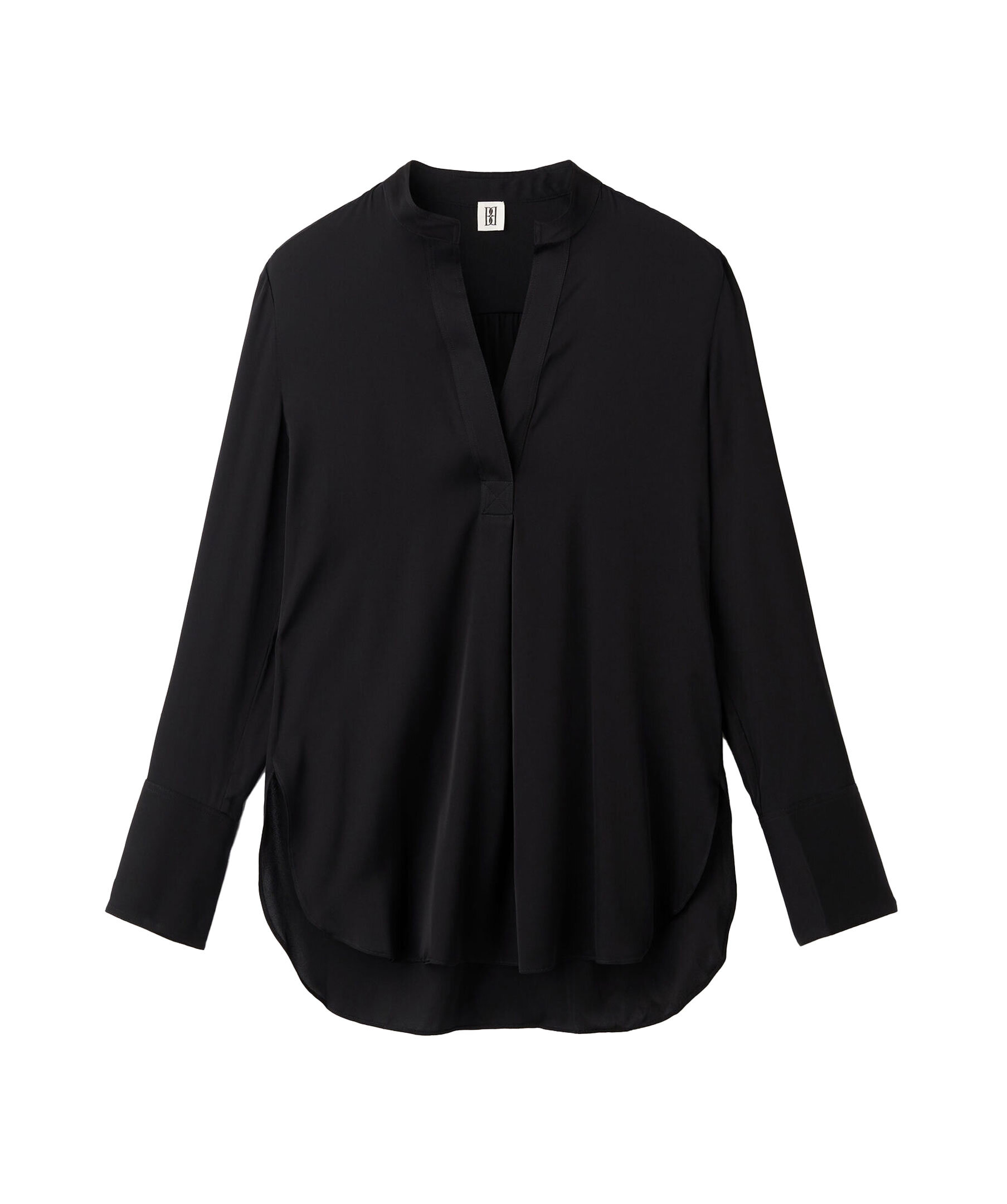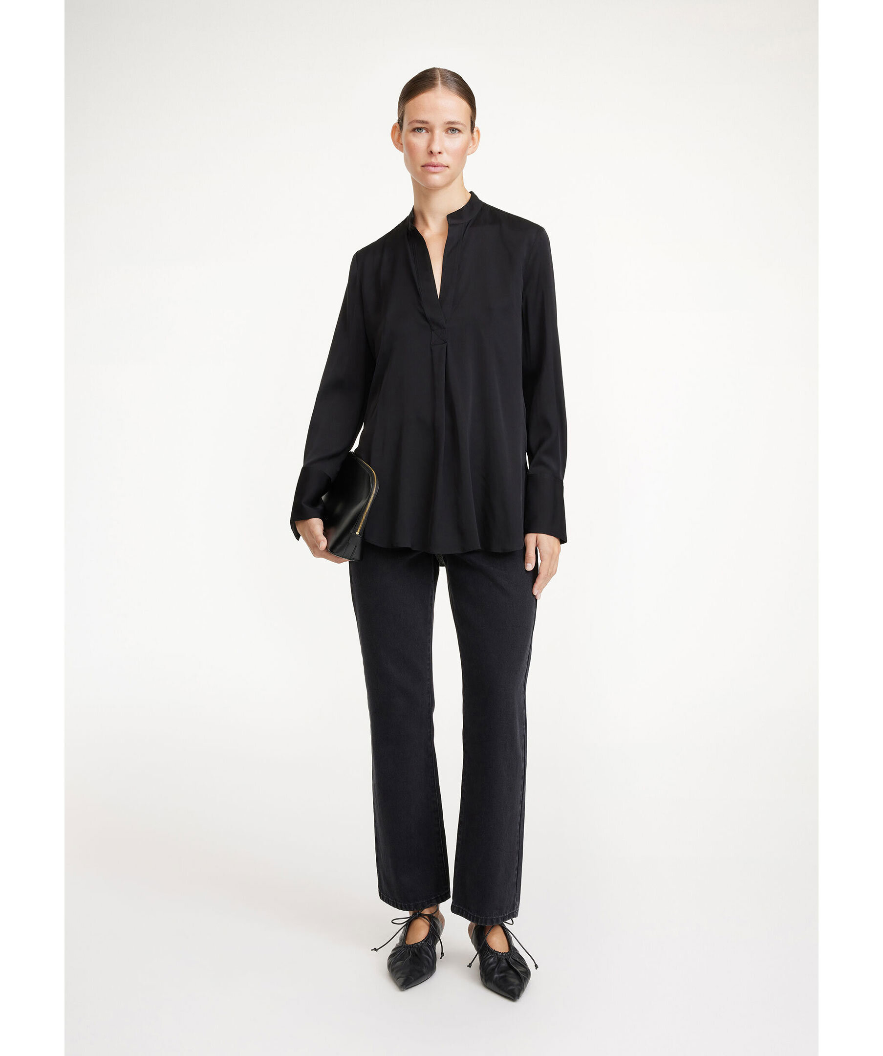 Svart blus från By Malene Birger. Gjord i en mjuk silkeblandning som passar för alla tillfällen. Den tidlösa designen har en normal passform och kännetecknas av en öppen halsringning med ståkrage, förlängda manschetter och en rundad fåll med markerade sidoslitsar. Bär den med allt från kostymer till jeans för en elegant look. Modellen är 178cm lång och har på sig strl 36.