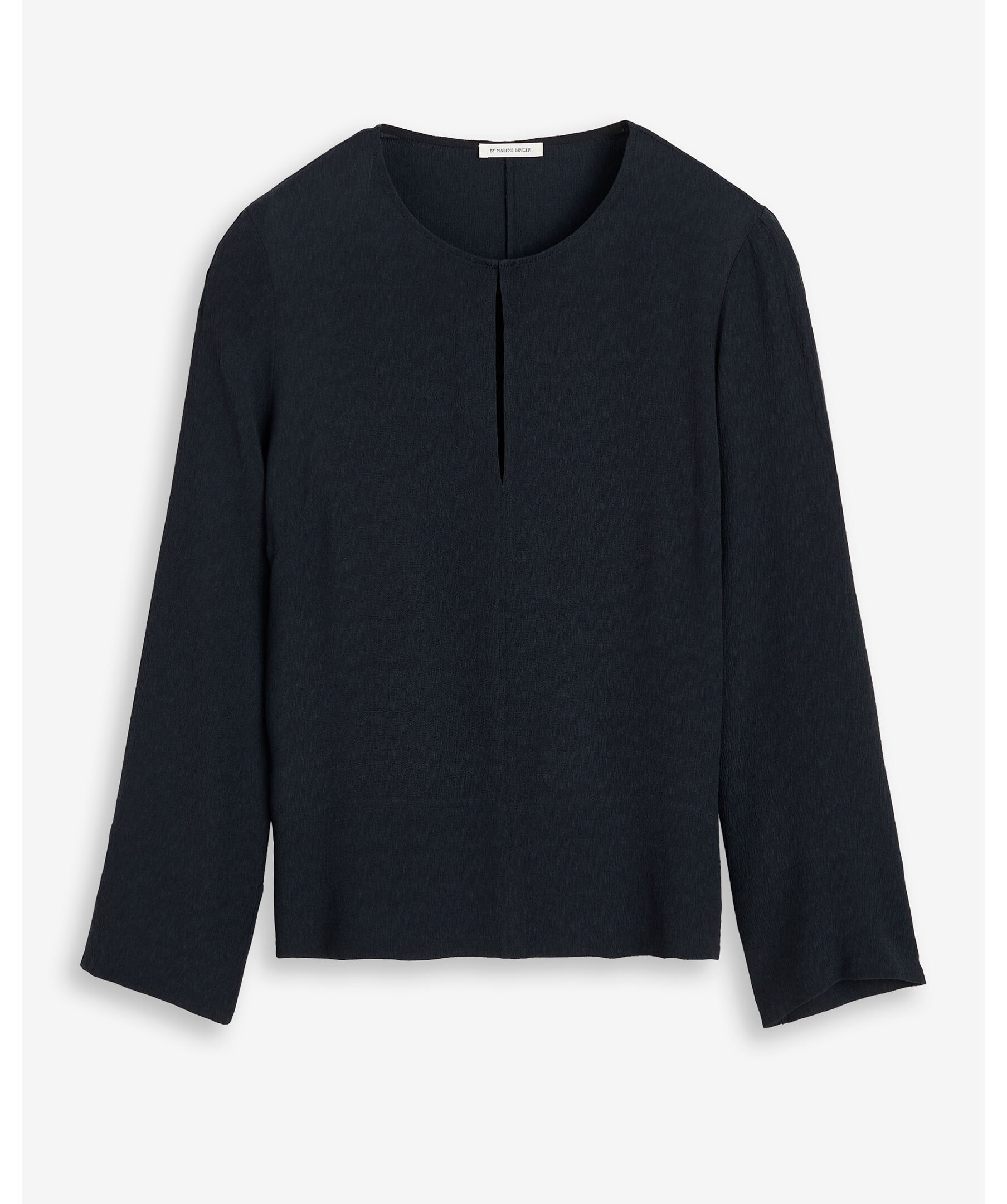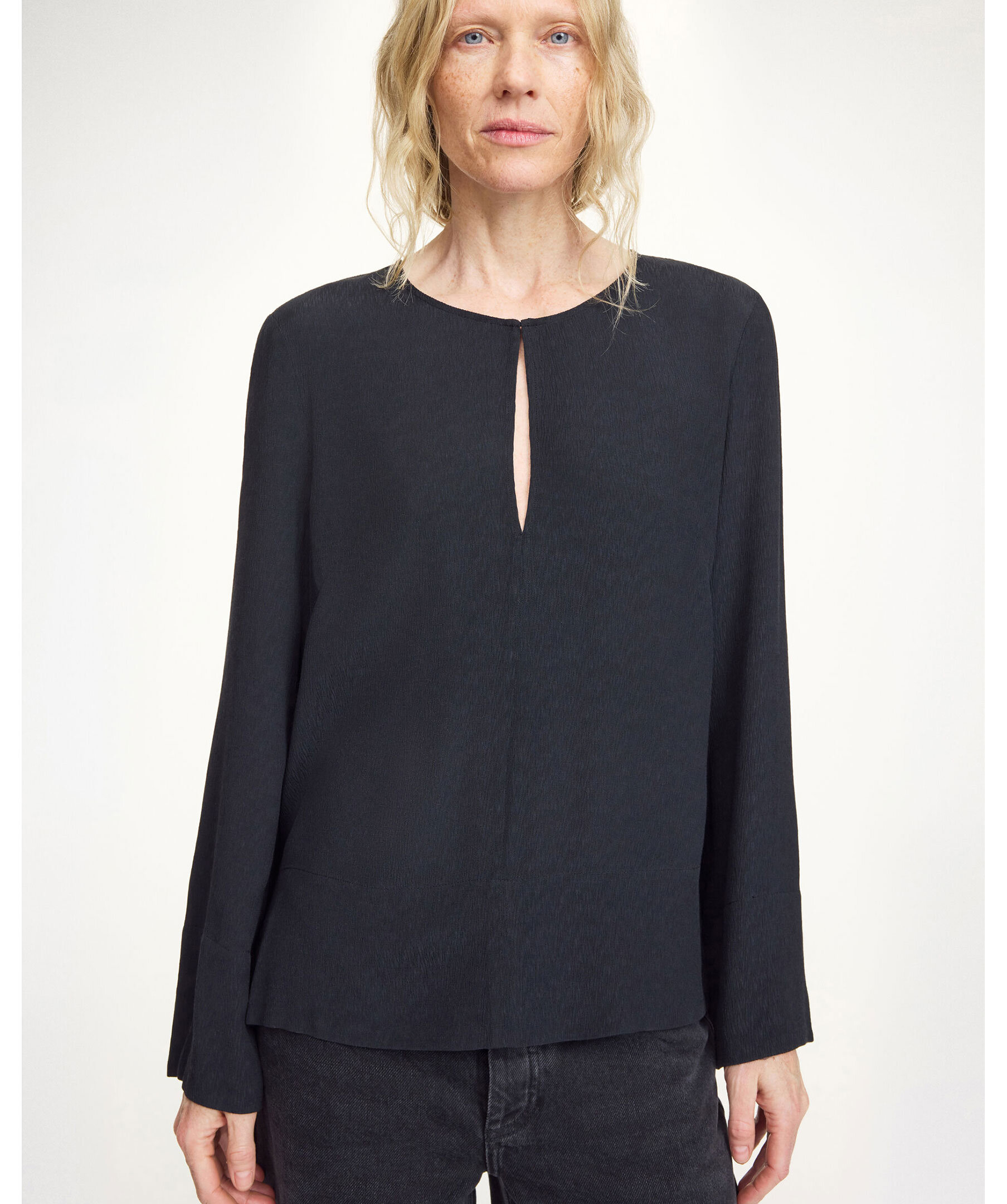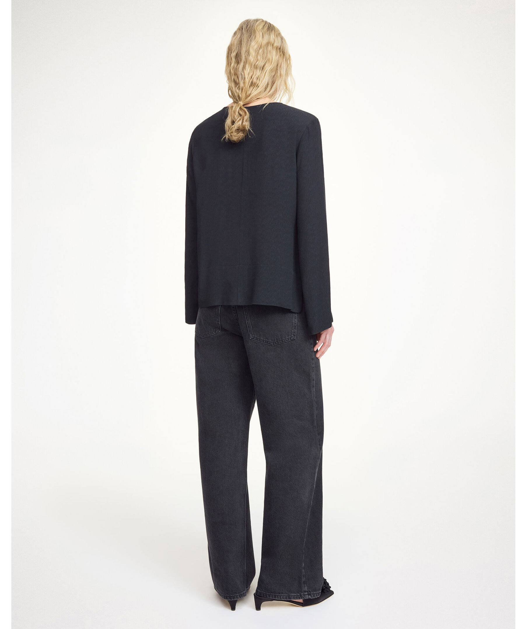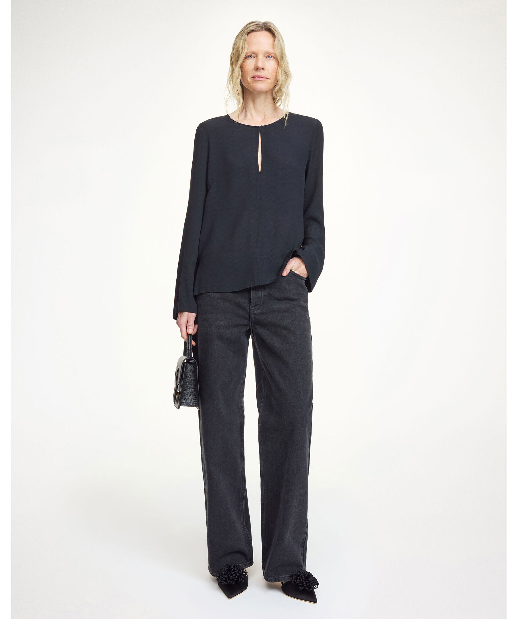 Den minimalistiska Malukka-blusen från By Malene Birger är ett tidlöst plagg som håller säsong efter säsong. Den har en rak siluett med djup cut-out-ringning, hake- och hyskstängning samt diskreta sidslitsar. Bär den med de matchande Lucee-byxorna för en elegant och enkel look.
