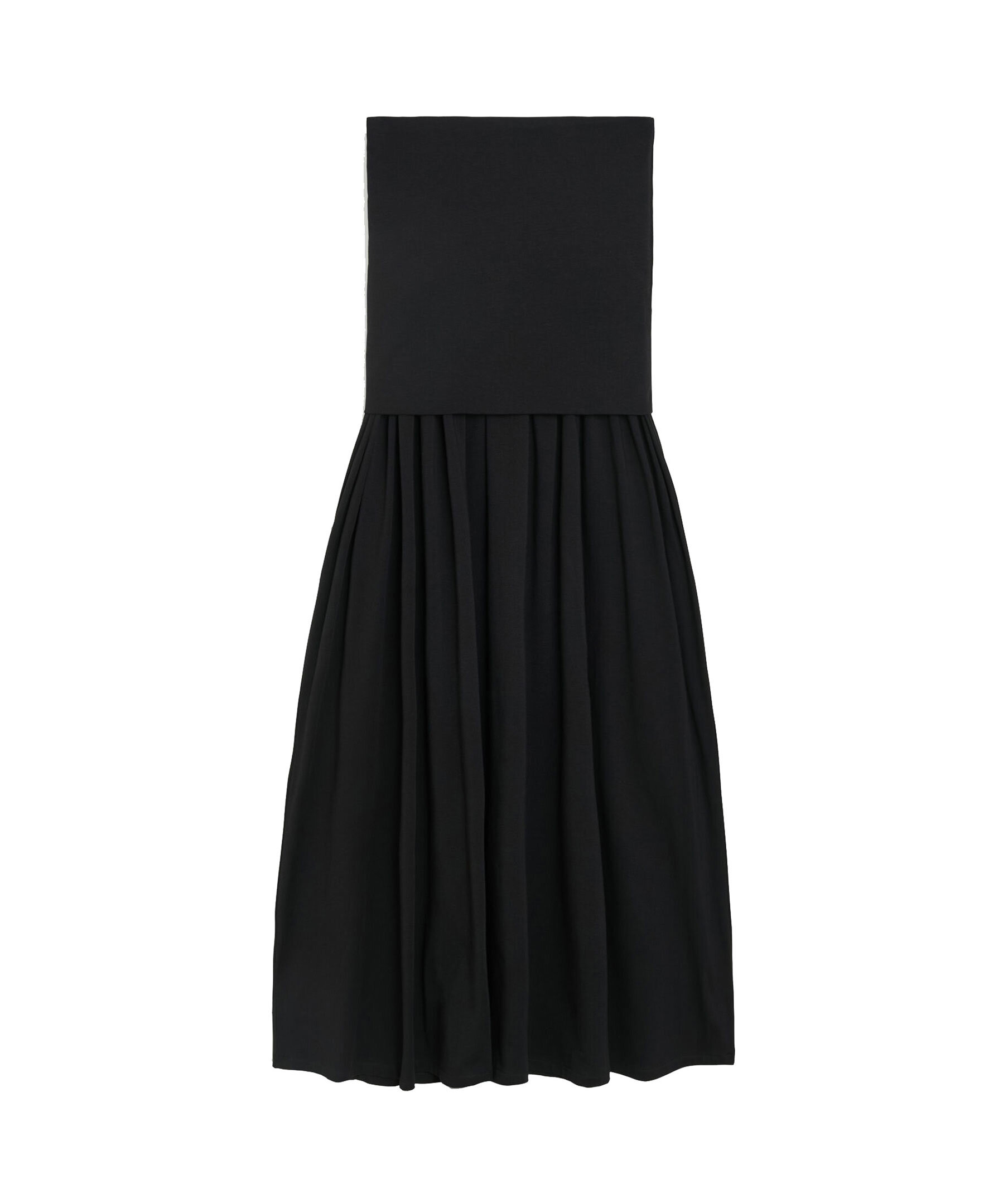 Svart klänning från By Malene Birger. Denna maxiklänning har en svart tajtare elastisk överdel, följt av en lösare lite draperad underdel. Tillverkad av en bomullsblandning.