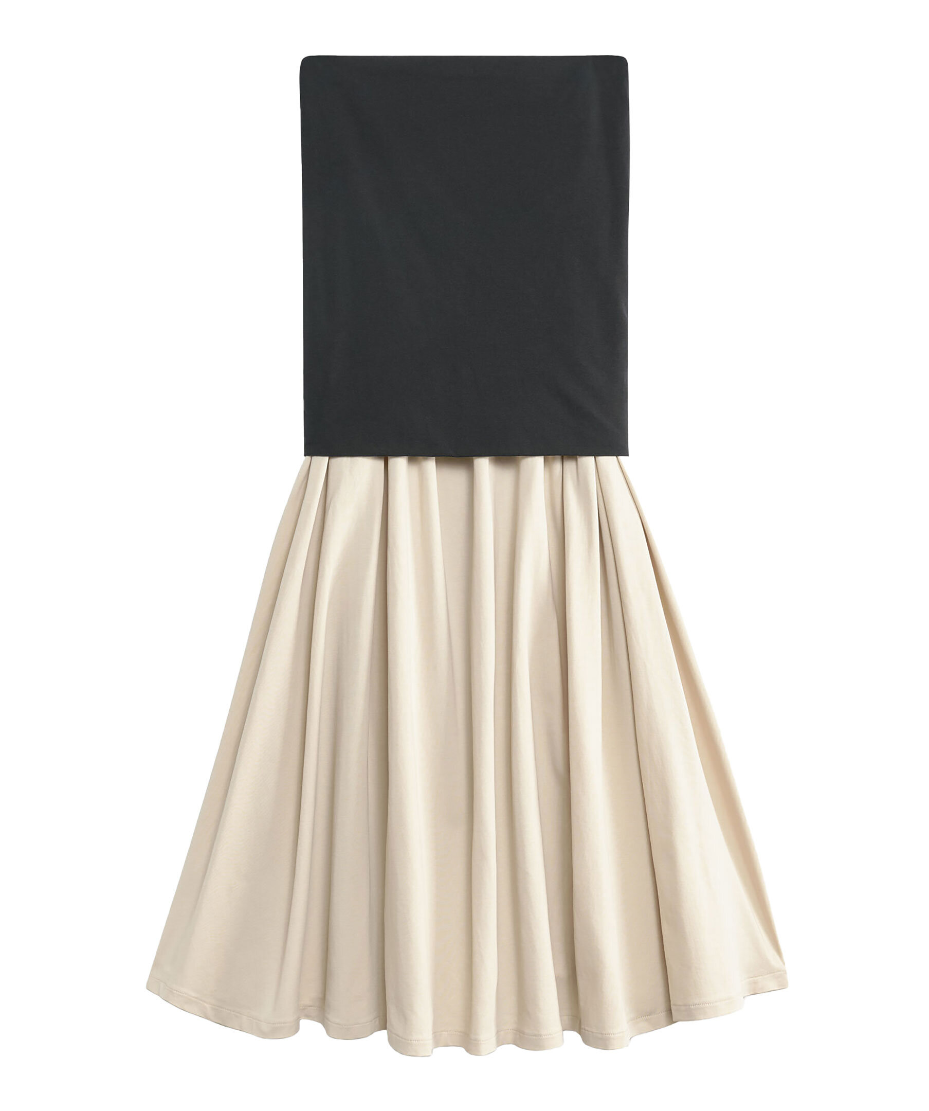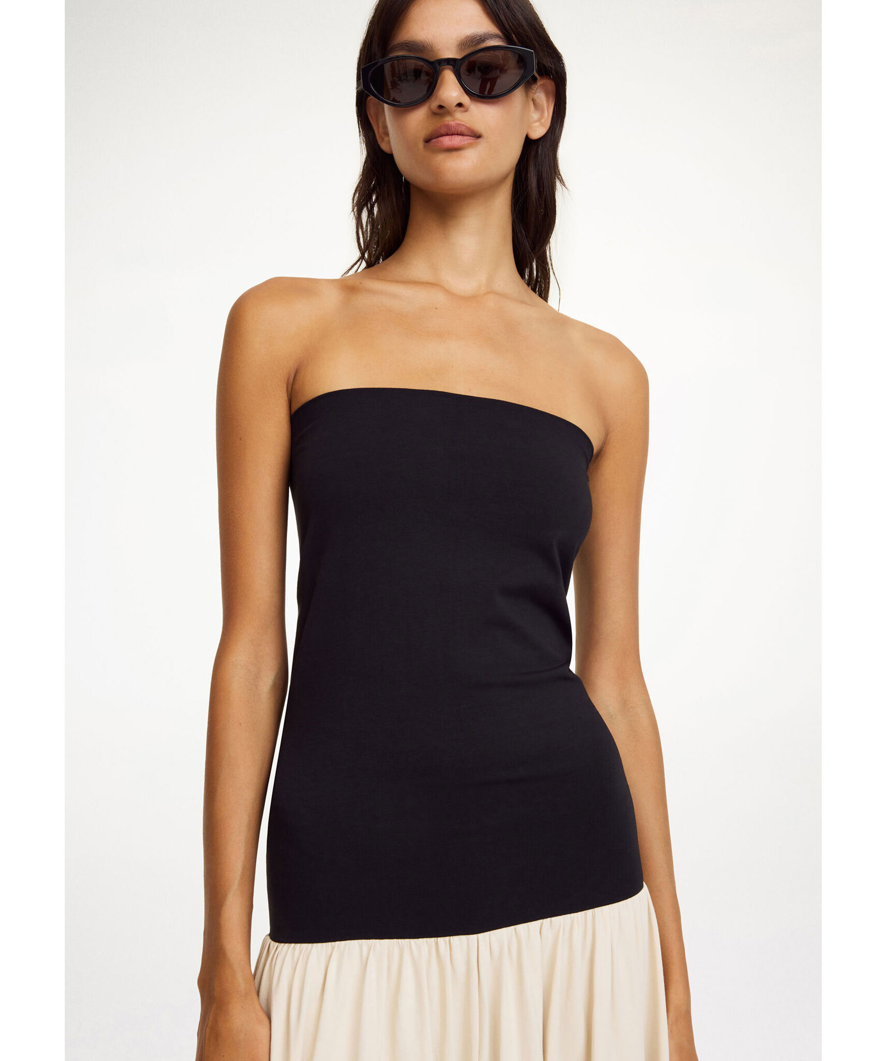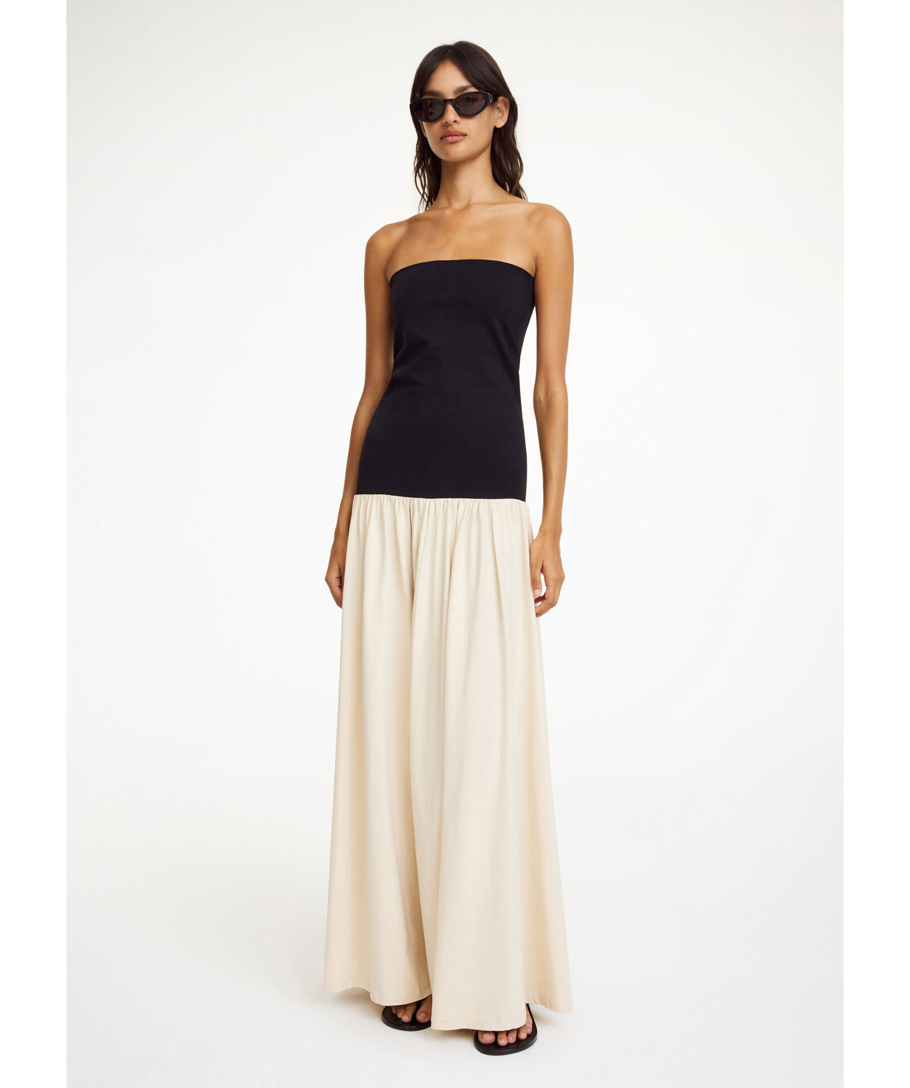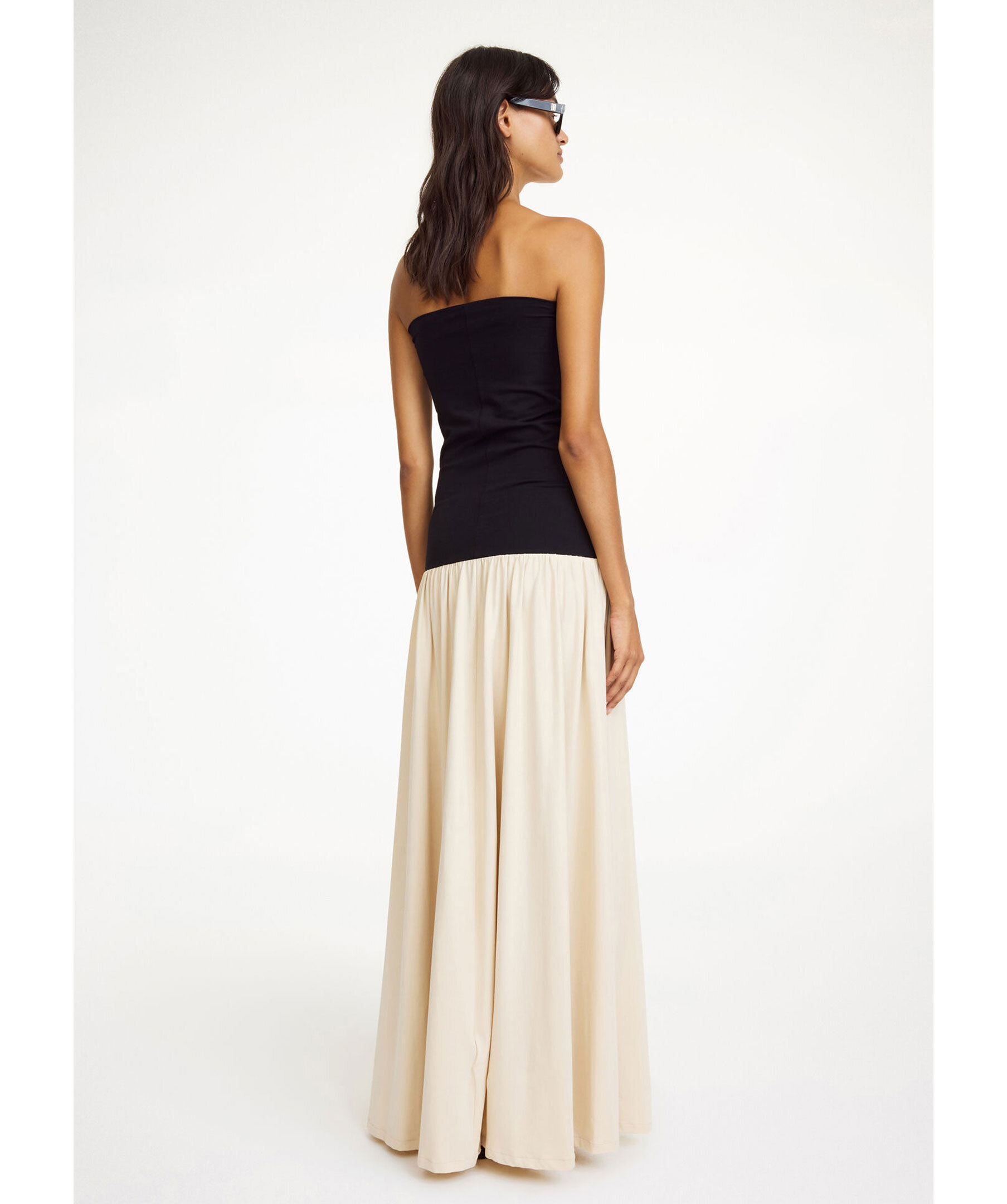 Svart och beige klänning från By Malene Birger. Denna maxiklänning har en svart tajtare elastisk överdel, följt av en beige lösare lite draperad underdel. Tillverkad av en bomullsblandning.