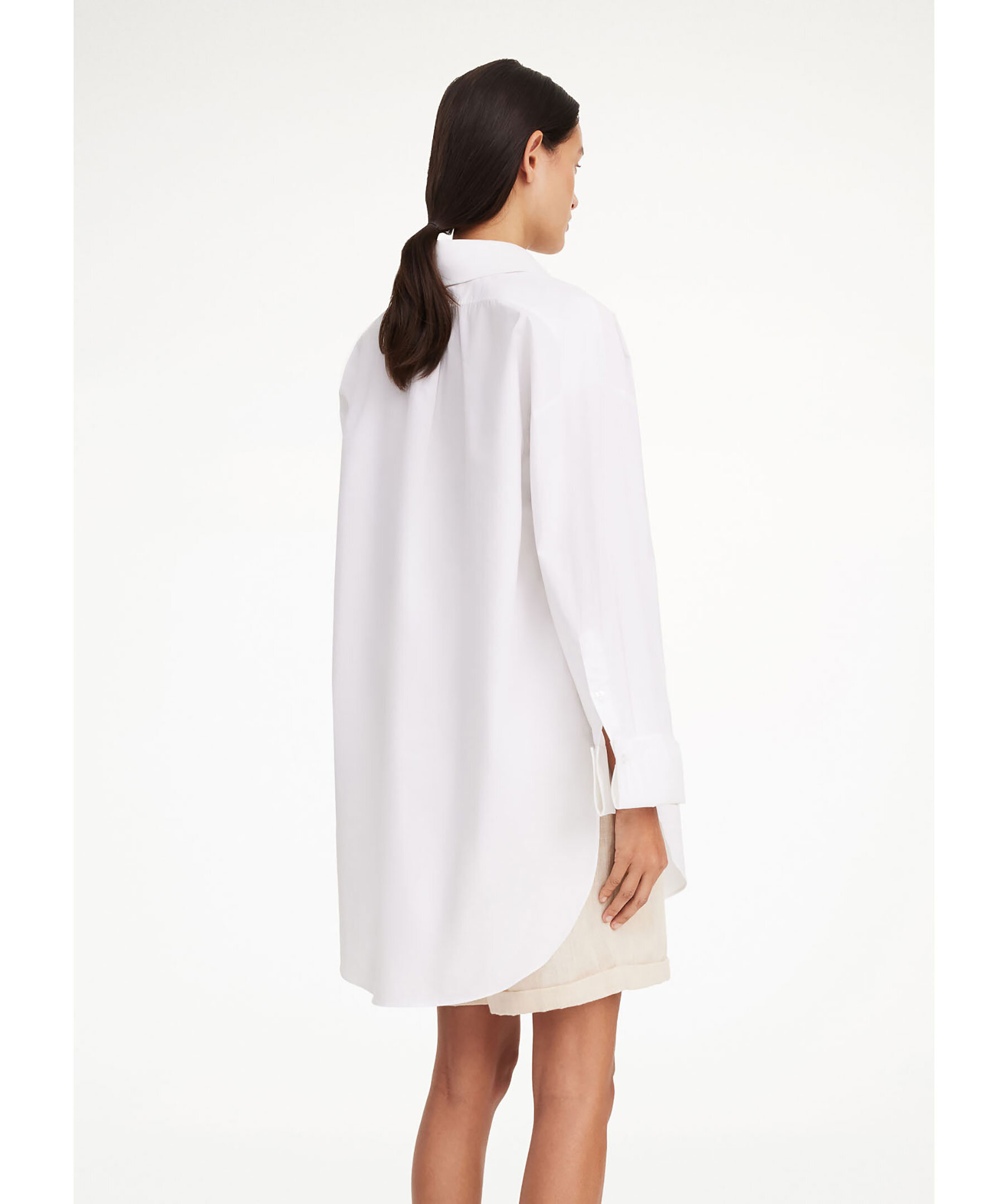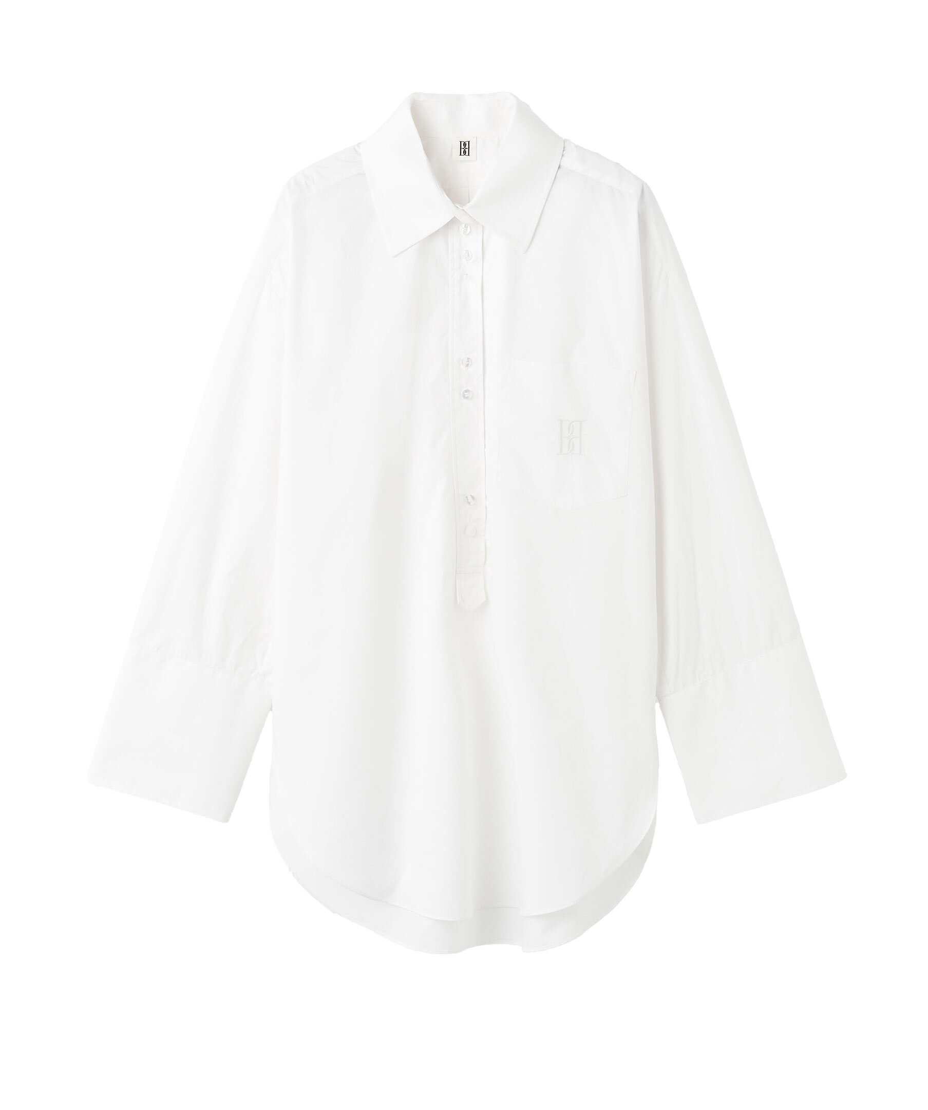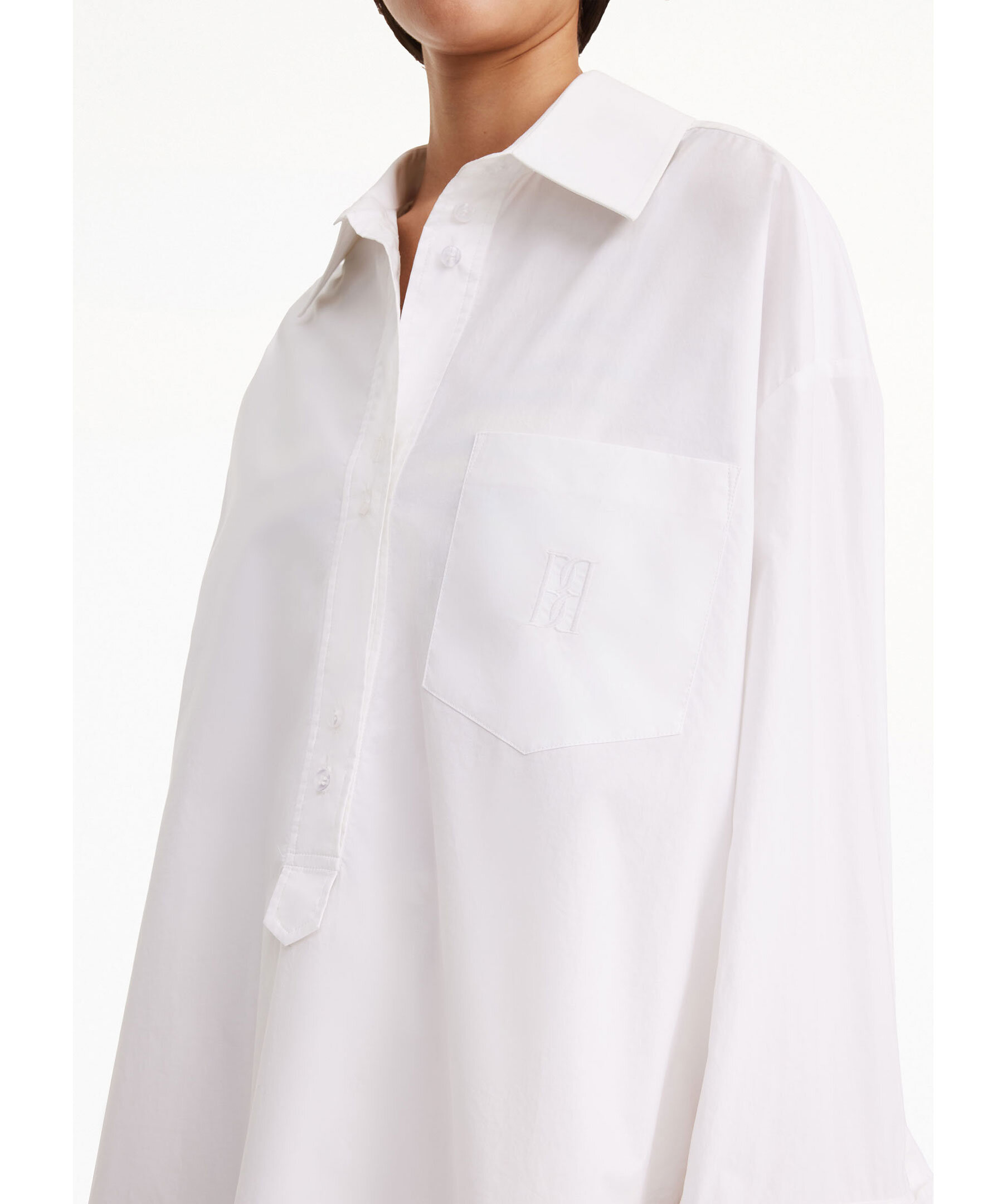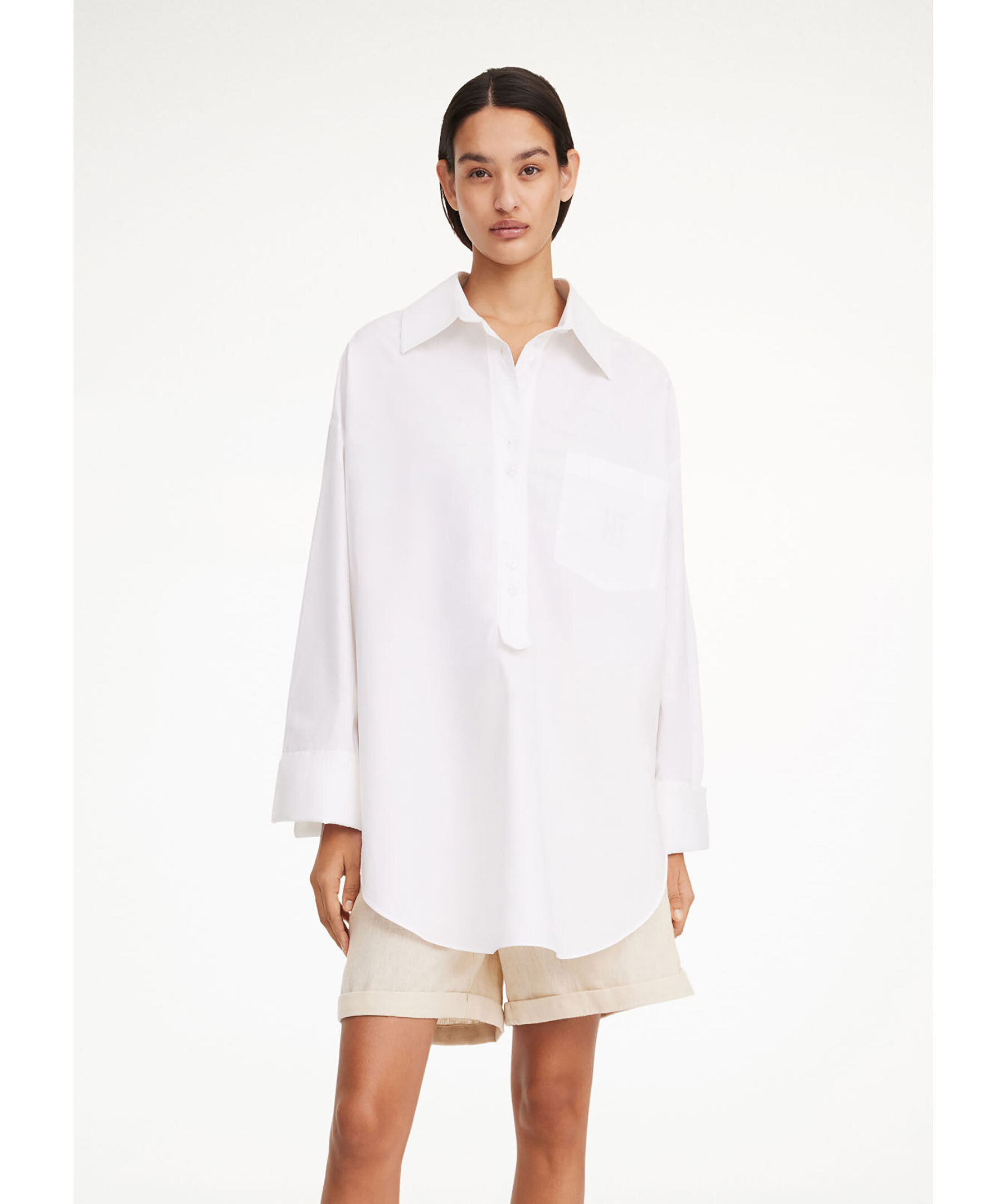 Vit skjorta från By Malene birger. Tunikastil med knappstängning, breda manschetter och en framficka. Den broderade monogramdetaljen ger en extra touch till den rena silhuetten. Den oversized passformen tillsammans med de rundade fållarna och breda manschetterna gör den både bekväm och elegant.
