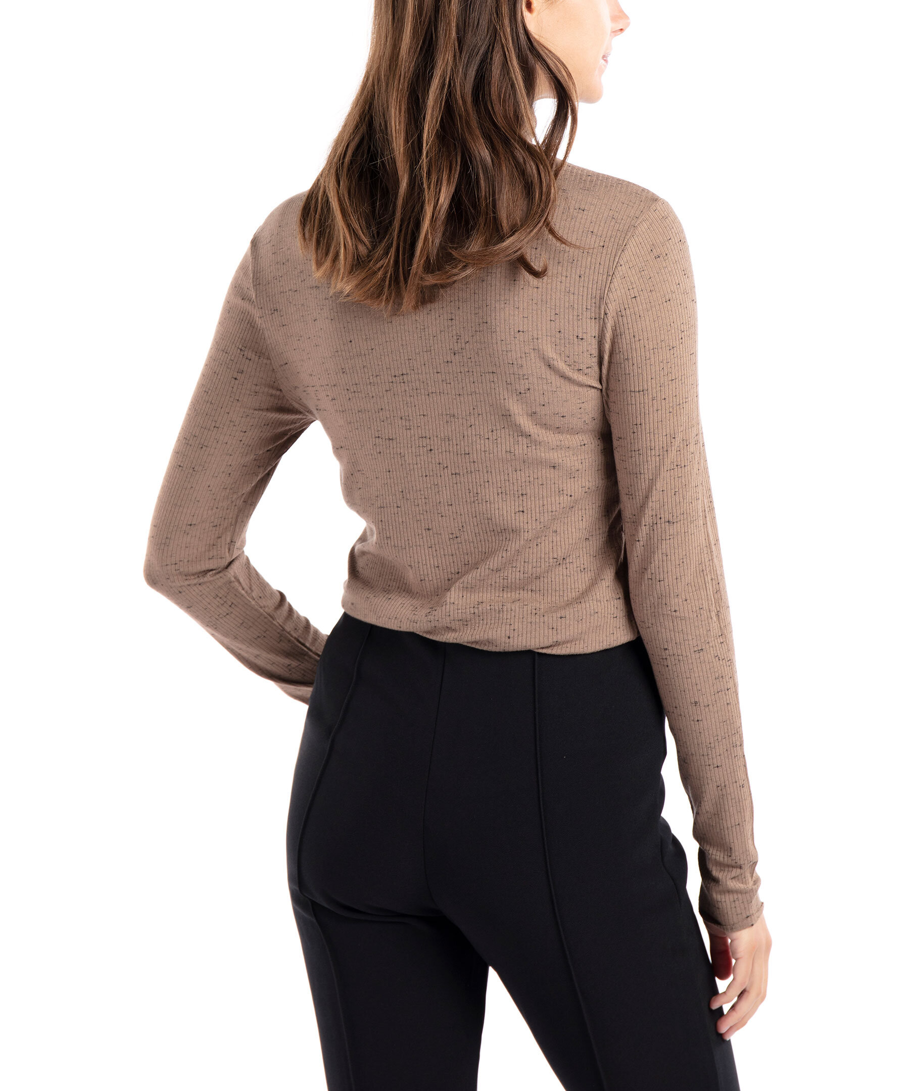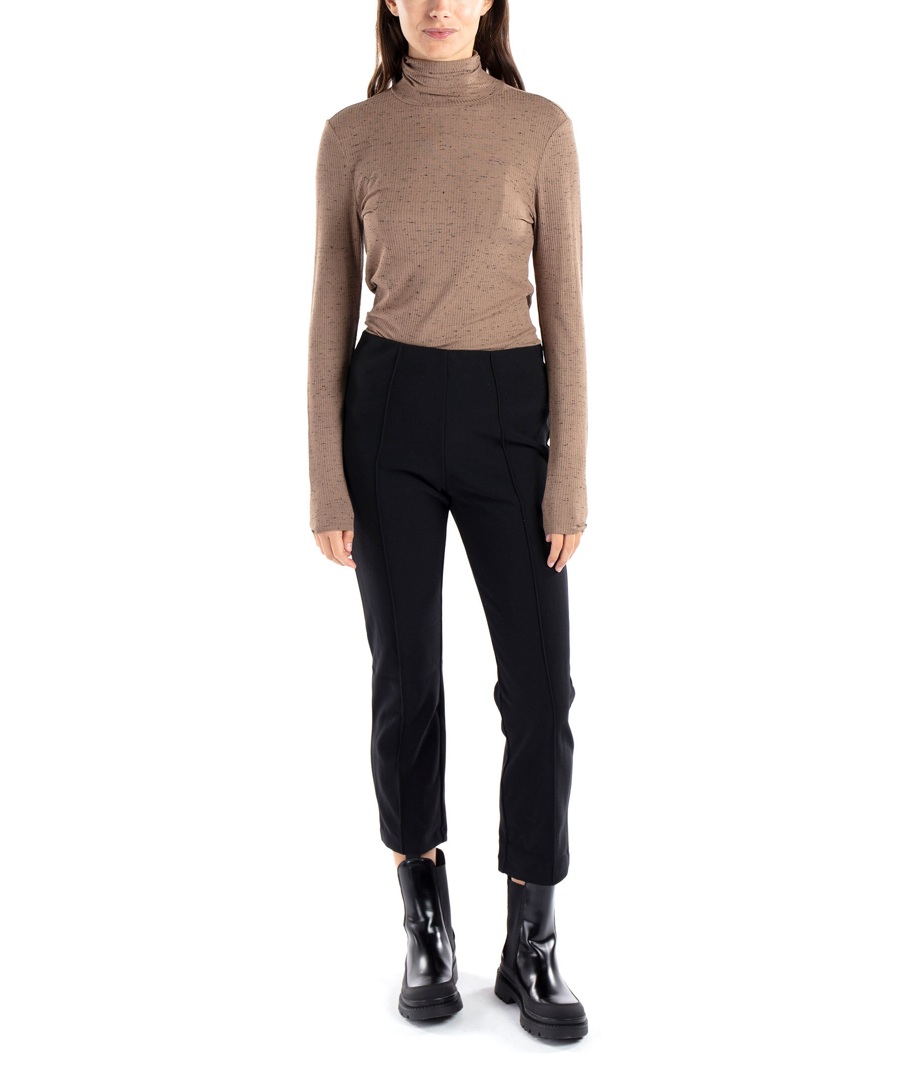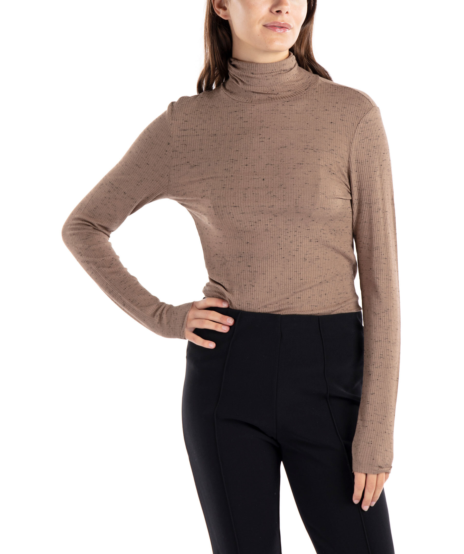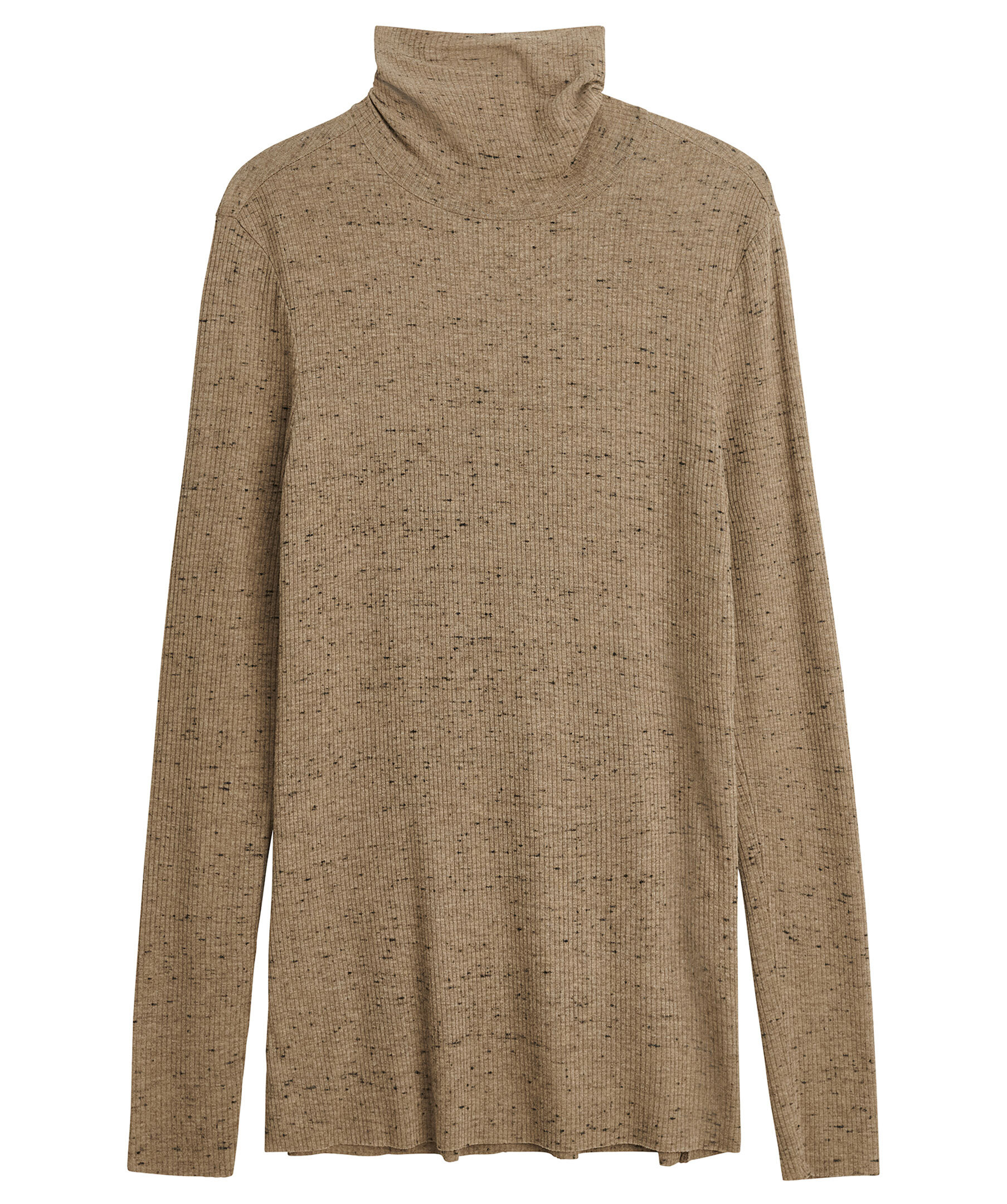 Beige tun polotröja i en smal passform från By Malene Birger. Tröjan är gjord i en ribbad viskosblandning. Spräckligt mönster. Modellen är 178cm lång och har på sig storlek S.