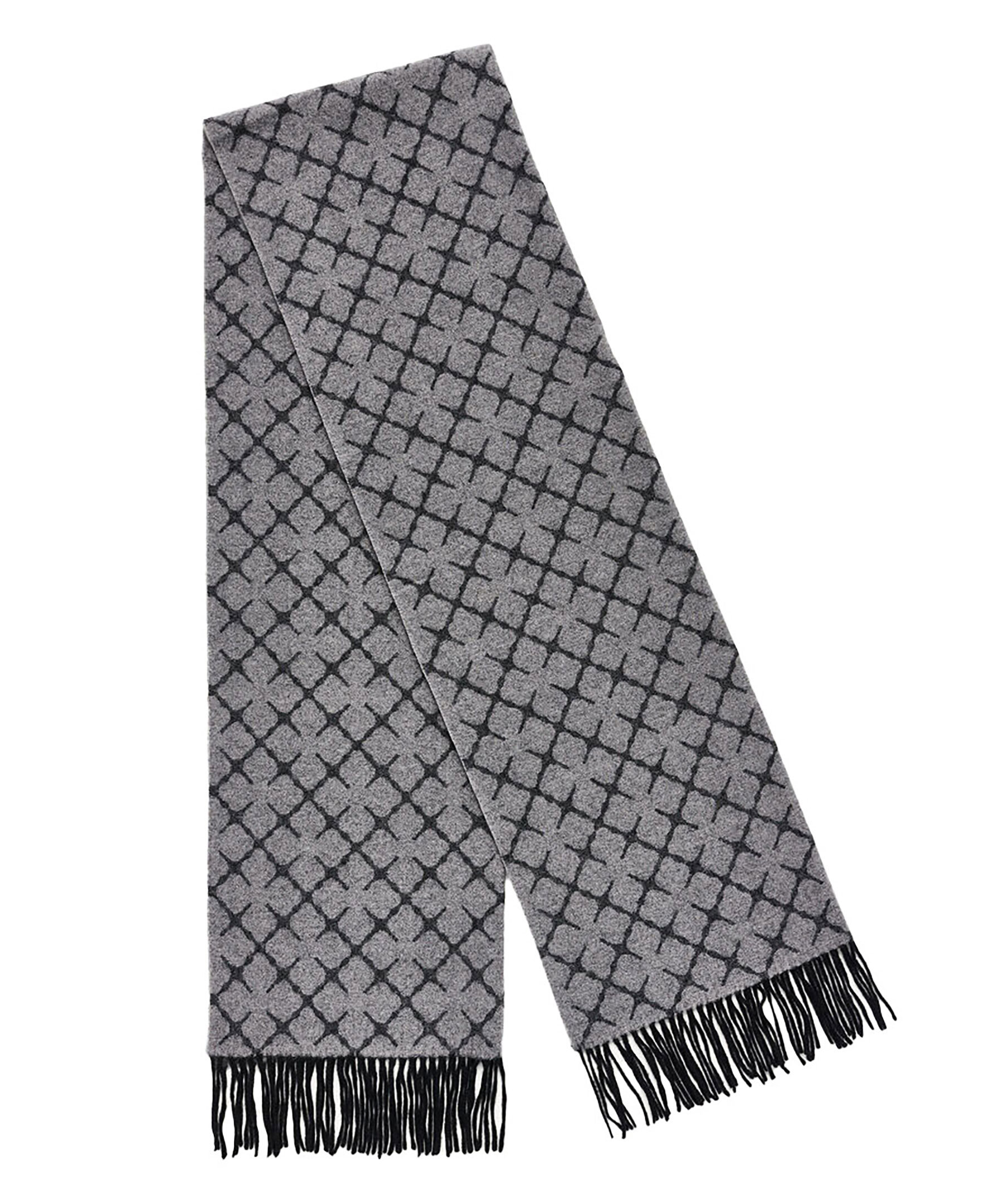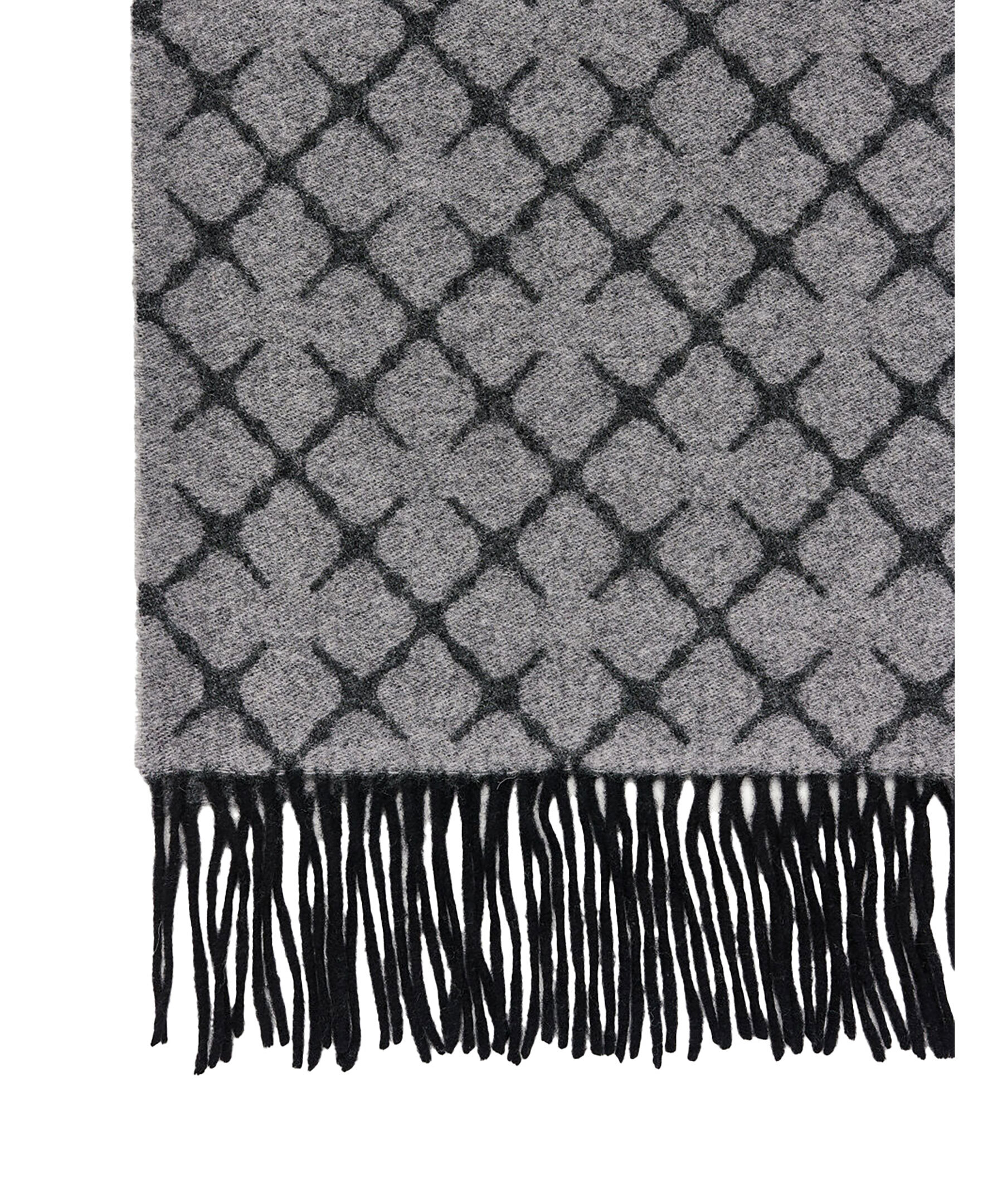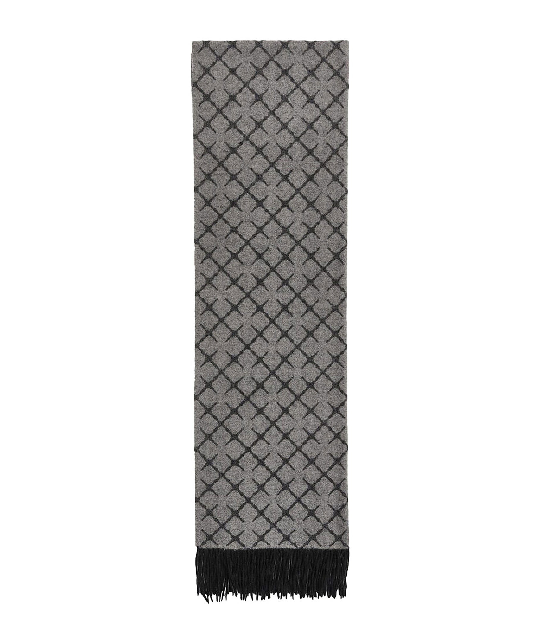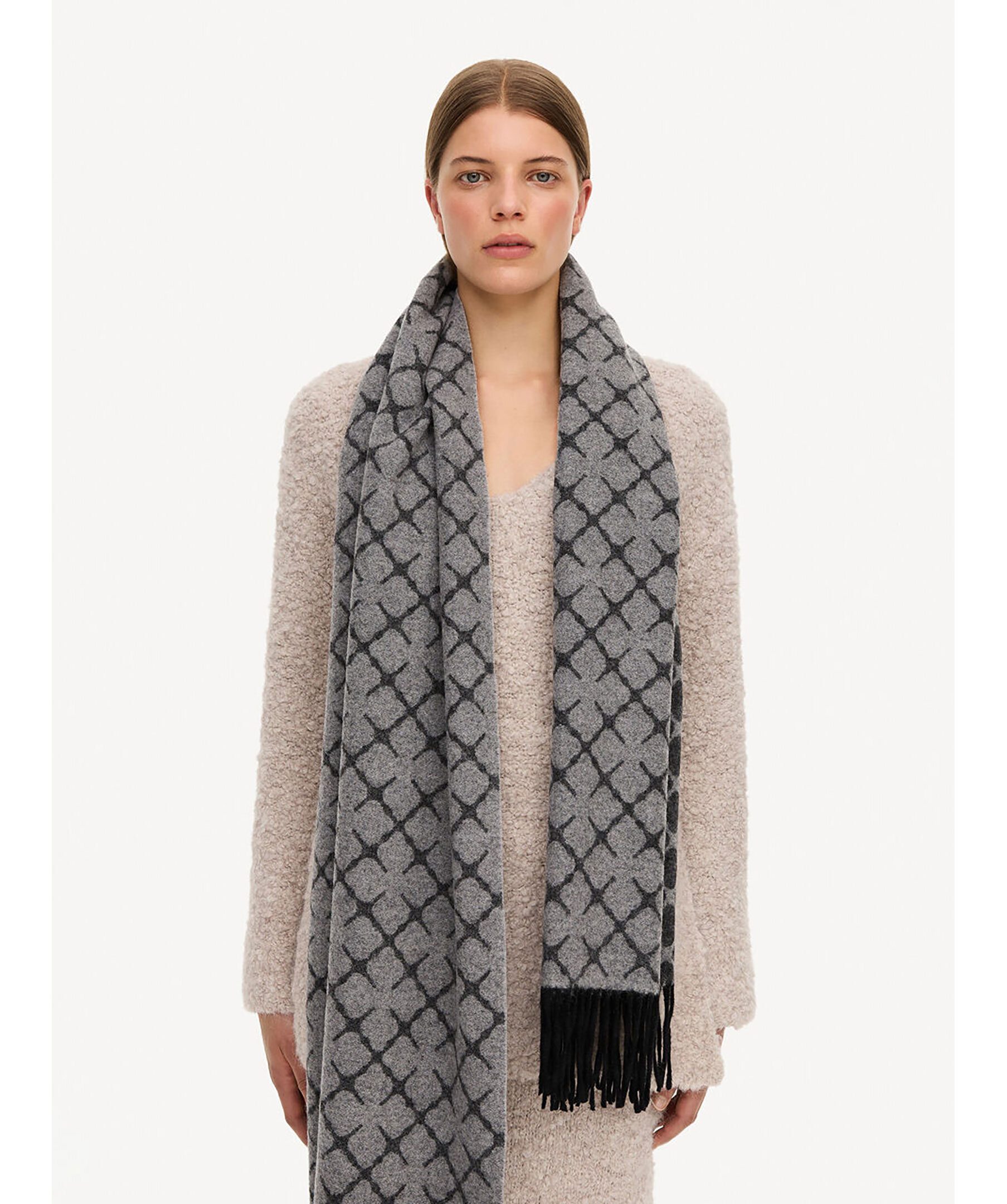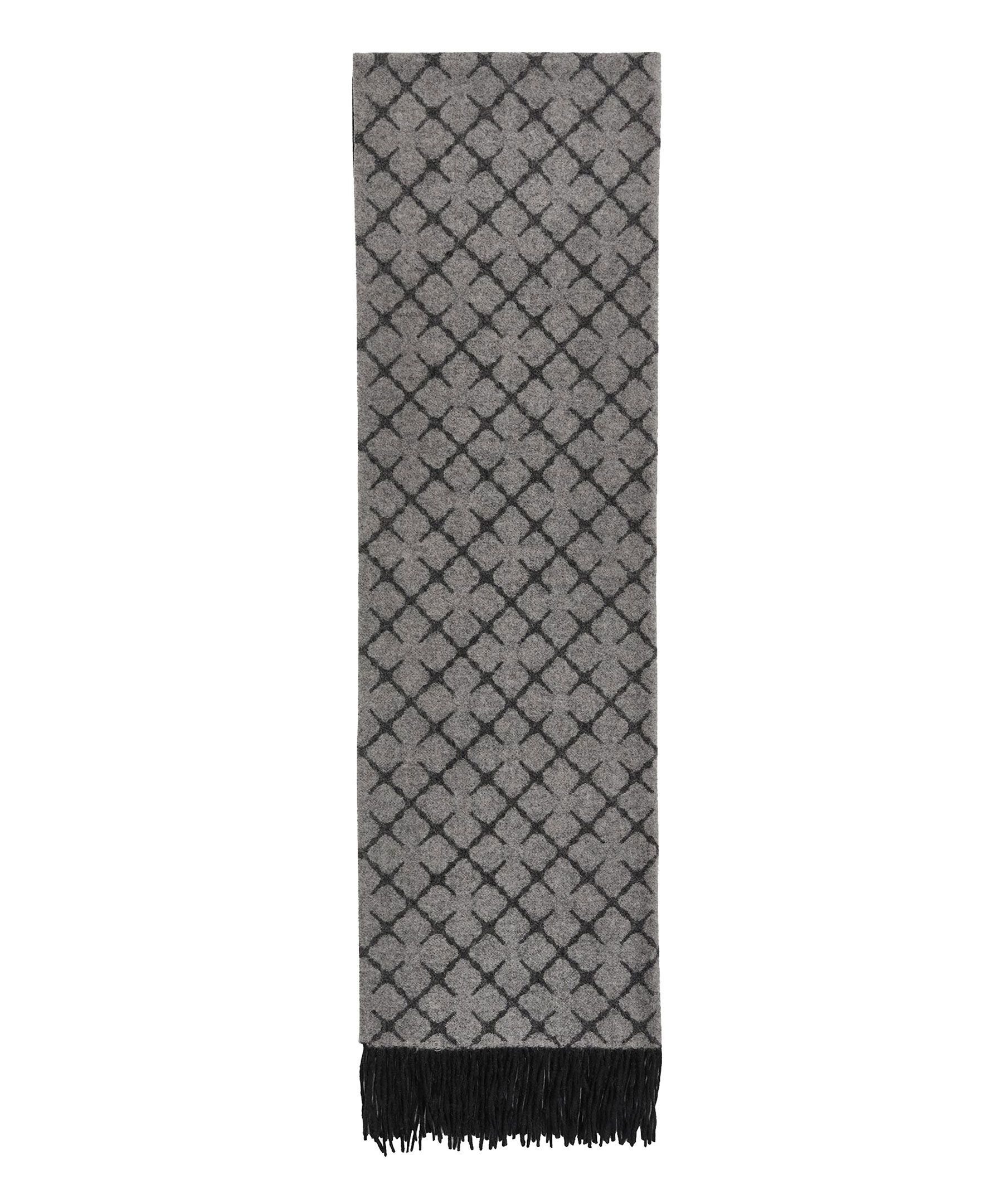 Mörkgrå och ljusgrå, lång halsduk från by Malene Birger. Tillverkad i kashmirblandning och är gjord för att hålla dig varm och se elegant ut under kalla dagar. Fransar i kanterna och mönstrat med by Malene Birgers Signatur blommotiv. Mått: 60 x 200 cm.