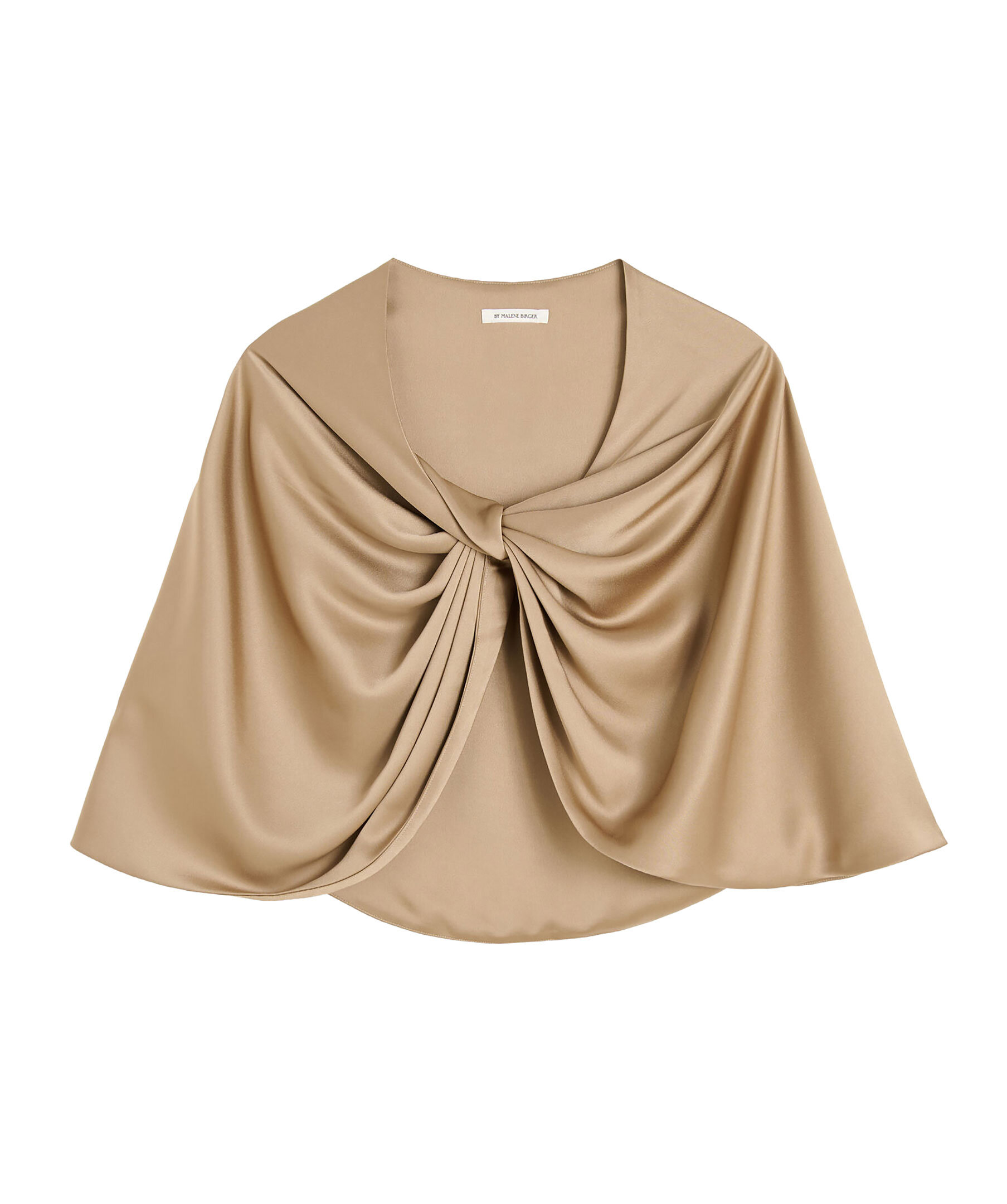 Mörkbeige silkcape från By Malene Birger. Den bohemiska Pinlos-kapen är tillverkad i glänsande satin och har en omlottdetalj som går att bära centrerad eller över ena axeln beroende på vad du har på dig under.