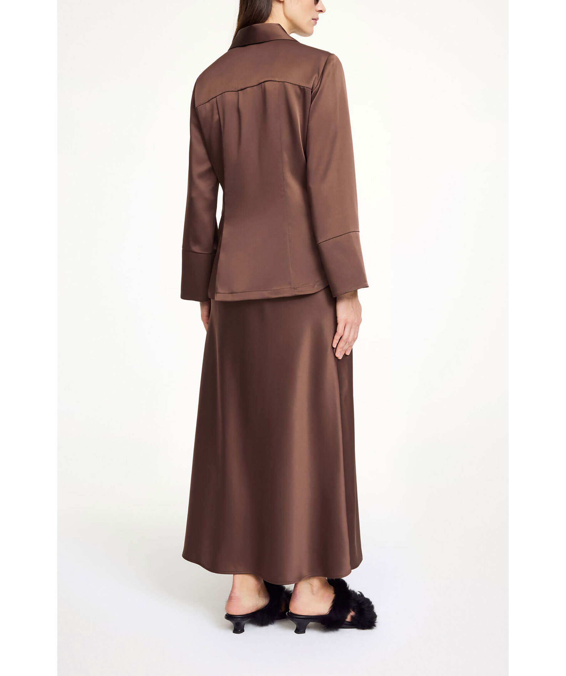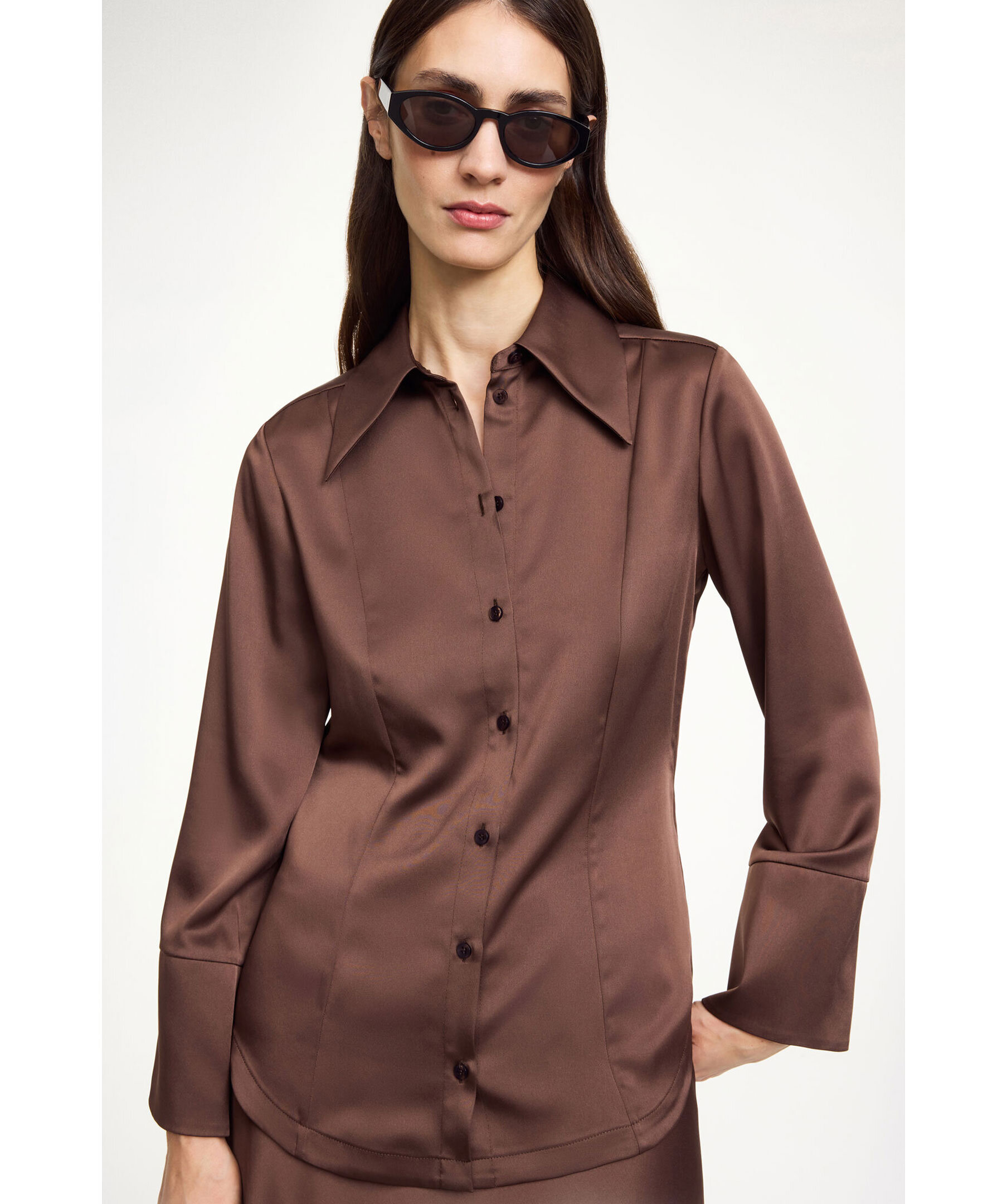 Brun skjorta i satintyg från By Malene Birger. Skjortan har en figursydd passform och breda manschetter.