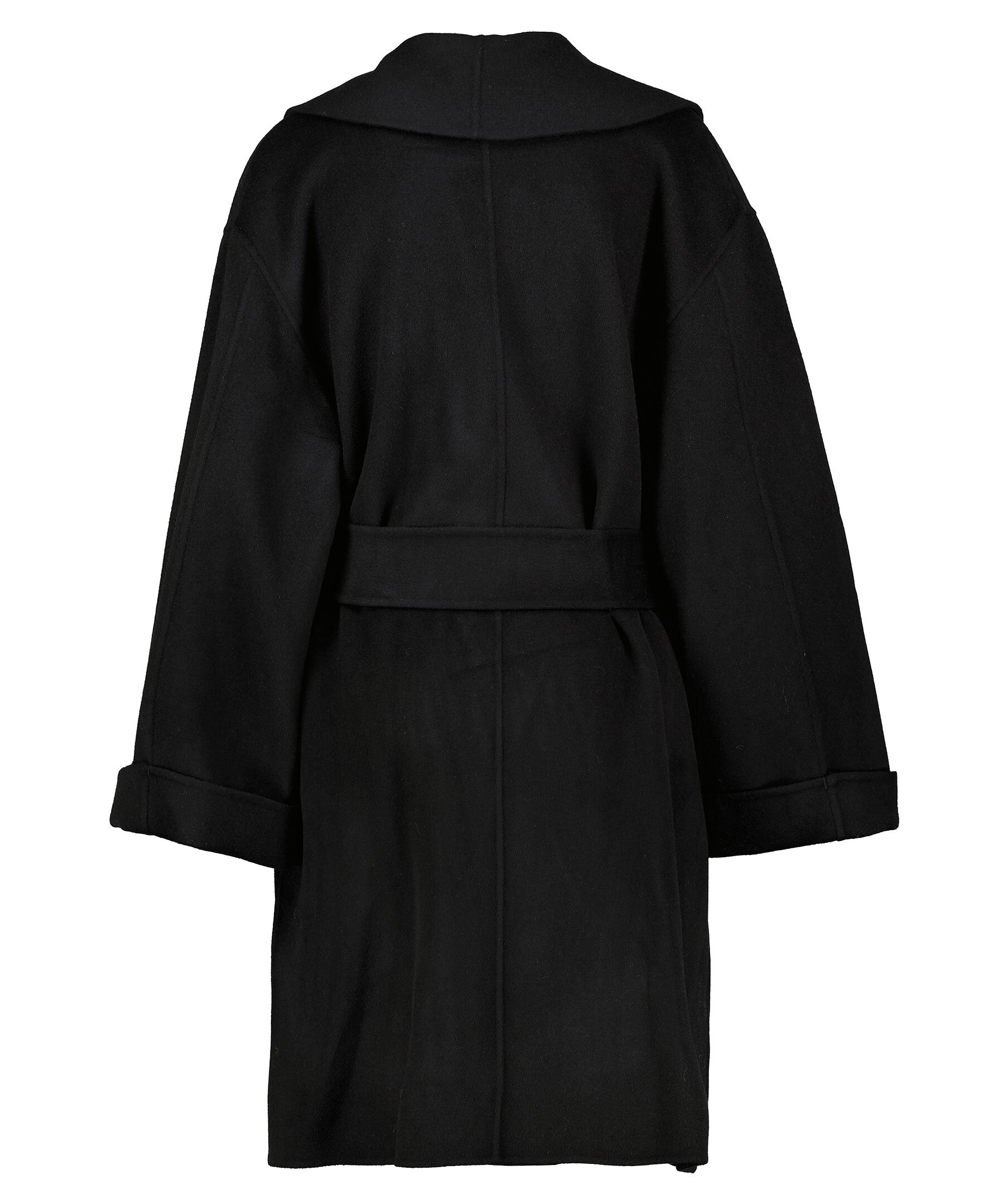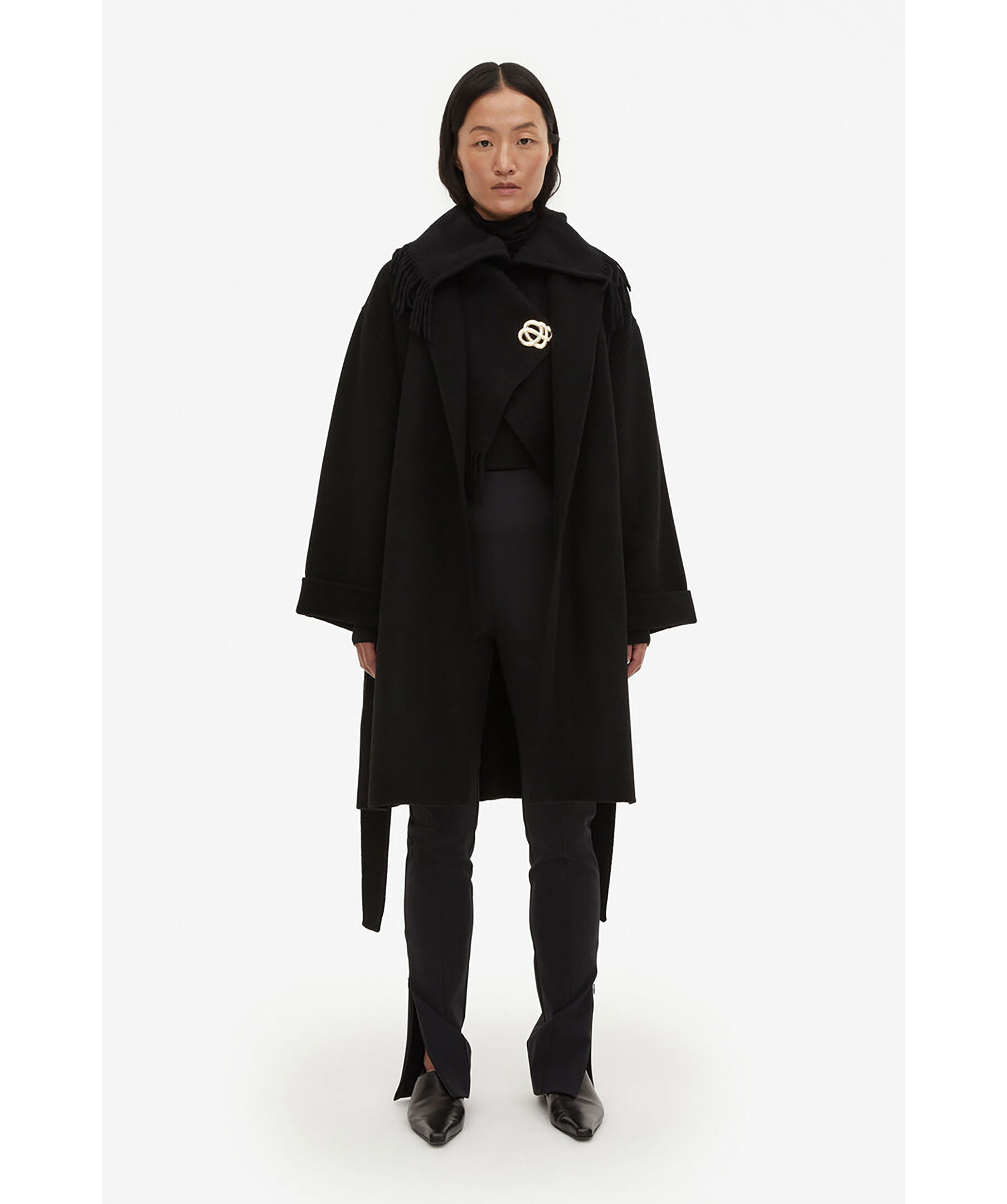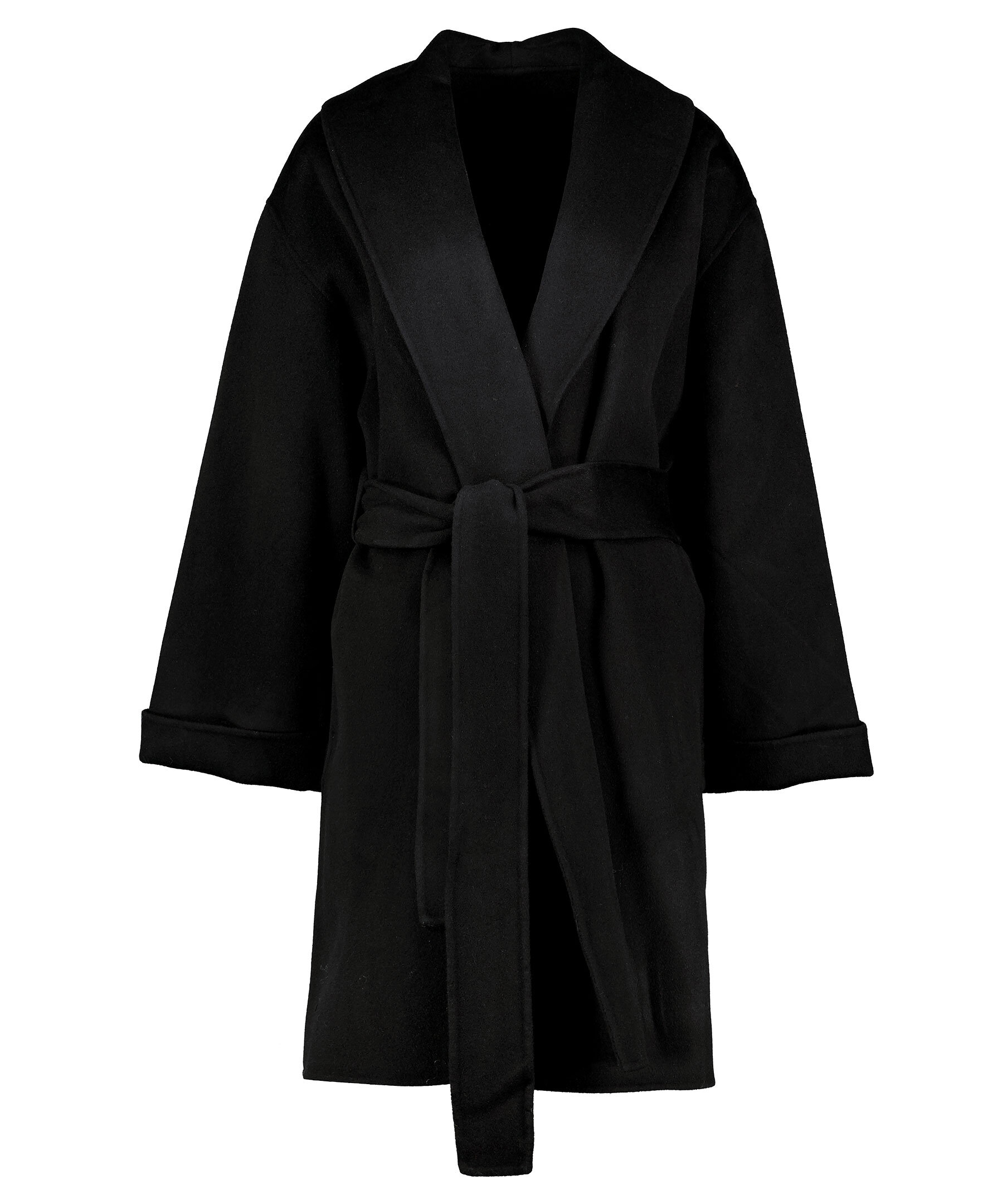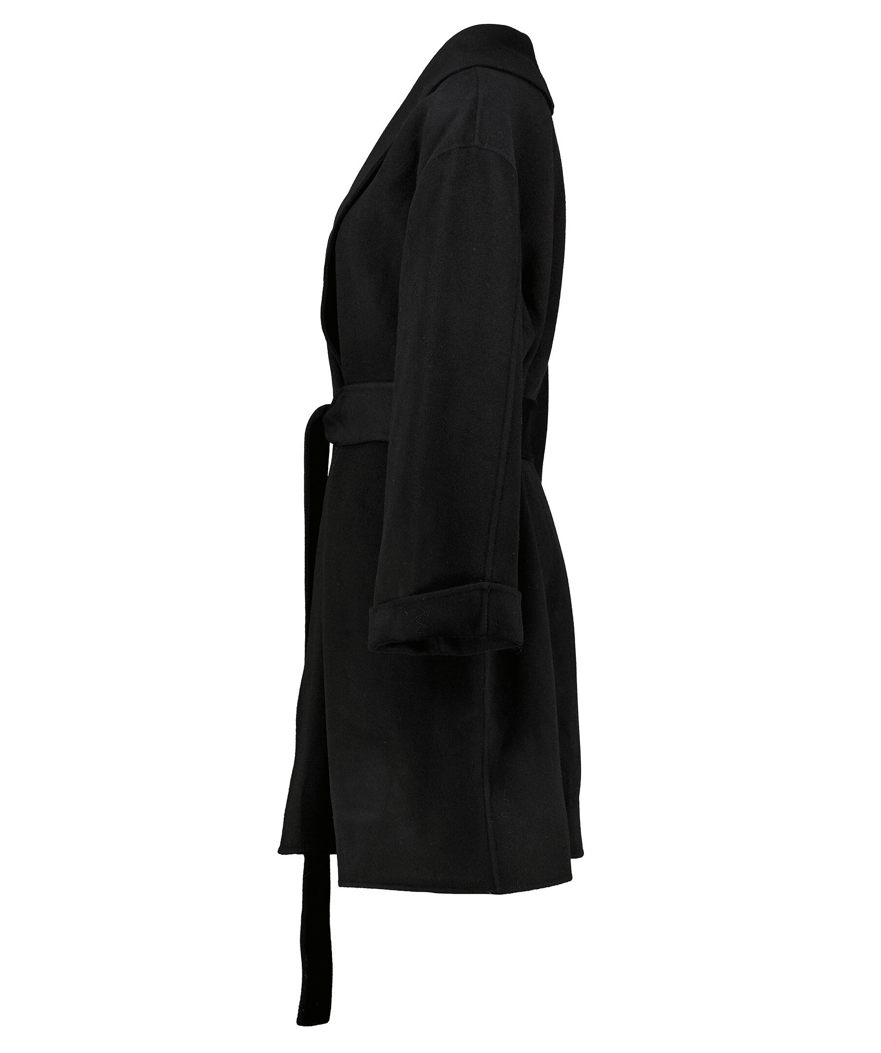Svart kappa från By Malene Birger. Omlott modell med stora slag som stängs med bälte i midja. Två fickor framtill. Avslappnad passform, vi rekommenderar att ta en storlek mindre än vanligt. Tillverkad i 100% Ull.