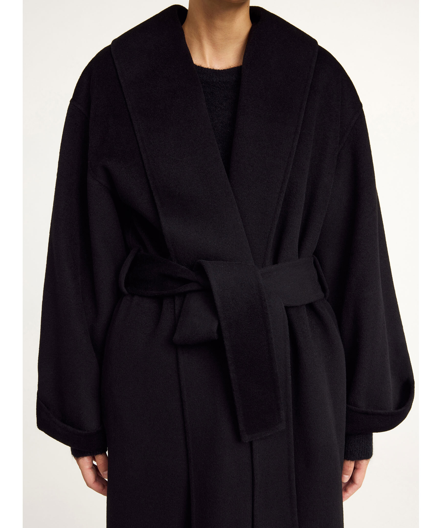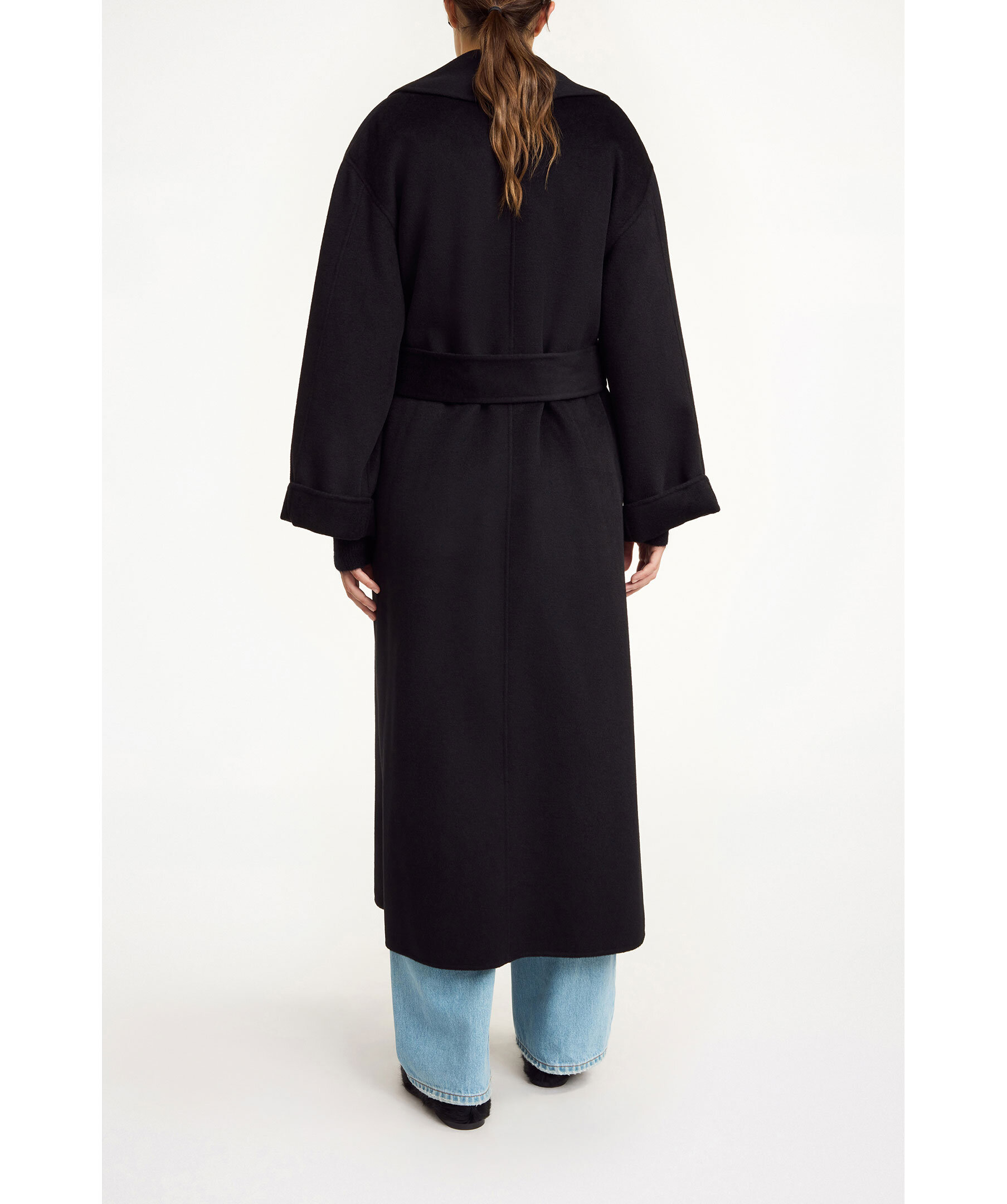 Svart, lång kappa från By Malene Birger. Avslappnad passform, två sidfickor och bälte i midjan. Kappan har en subtil sjalkrage. Tillverkad i 100% ull.