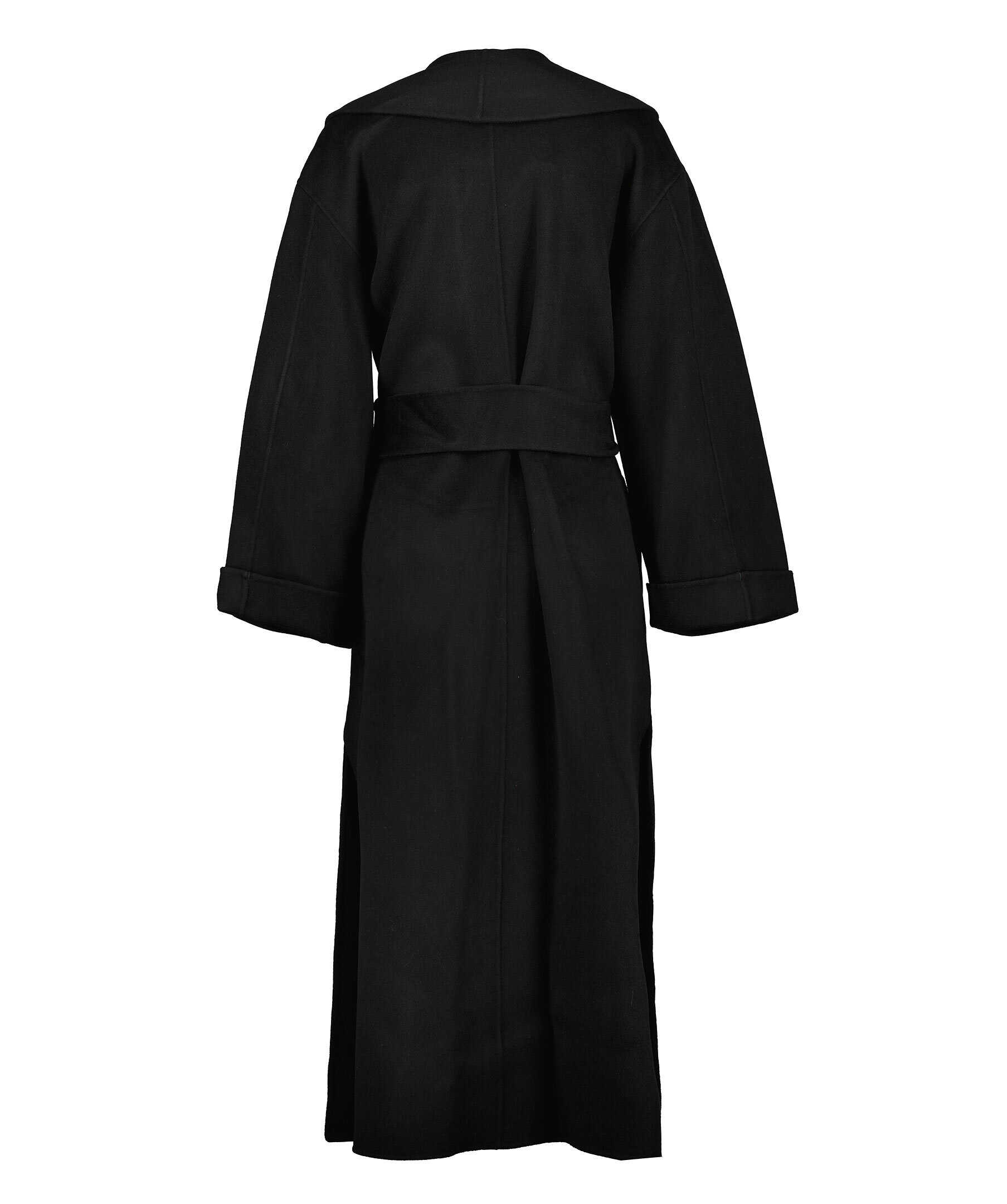 Svart, lång kappa från By Malene Birger. Tillverkad i 100% ull. Avslappnad passform, två sidfickor och bälte i midjan. Kappan har en subtil sjalkrage.