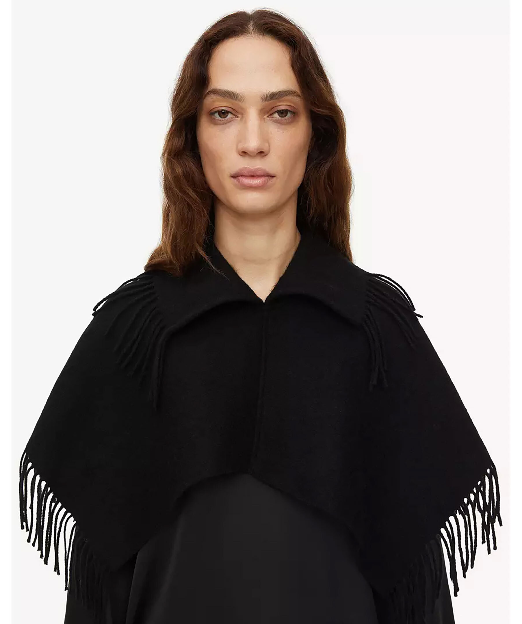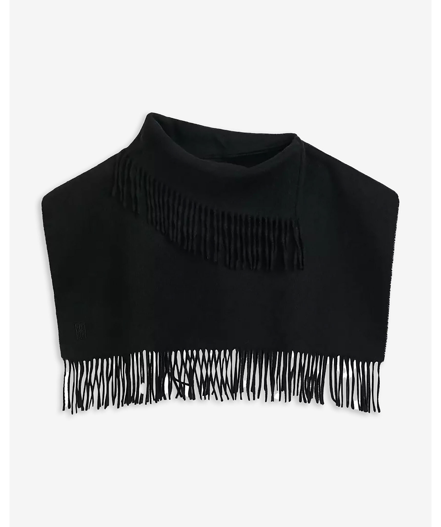 Svart turtleneck från By Malene Birger. Denna accessoar har en bred halsringning och fjäderlätta fransar runt kanten som ger en elegant och lätt bohemisk känsla. Perfekt för att lyfta en minimalistisk outfit — ett statement-plagg som ersätter traditionella halsdukar under höst och vinter. Tillverkad av 100 % ull för värme och mjuk känsla mot huden.