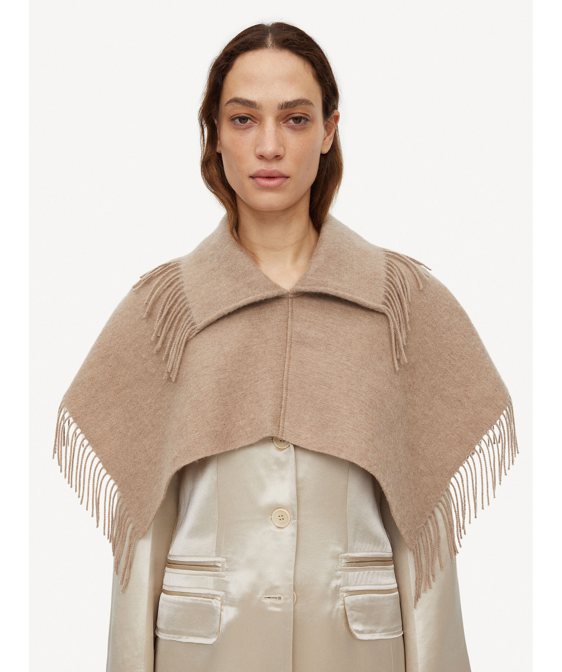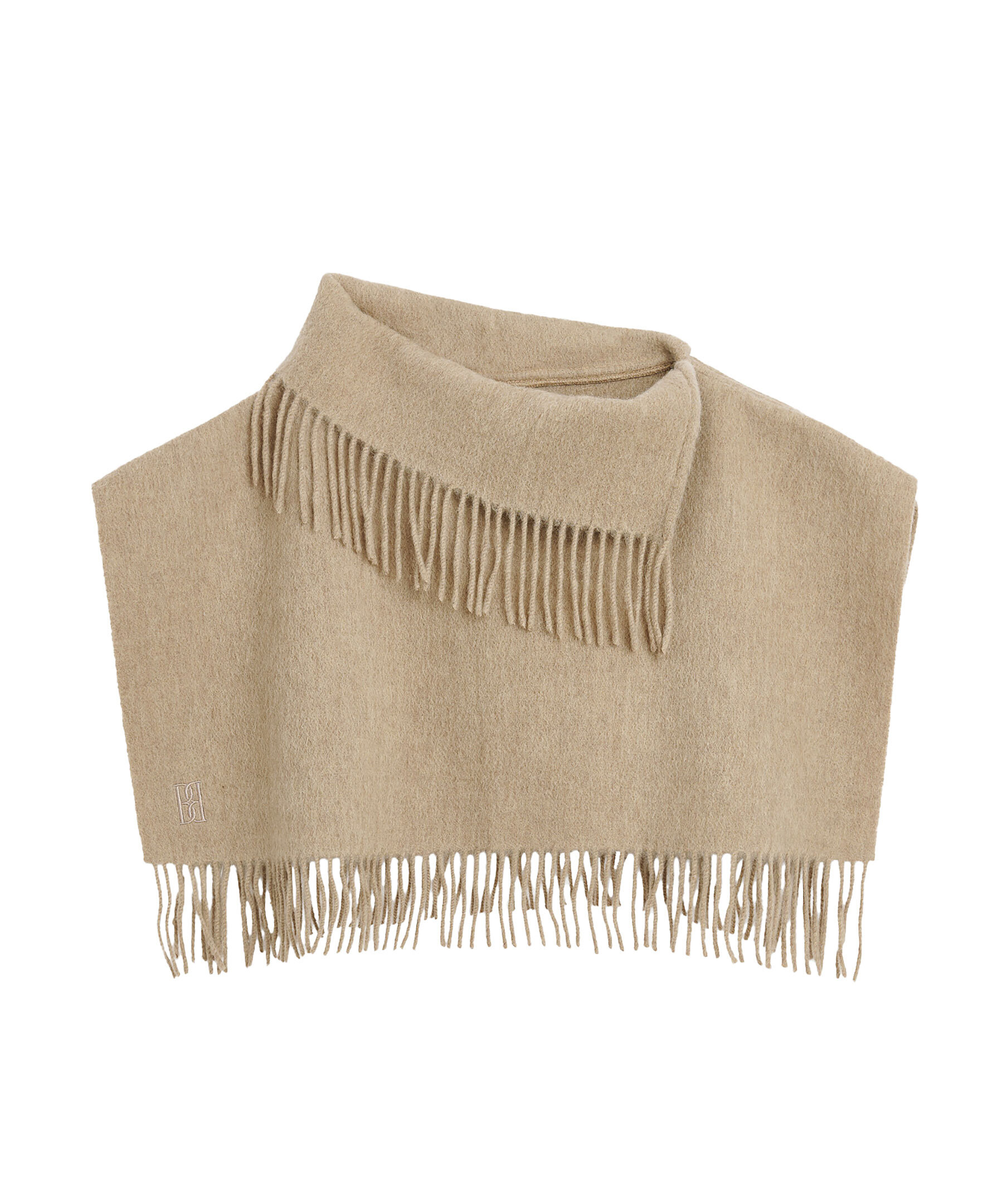 Beige krage som är virad som en halsduk från by Malene Birger. Tillverkad i ull. Fransar i kanterna och träs över huvudet. Broderad ton-i-ron logotyp i nederkant. Mått: 65 x 30cm.