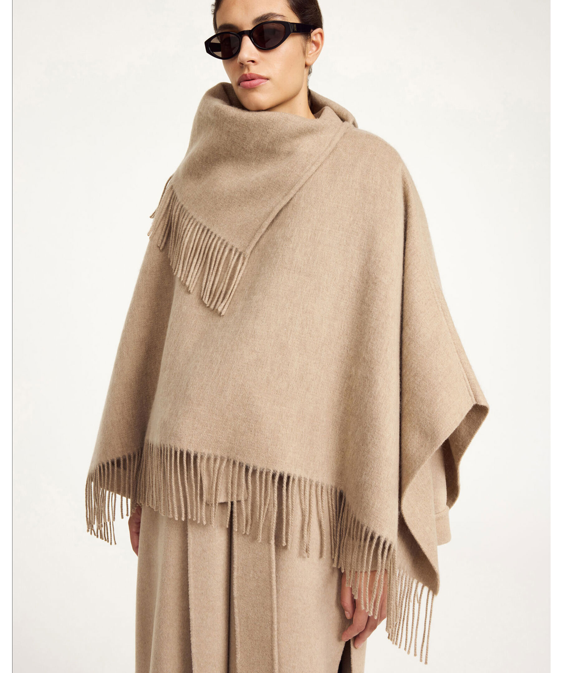 Beige poncho från By Malene Birger. Ponchon knäpps med knappar under armarna och har fransar. Tillverkad i 100% ull.