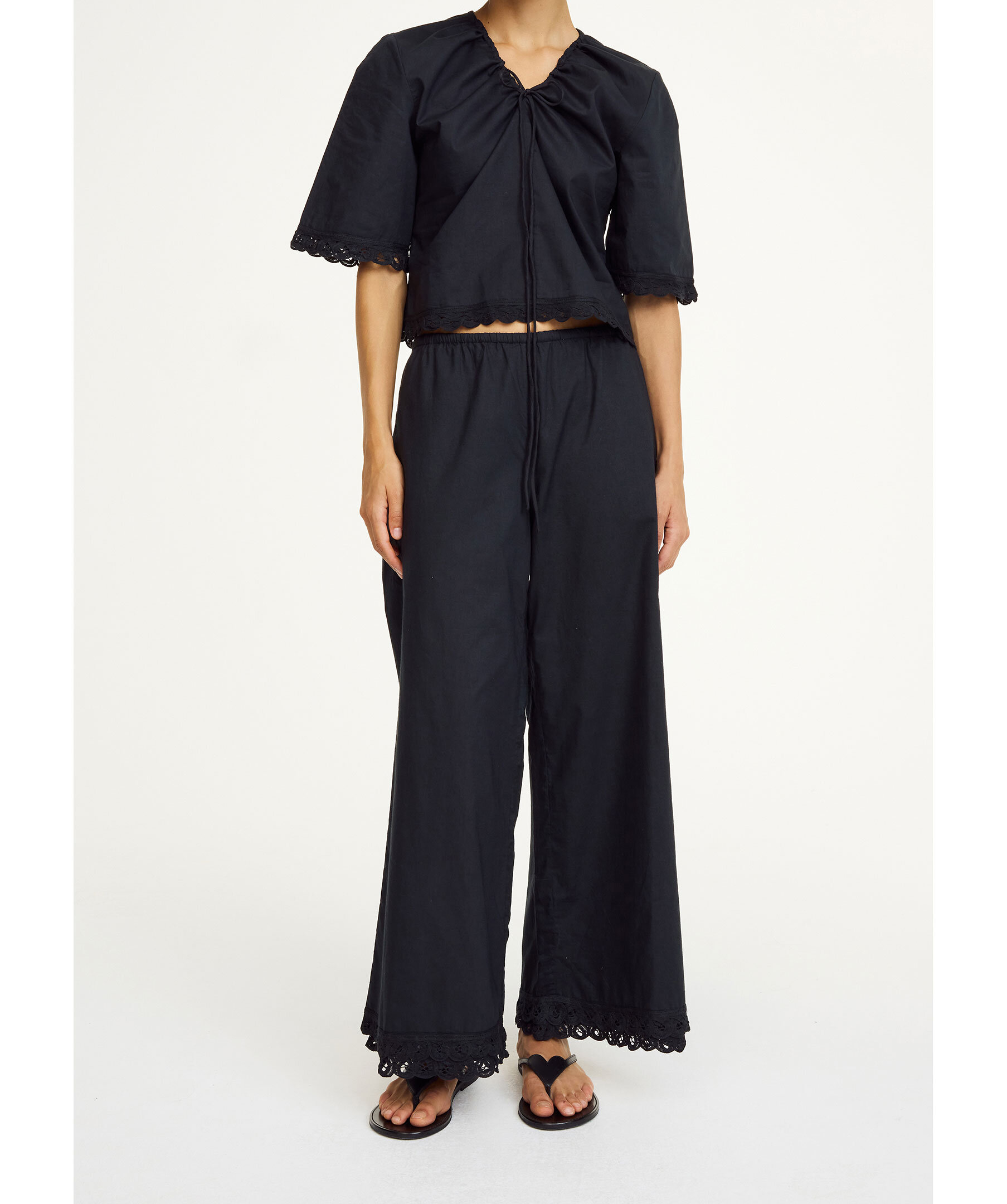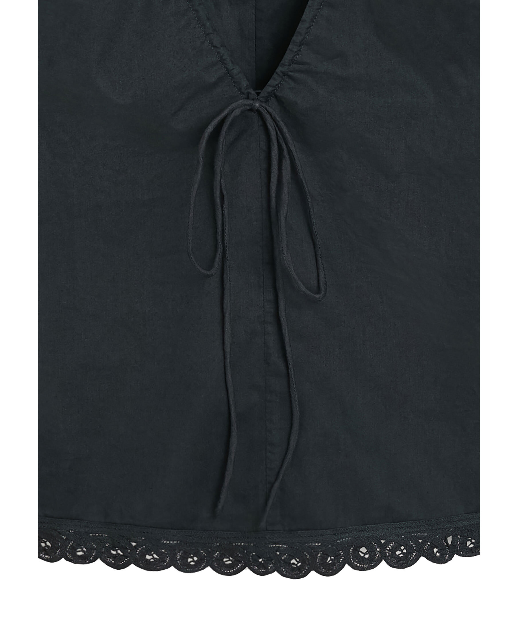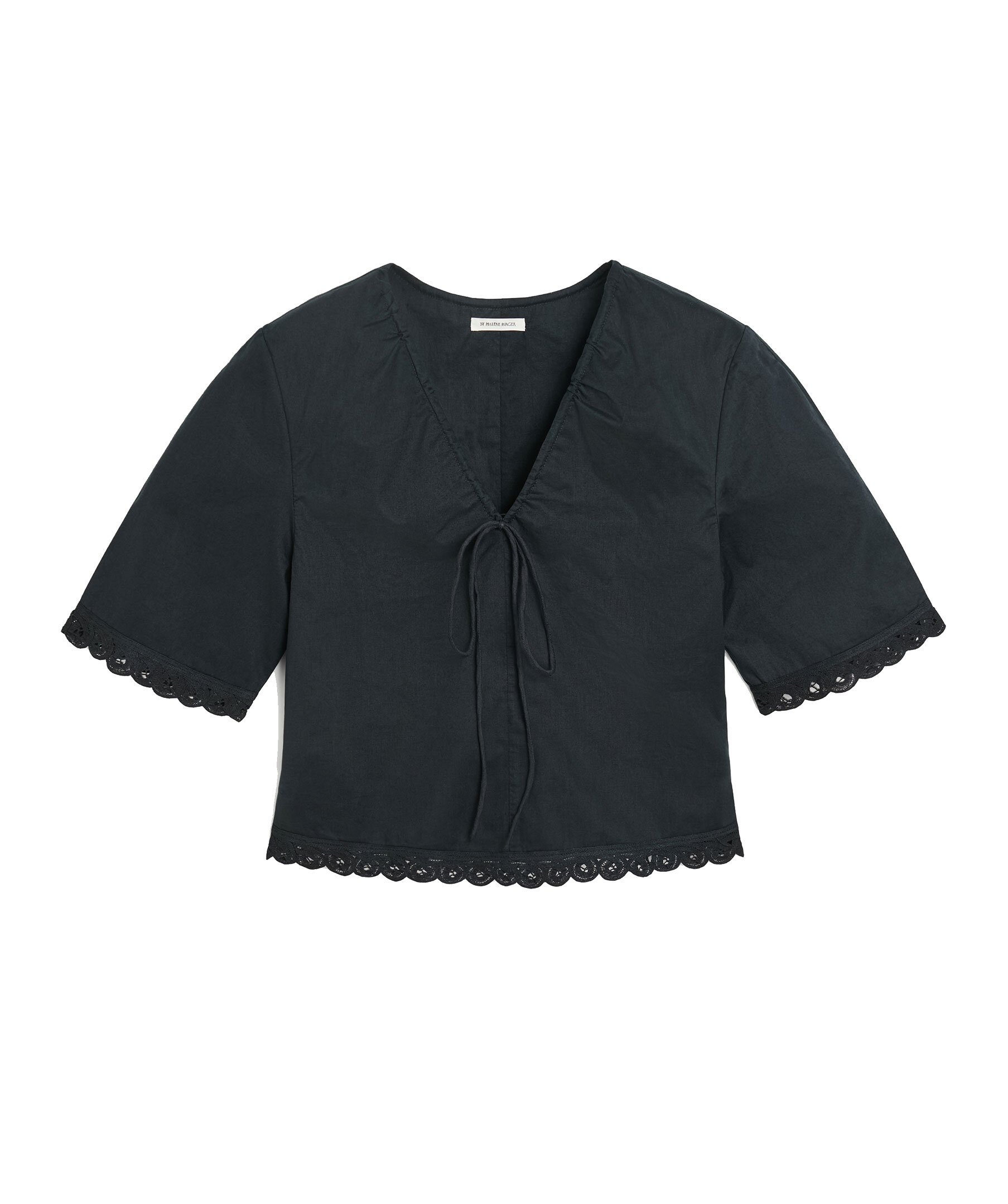 Svart blus från By Malene Birger. Blusen har en justerbar V-ringning med snörning och broderade spetsdetaljer vid ärm- och tröjslut och halvlånga ärmar. Tillverkad av bomull.