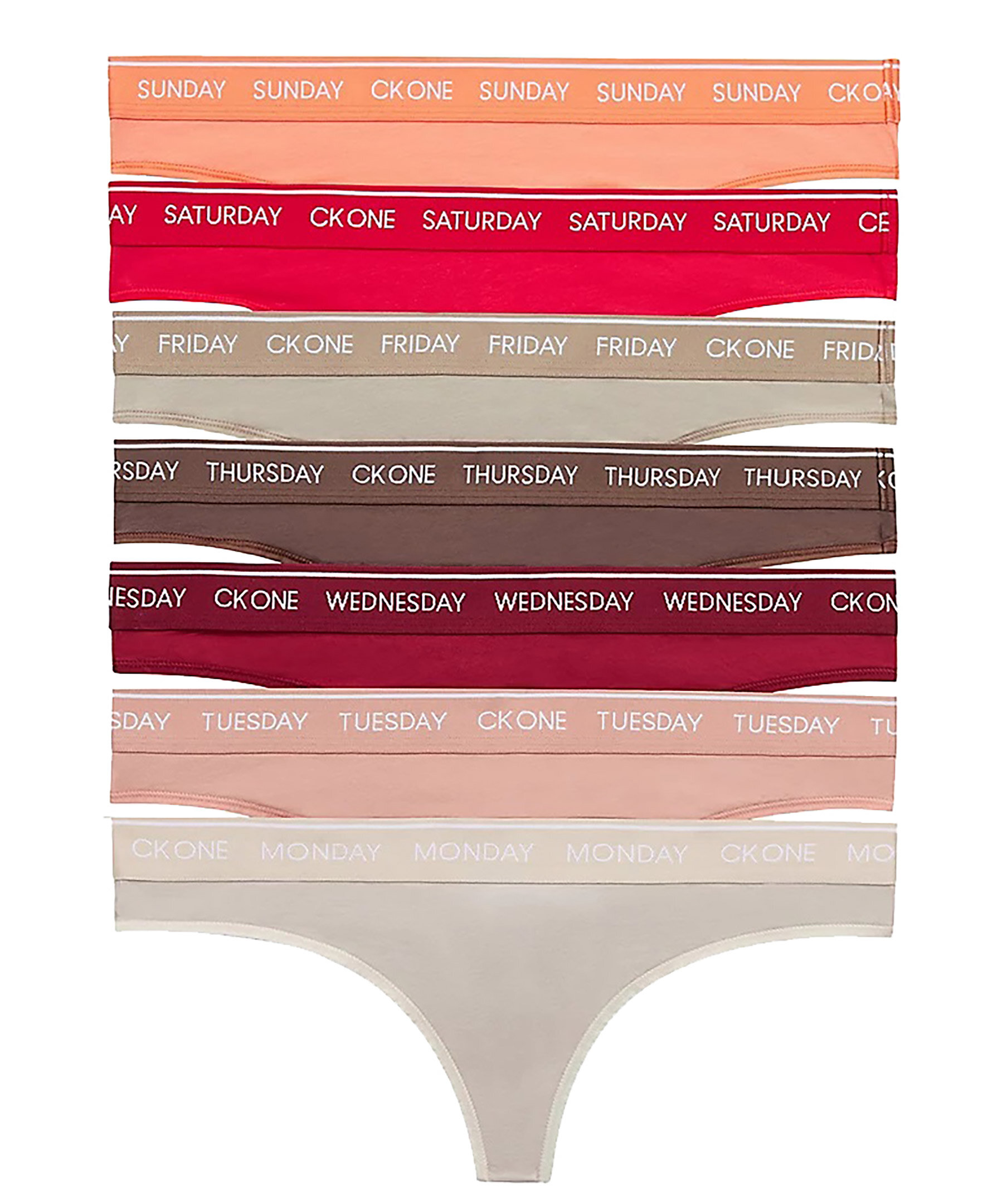 7-pack stringtrosor från Calvin Klein Underwear. Bomullsjersey i mikrofiber, medelhög midja samt veckans dagar inbroderade på mudden i midjan så att du kan ha ett par trosor för varje dag i veckan.