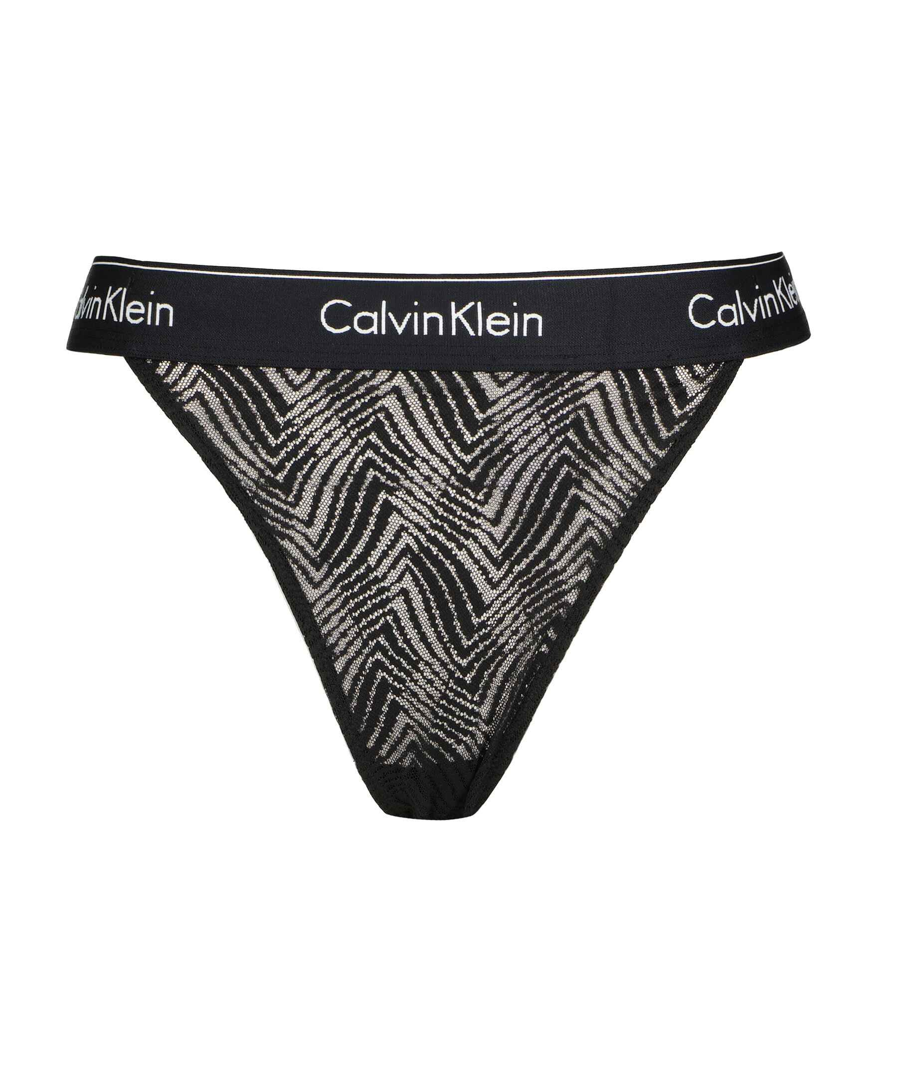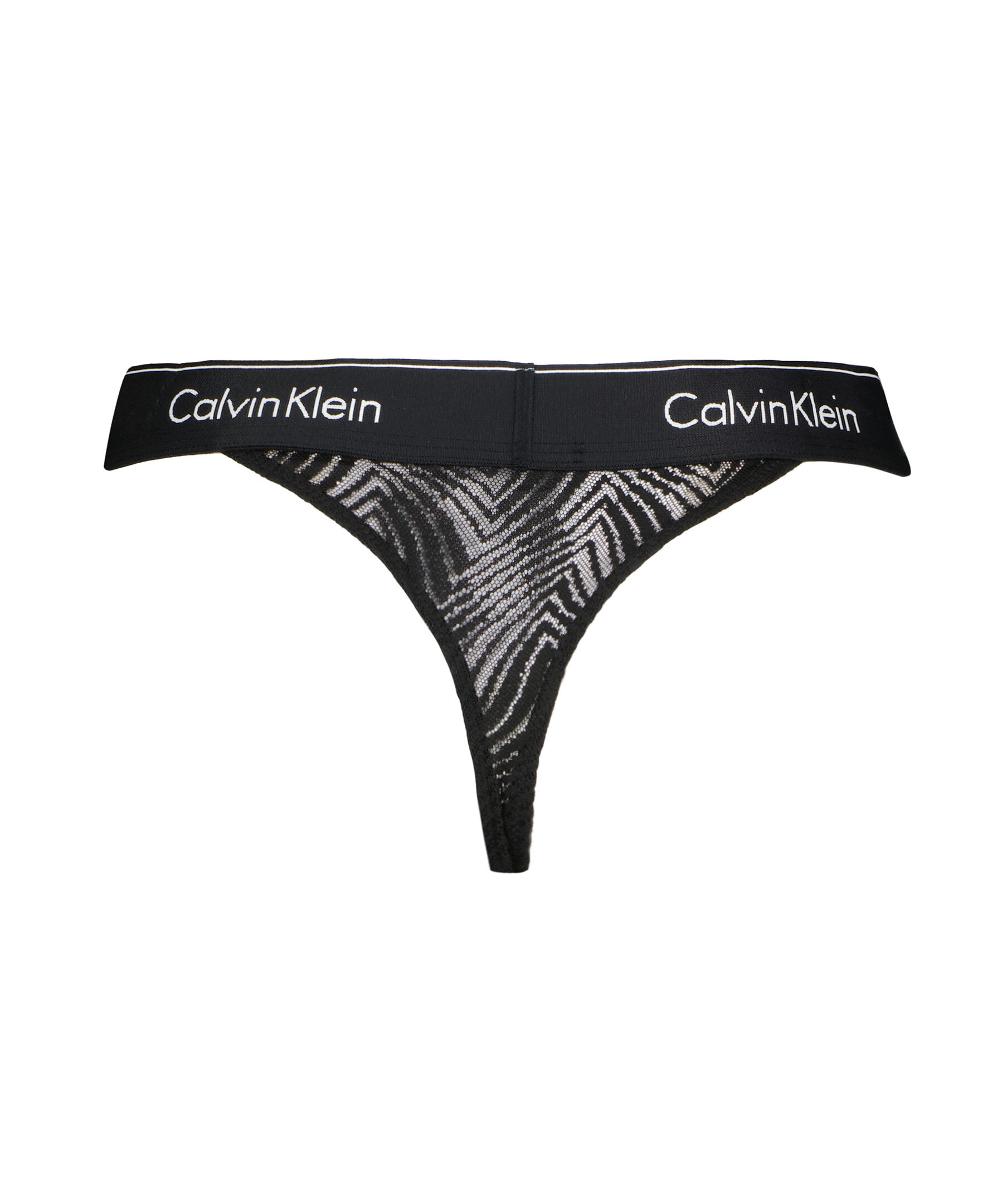 Svarta spetstrosor i string modell från Calvin Klein. Elastisk resår i midjan med logotyper i vitt.