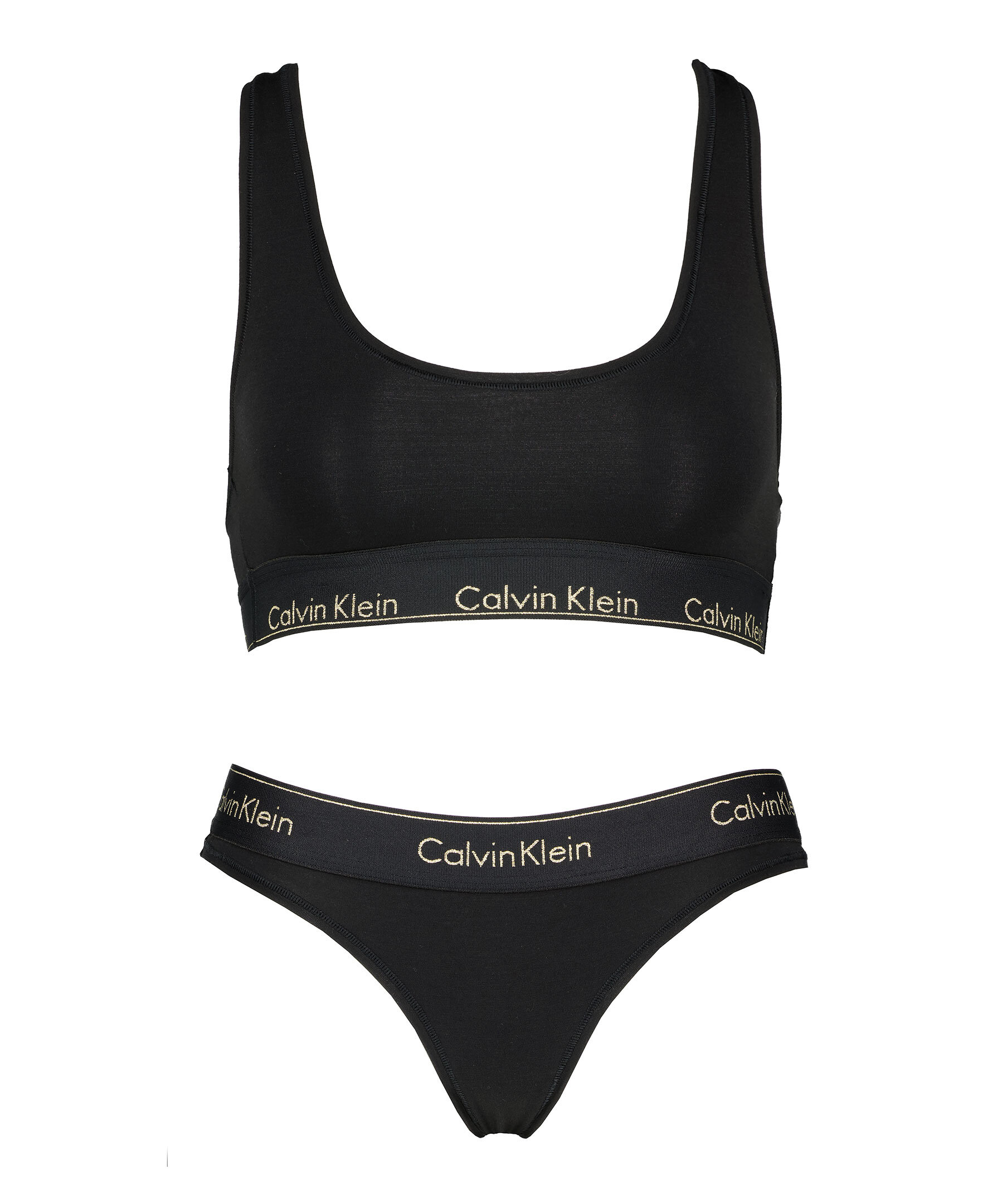 Svart underklädesset från Calvin Klein Underwear. Perfekt att ge bort som present då detta bralett- och stringset presenteras i en presentförpackning. Både trosor och bralett har en Calvin Klein signatur guldmetallic-logotyp samt kanter och är en sportig look. Tillverkade i en stretchig bomull och modalblandning.