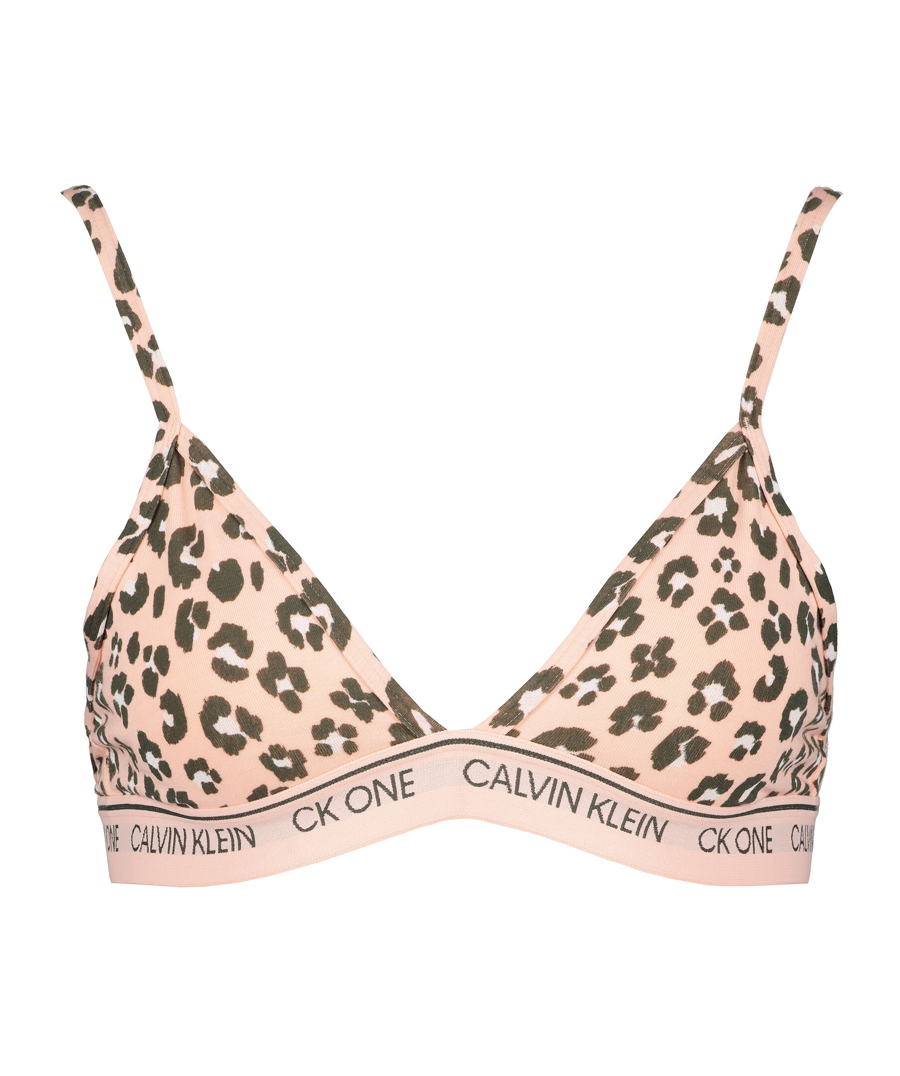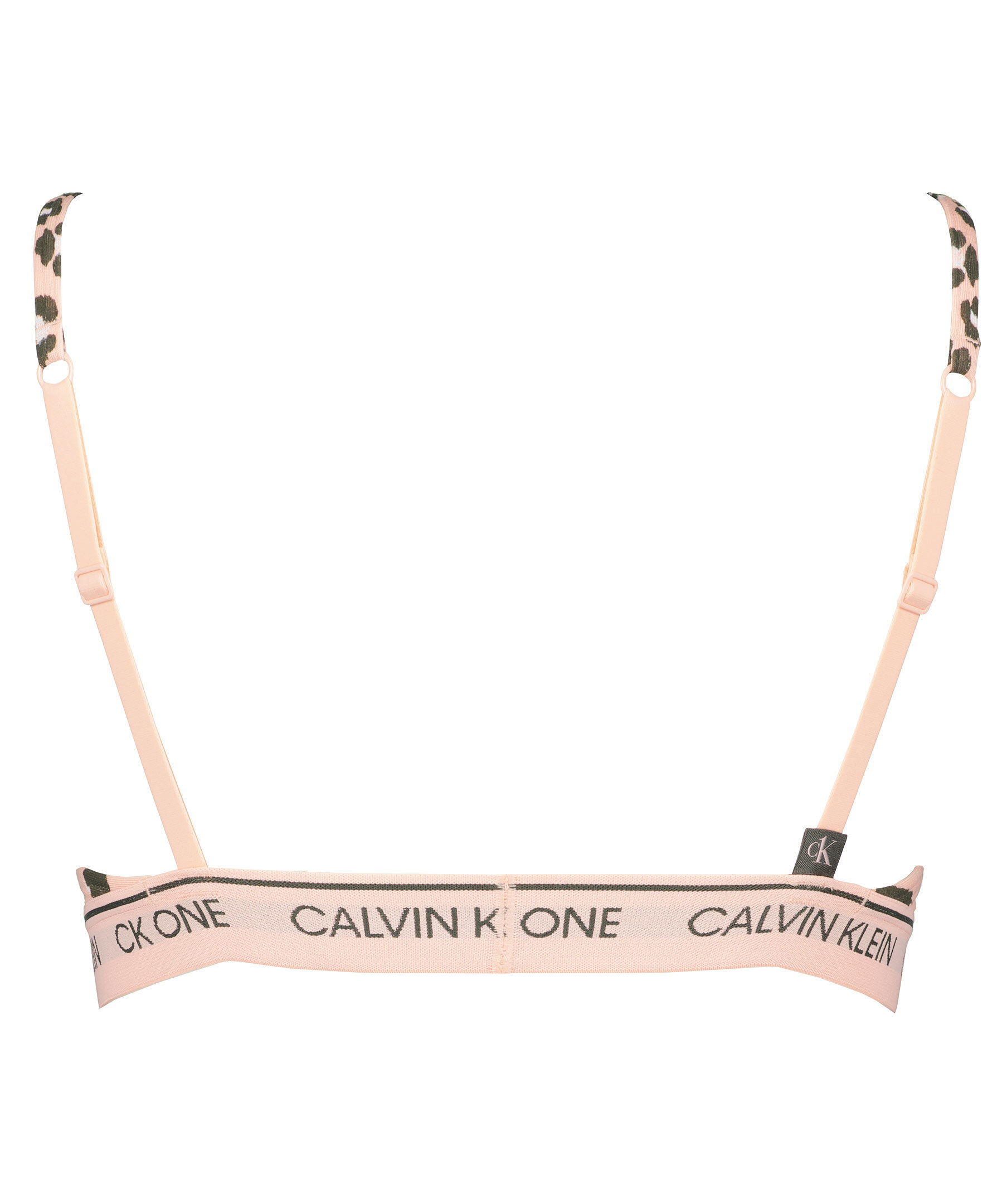 Rosa och svart mönsrad Bh från Calvin Klein. Triangelmodell med brett elastiskt band med logotyper under bysten. Smala justerbara band.