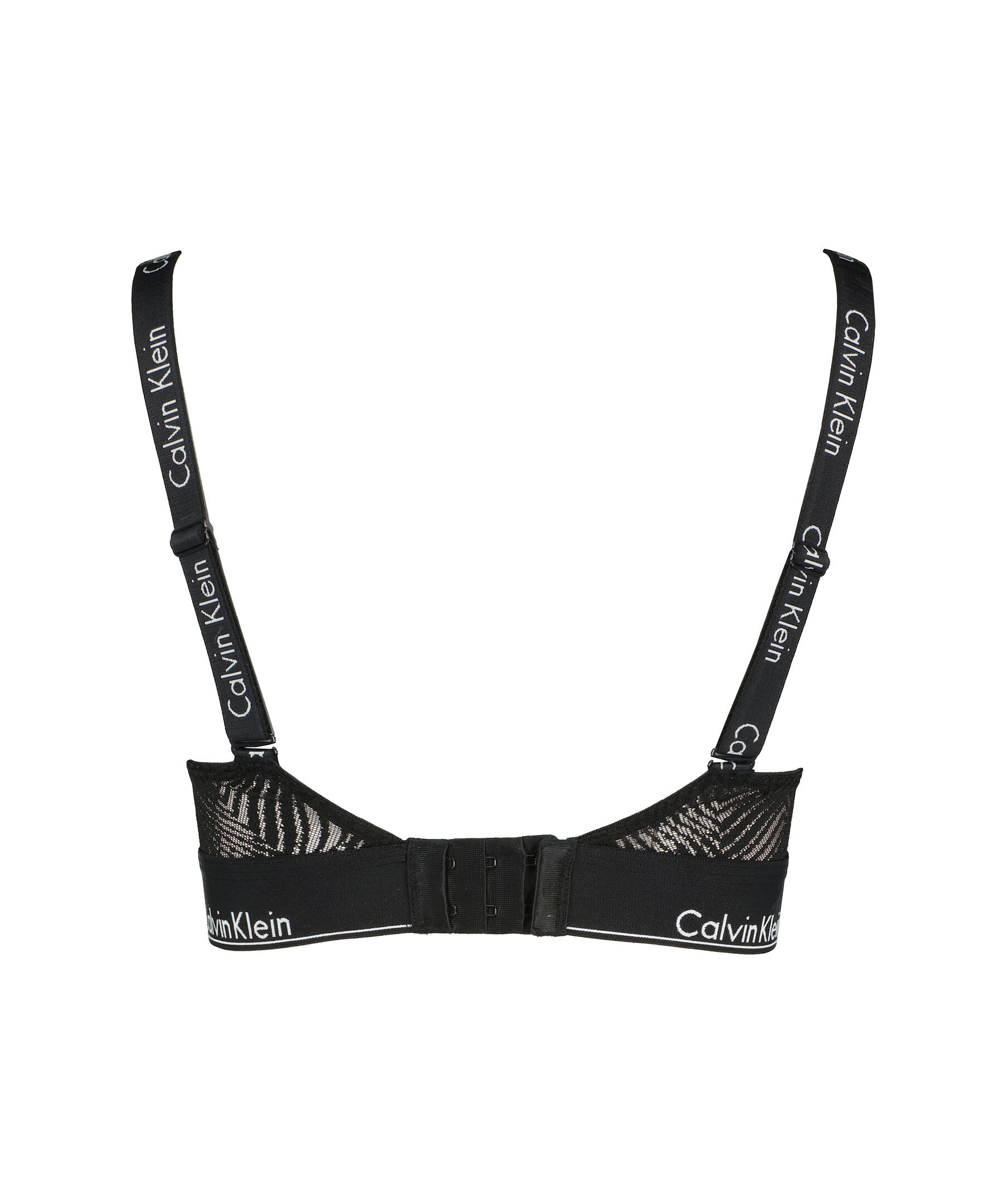 Svart spetsklädd bh från Calvin Klein Underwear. Bred resår nedtill med logotyp. Smala justerbara band med logotyper. Lätt vadderade kupor. Hakar med tre lägen bak i ryggen.