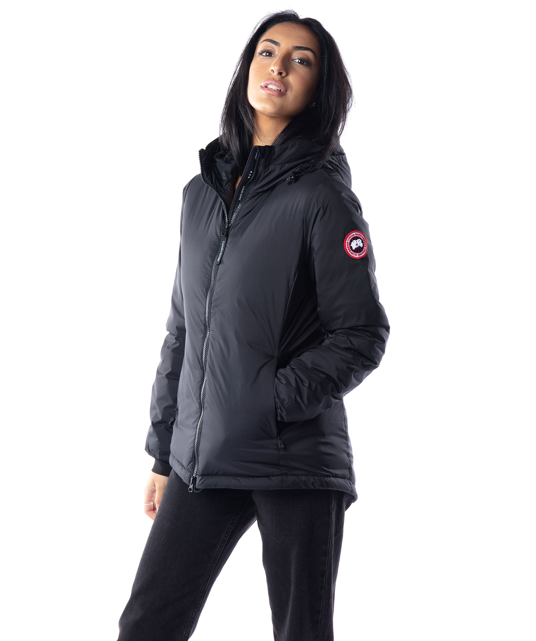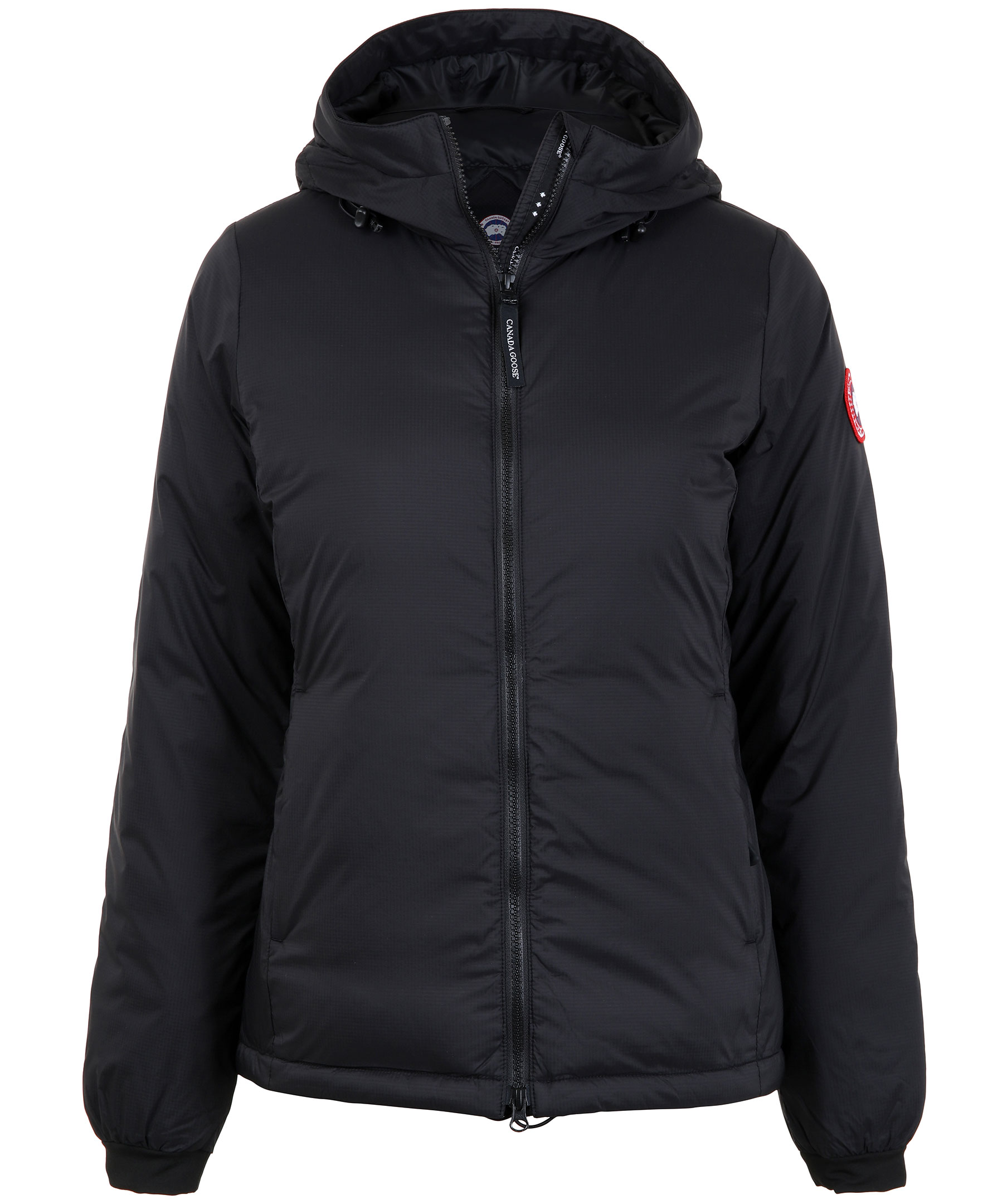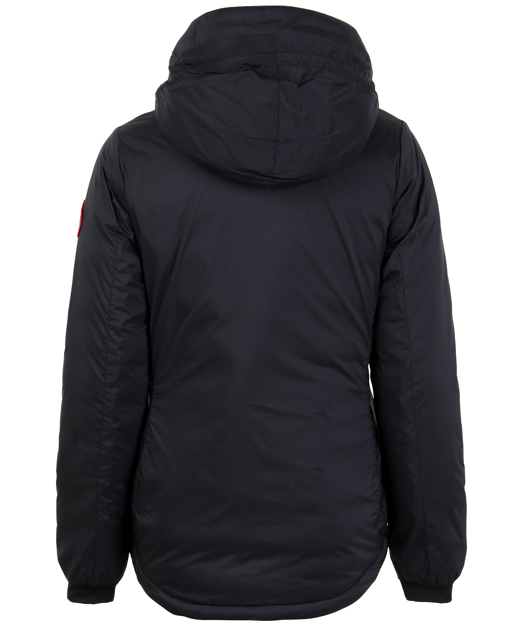 Svart lättviktsdunjacka från Canda Goose. Tillverkad i nylon med fyllning av dun och fjäder. Hög krage med luva, två fickor fram, två innerfickor, logga på vänster ärm samt liten mudd i ärmslut. Modellen är 170 cm lång och bär storlek S.