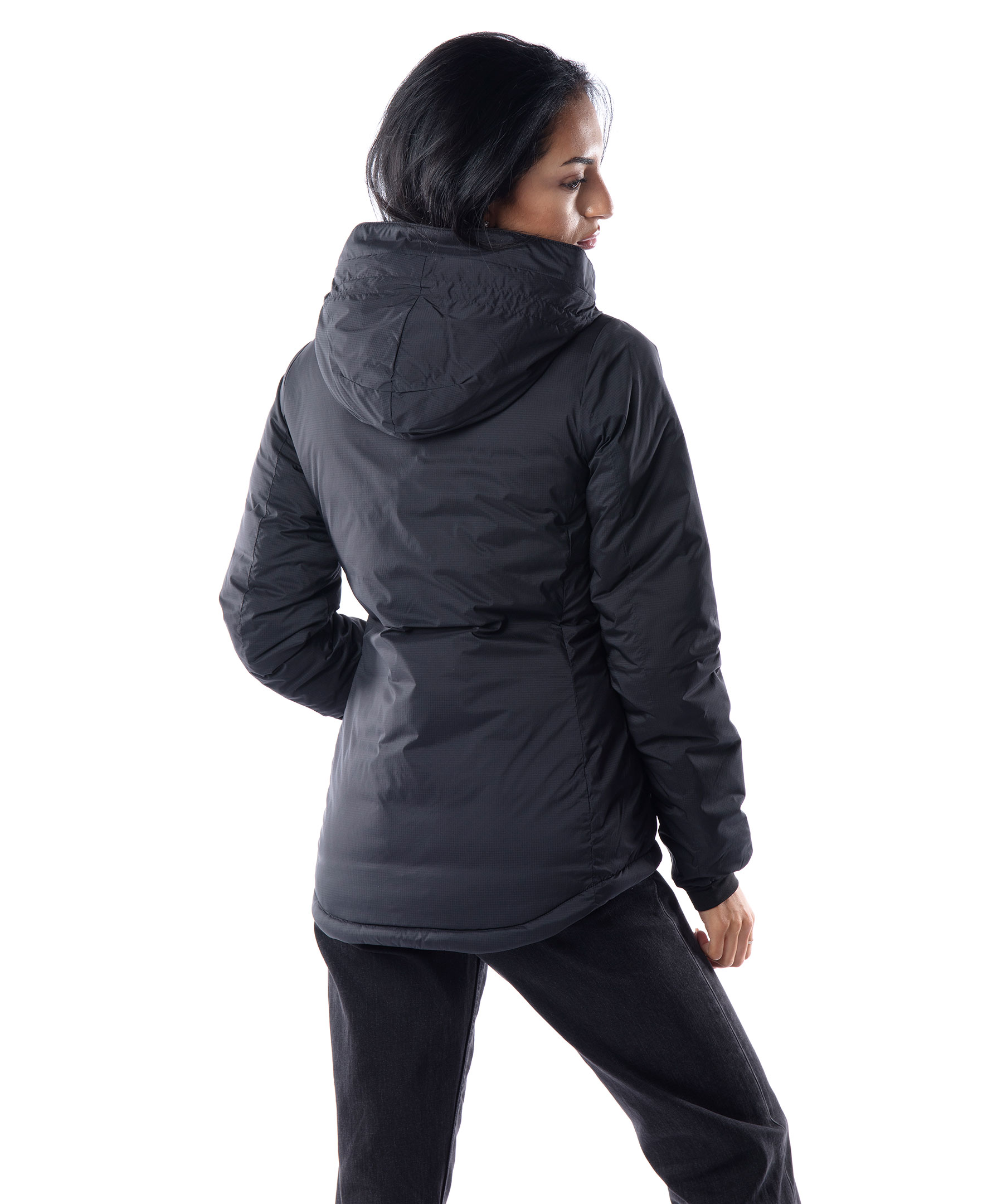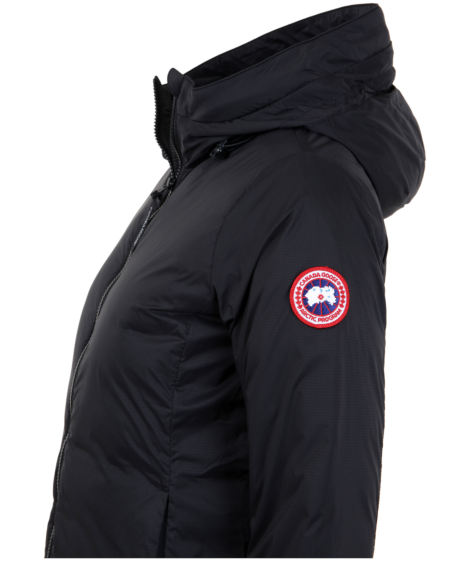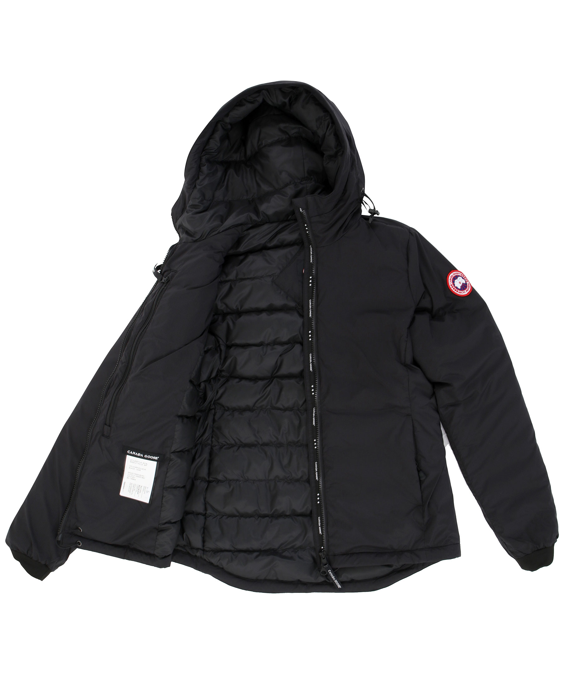 Svart lättviktsdunjacka från Canda Goose. Tillverkad i nylon med fyllning av dun och fjäder. Hög krage med luva, två fickor fram, två innerfickor, logga på vänster ärm samt liten mudd i ärmslut. Modellen är 170 cm lång och bär storlek S.