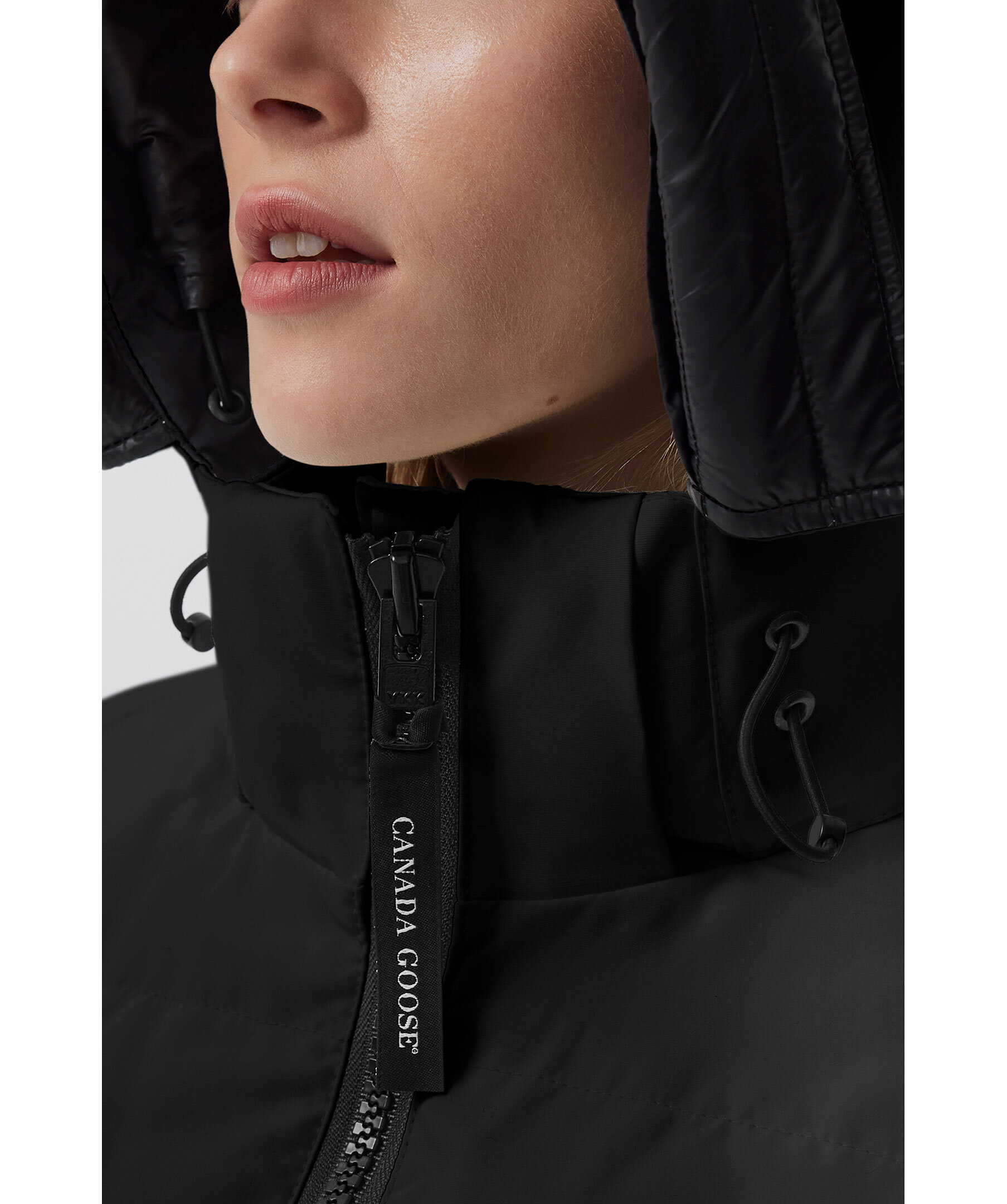 Svart dunjacka från Canada Goose. Stängs framtill med tvåvägsdragkedja. Två framfickor med skönt fleecefoder samt två praktiska innerfickor. Broderad patch med logotyp på vänstra ärmen. Luva med dragsko, Dragsko i midjan. Ribbstickade muddar vid ärmslut.