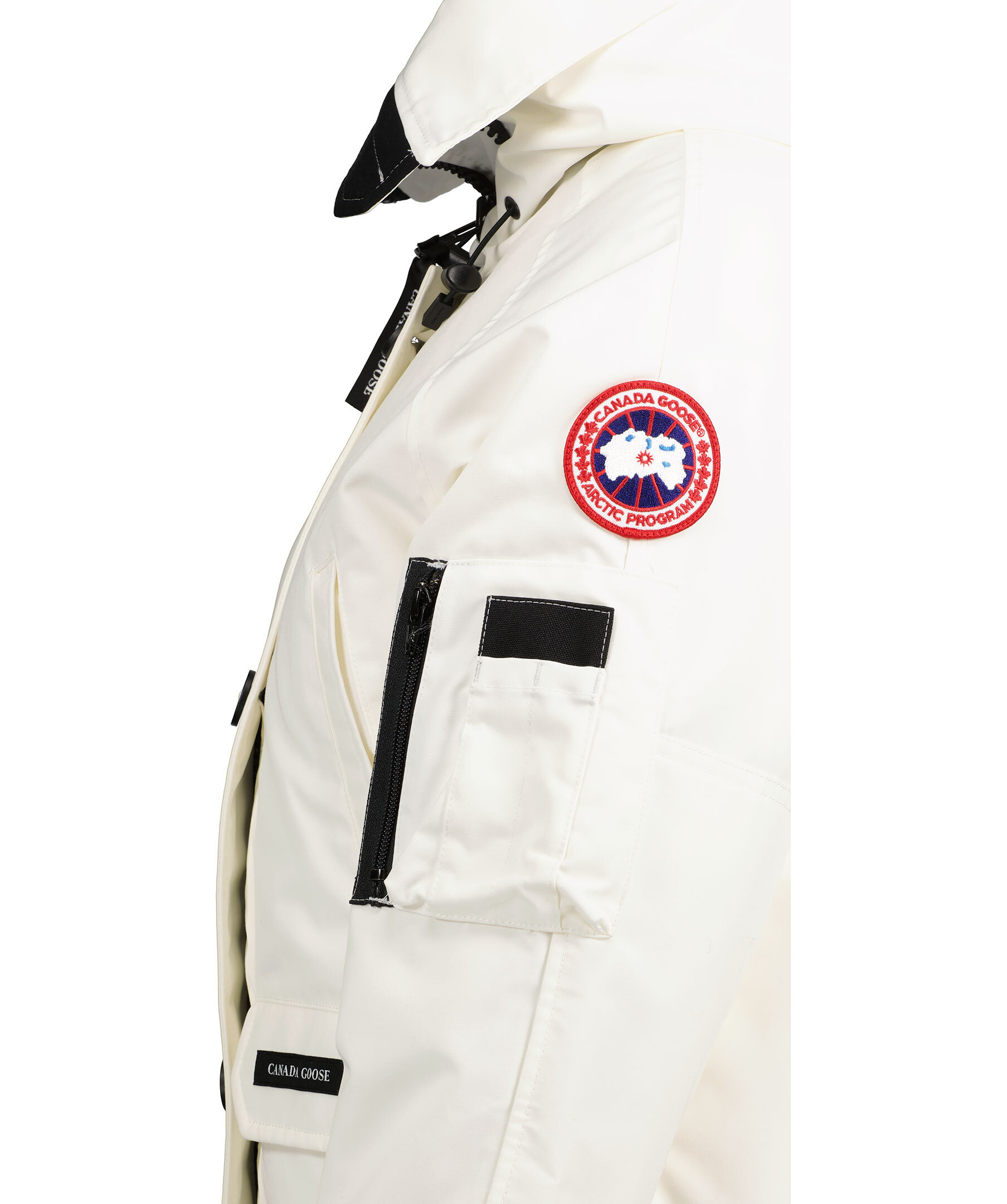 Vit dunjacka i kort bomber modell från Canada Goose. Jackan har en extra stor huva med dragsko för extra skydd under blåsiga dagar. Extra förstärkta armbågar. Fyra fleecefodrade framfickor och en öppen innerficka. Jackan stängs med både dragkedja plus knappar för att hålla värmen så bra som möjligt. Ribbstickade muddar vi ärm och plaggslut. Ficka och broderad tygpatch med logotyp på vänster överärm. Gjord för att hålla dig varm mellan -10°C till -20°C.