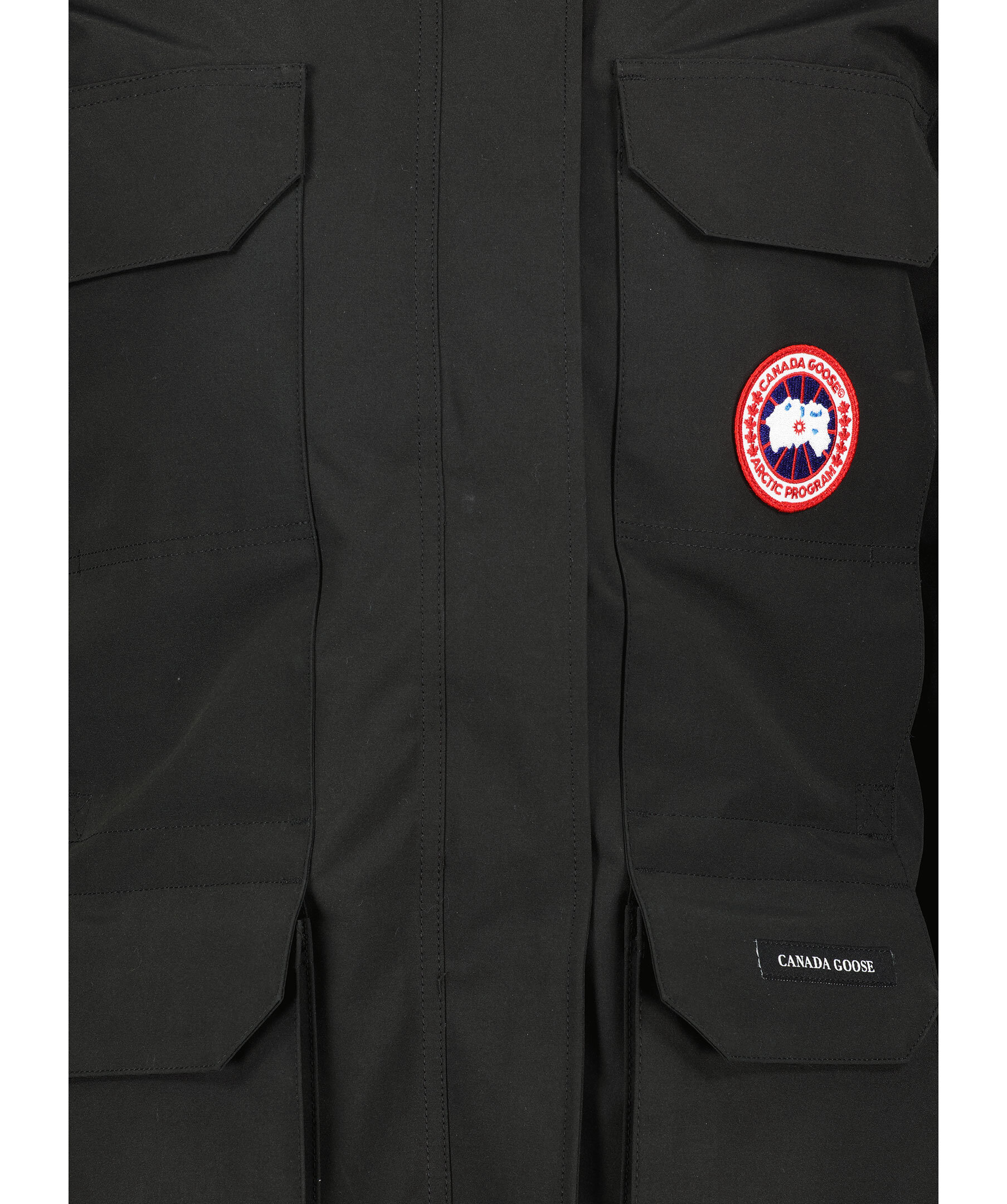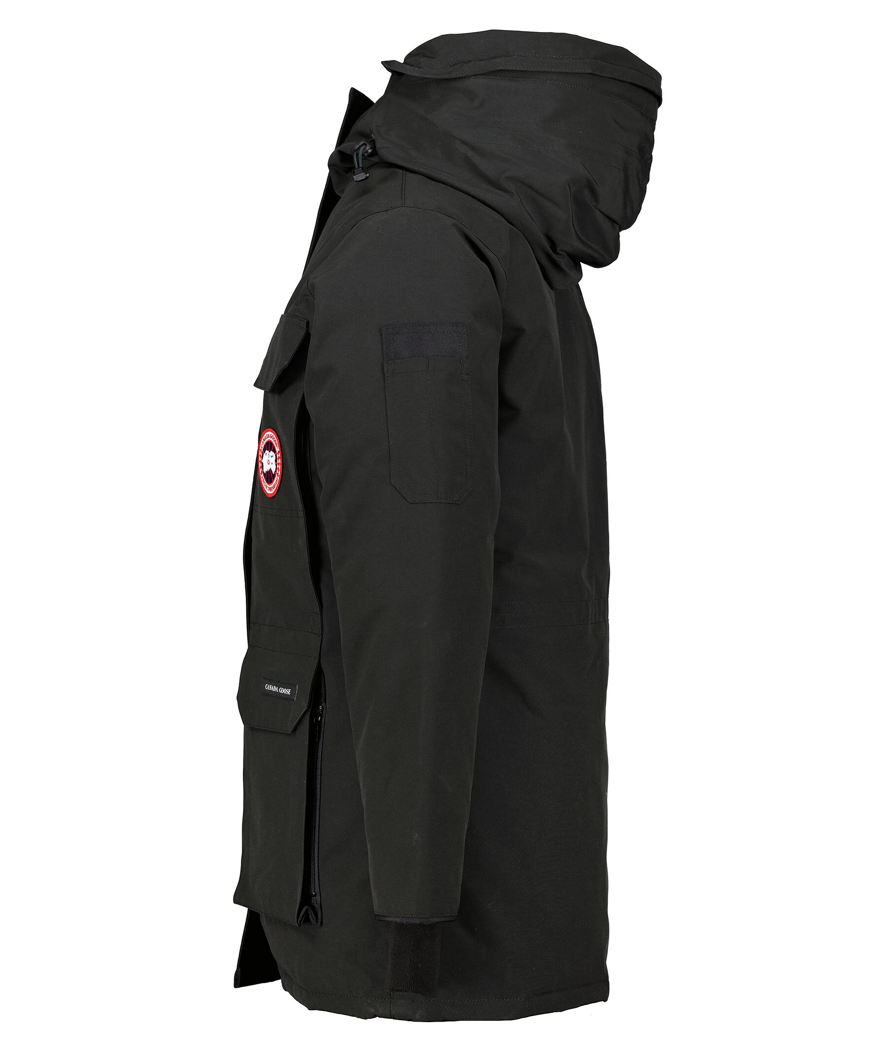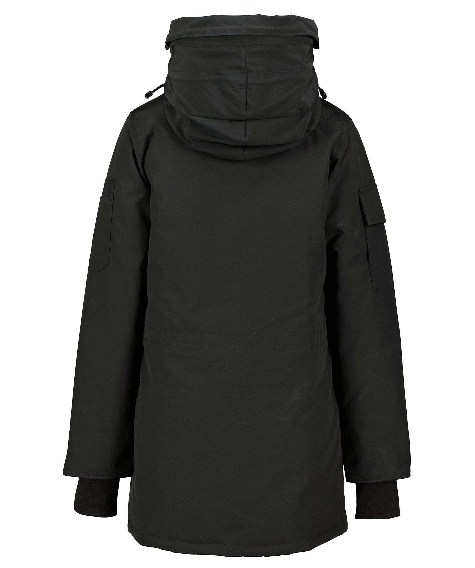 Svart parka från Canada Goose. Stängs framtill med tvåvägsdragkedja och kardborrar. Fyra fickor framtill som stängs med lock och kardborre. Luva med dragsko. Broderad patch med logotyp framtill. Ribbstickade muddar vid ärmslut. Elastiska band på insidan som man kan sätta över axlarna och låta jackan hänga fritt om man vill ha den öppen. Dragsko i midjan. Innerfickor i mesh material. Snölås i midjan.