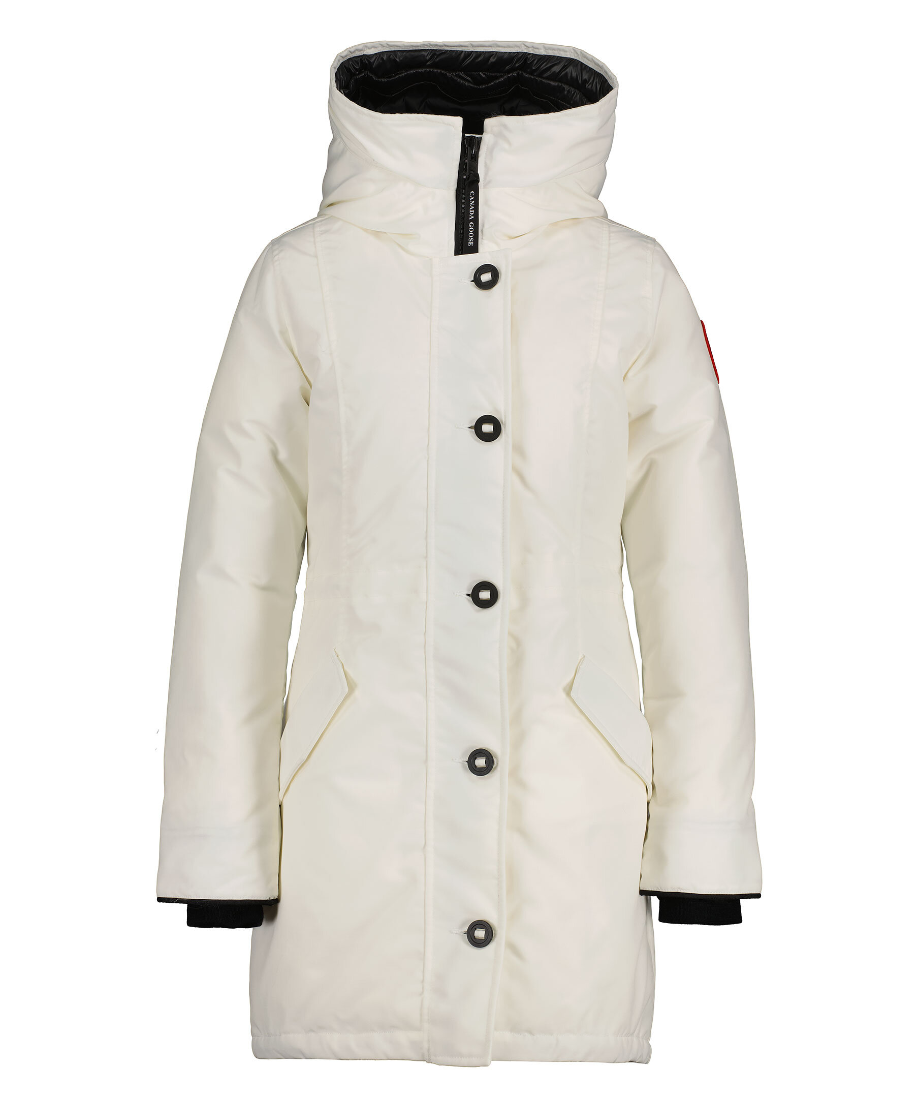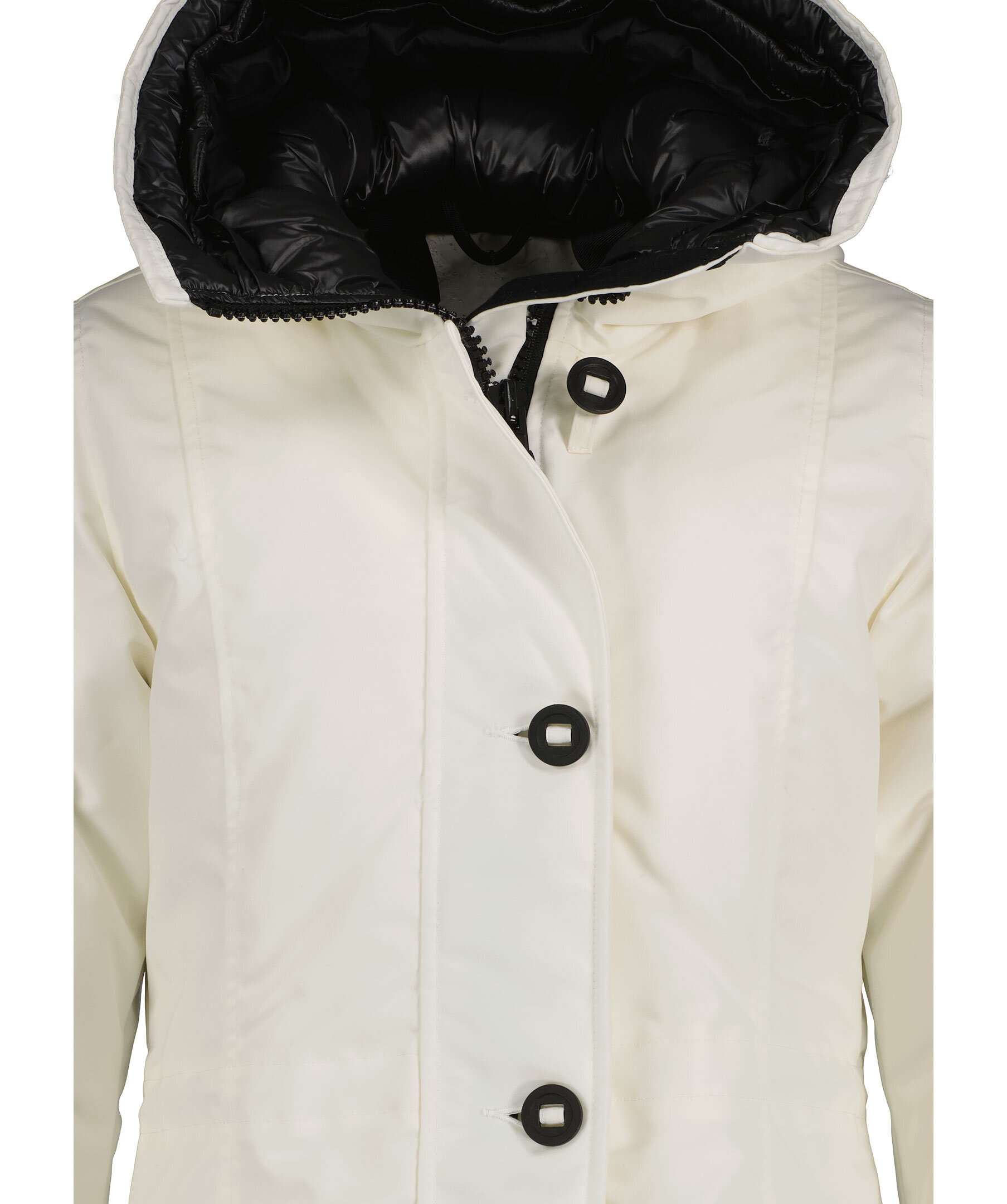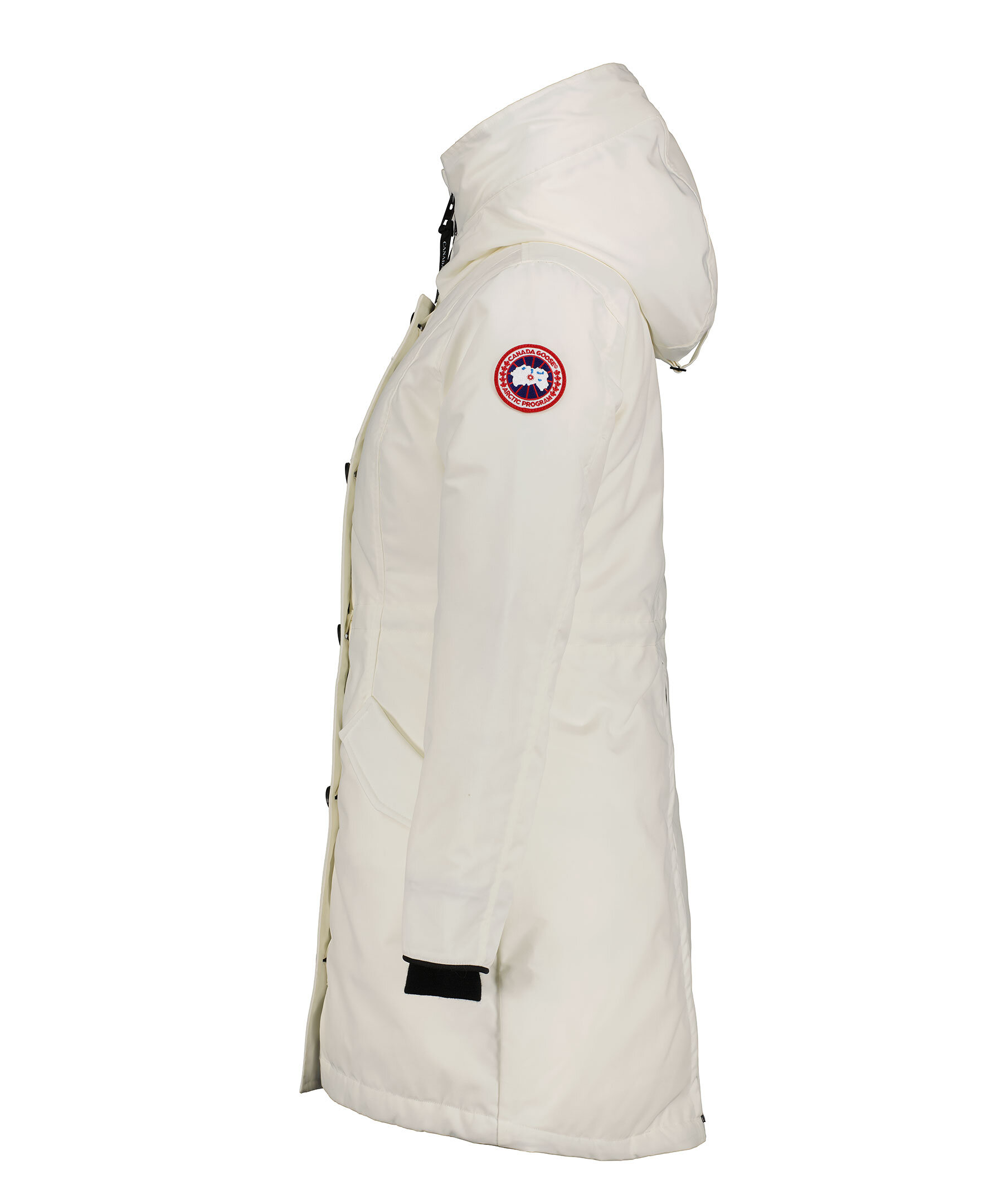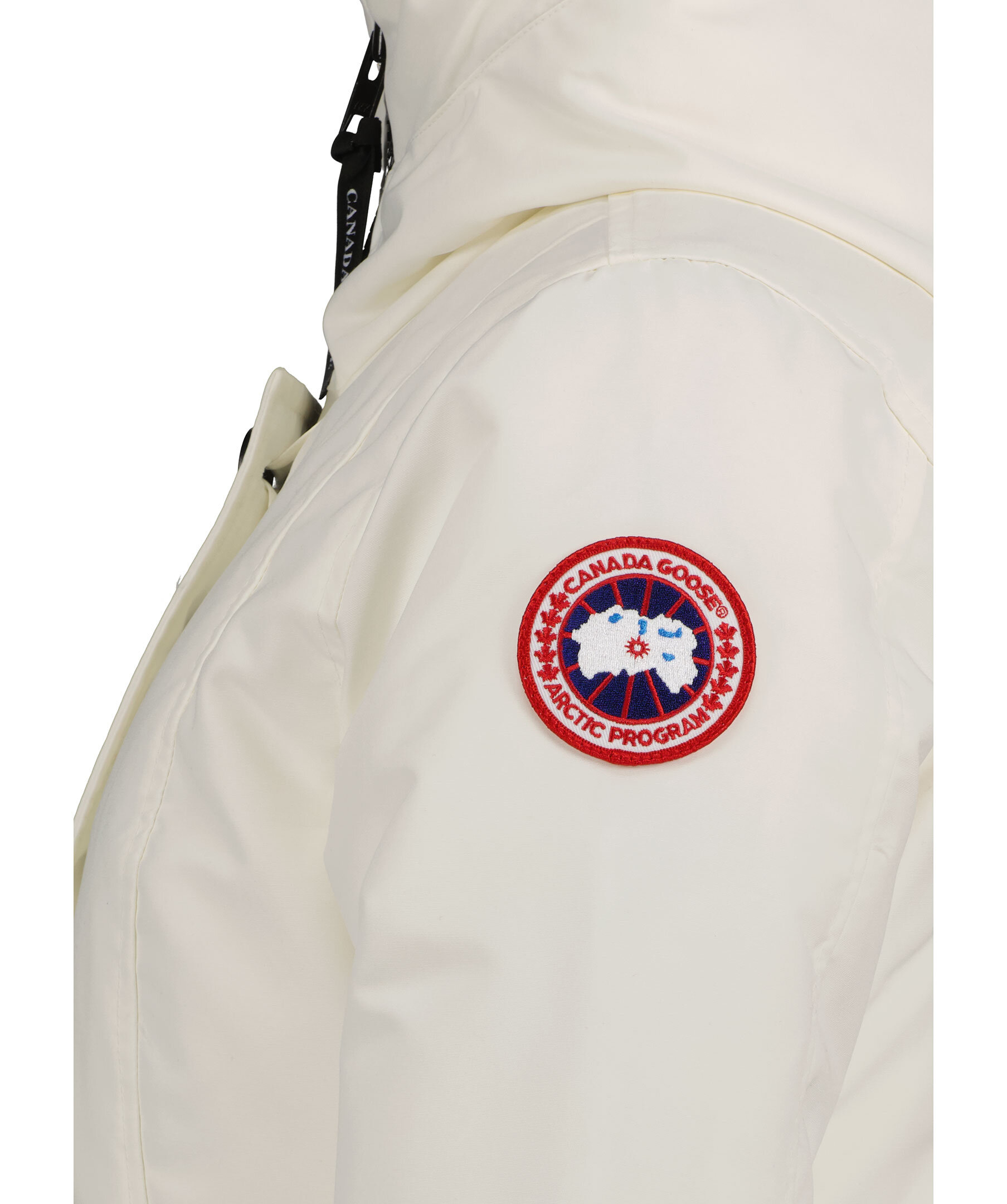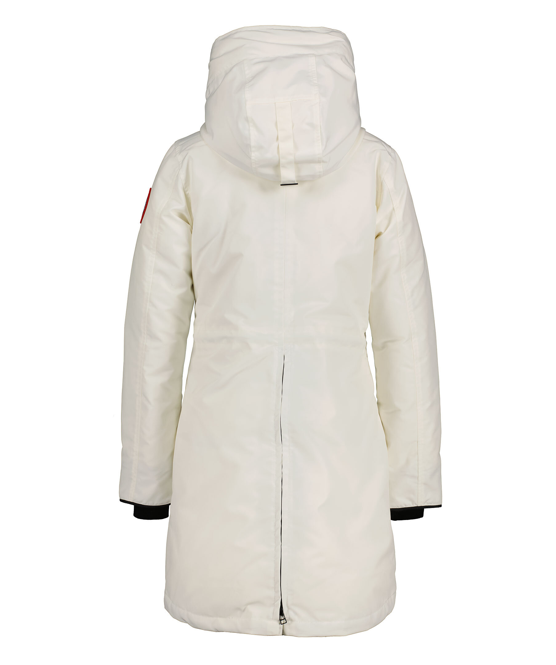 Vit dunjacka från Canada Goose. Medellång jacka med hög krage och fast huva. Jackan har elastiska band på insidan som kan sättas över axlarna och låta jackan hänga fritt om man vill ha den öppen. Stängs med tvåvägsdragkedja och knappar. Två snedställda frontfickor med ficklock och tryckknappar samt två innerfickor. Ribbstickad mudd. Klassiskt Canada Goose märke på vänster ärm.
