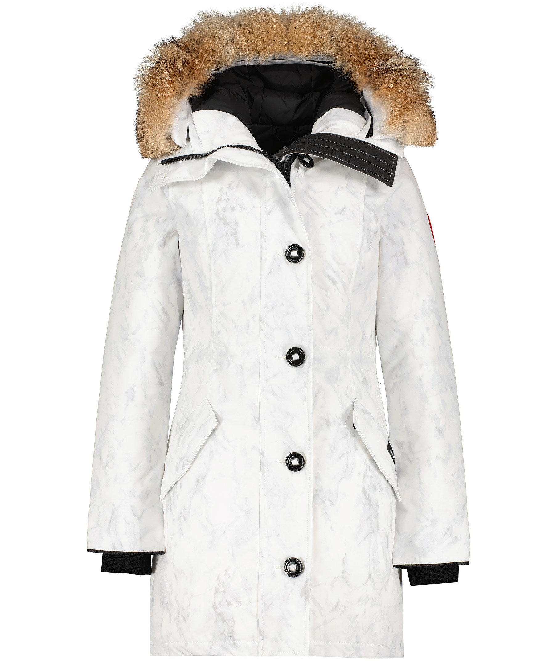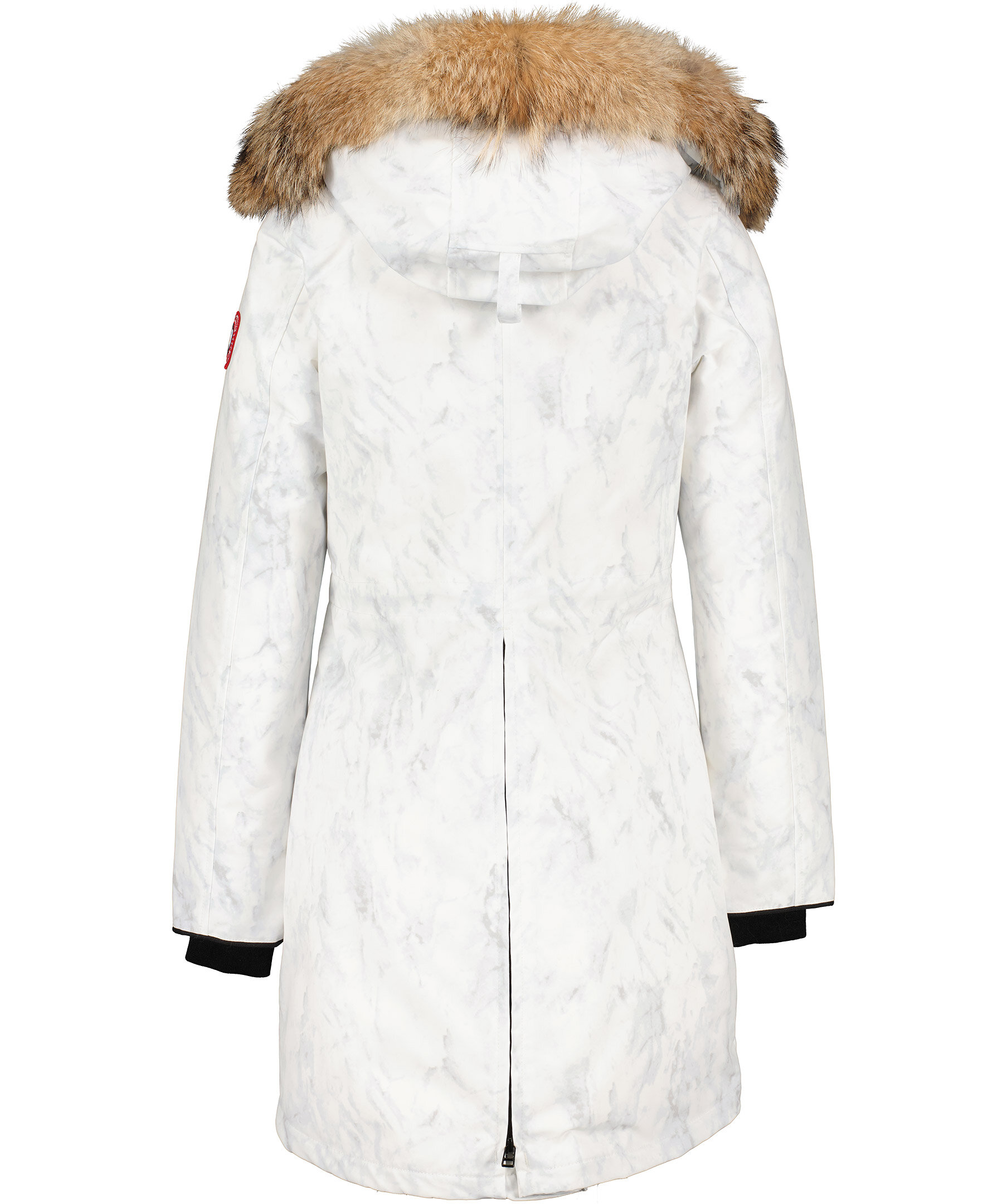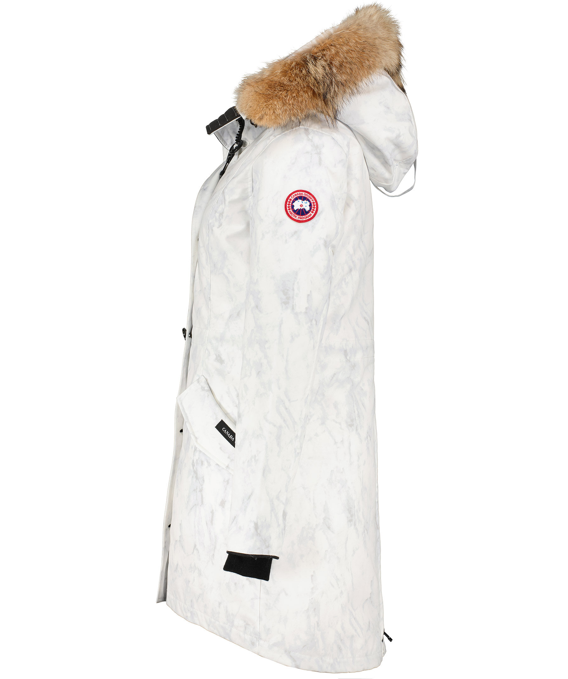 Vit dunjacka med marmorerat tryck från Canada Goose. Medellång jacka med hög krage och fast huva, justerbar med dragsko samt med löstagbar naturpäls. Två snedställda frontfickor med ficklock och tryckknappar samt en innerficka. Ribbstickad mudd vid ärmslut samt tvåvägsdragkedja och knappar fram. Justerbar dragsko i midjan och klassiskt Canada Goose märke på vänster ärm. TIPS! Ånga pälsen för att få den stor och fluffig. OBS! Naturpälsar är unika och kan skilja sig från bilden. Modellen är 178cm lång och har på sig storlek S.