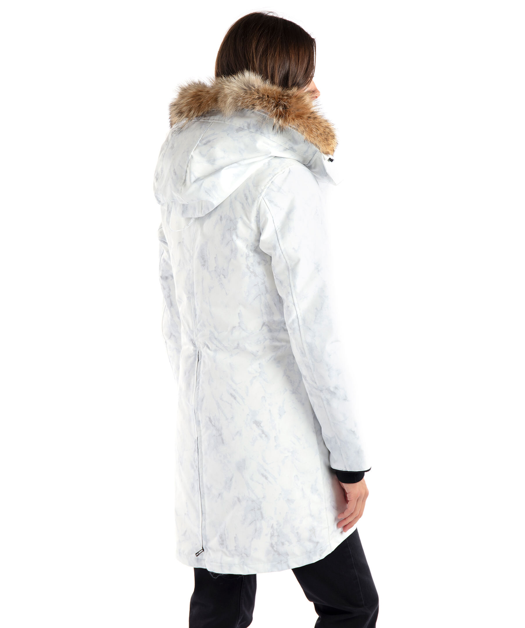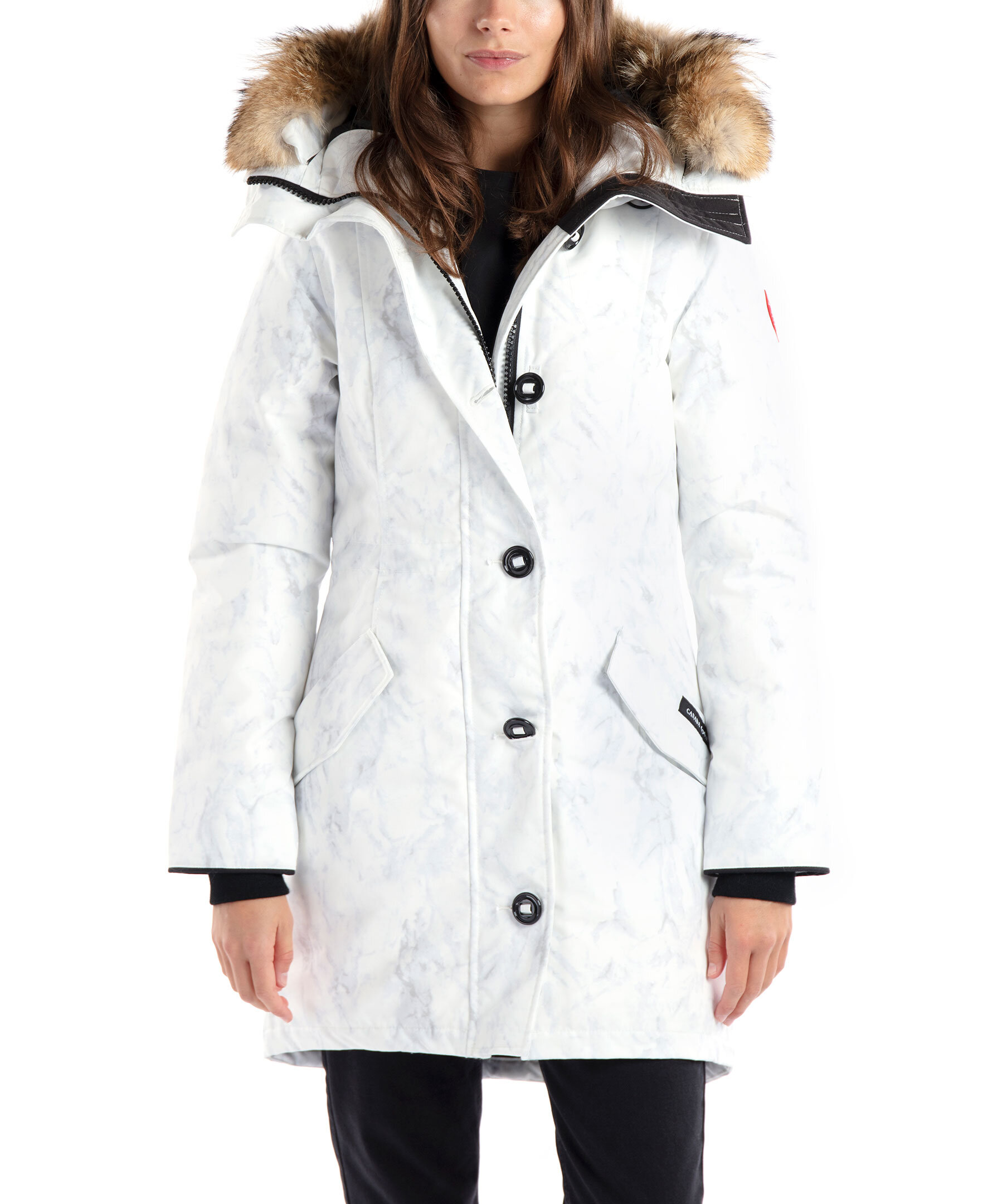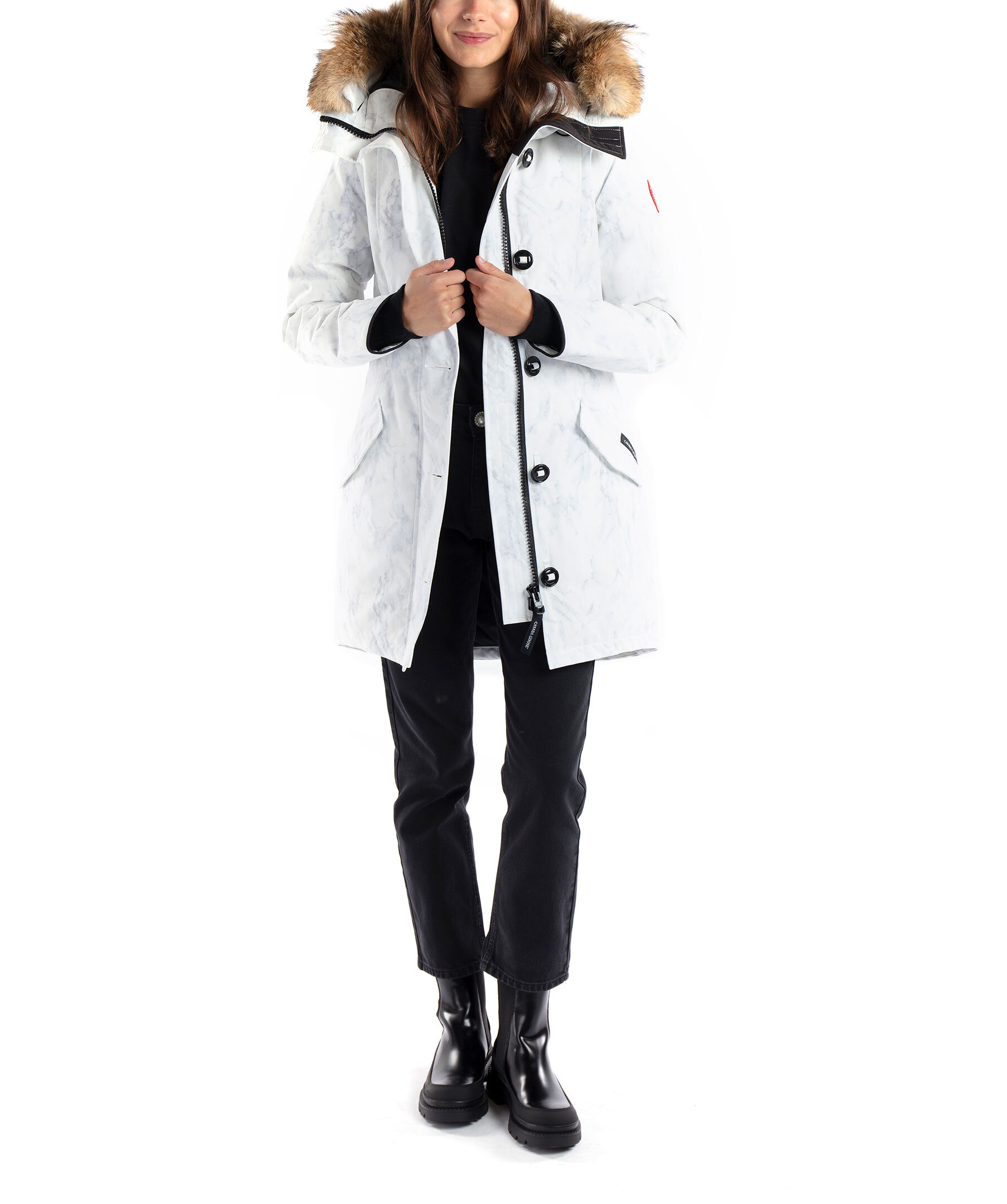 Vit dunjacka med marmorerat tryck från Canada Goose. Medellång jacka med hög krage och fast huva, justerbar med dragsko samt med löstagbar naturpäls. Två snedställda frontfickor med ficklock och tryckknappar samt en innerficka. Ribbstickad mudd vid ärmslut samt tvåvägsdragkedja och knappar fram. Justerbar dragsko i midjan och klassiskt Canada Goose märke på vänster ärm. TIPS! Ånga pälsen för att få den stor och fluffig. OBS! Naturpälsar är unika och kan skilja sig från bilden. Modellen är 178cm lång och har på sig storlek S.