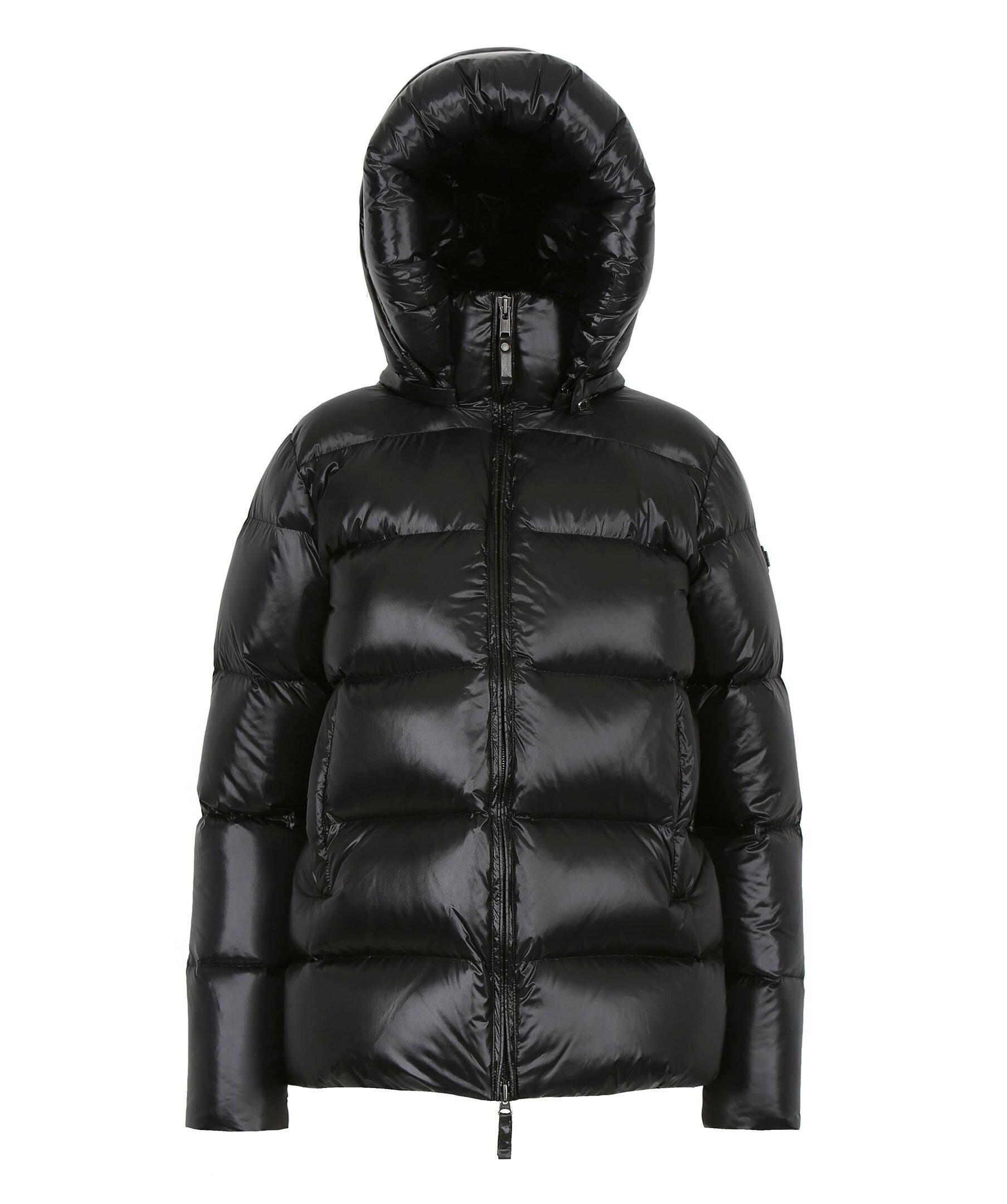 Svart, glansig dunjacka från Cedrico. Jackan stängs med tvåvgäsdragkedja och har avtagbar huva med justerbar dragsko, två sidfickor samt logotyp på vänster ärm. Vattenavvisande. Tillverkad i nylon med dunfyllning.