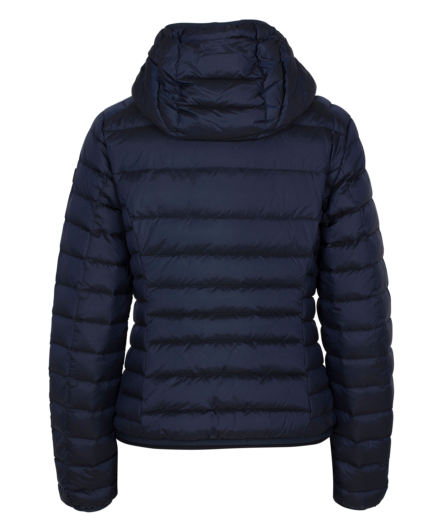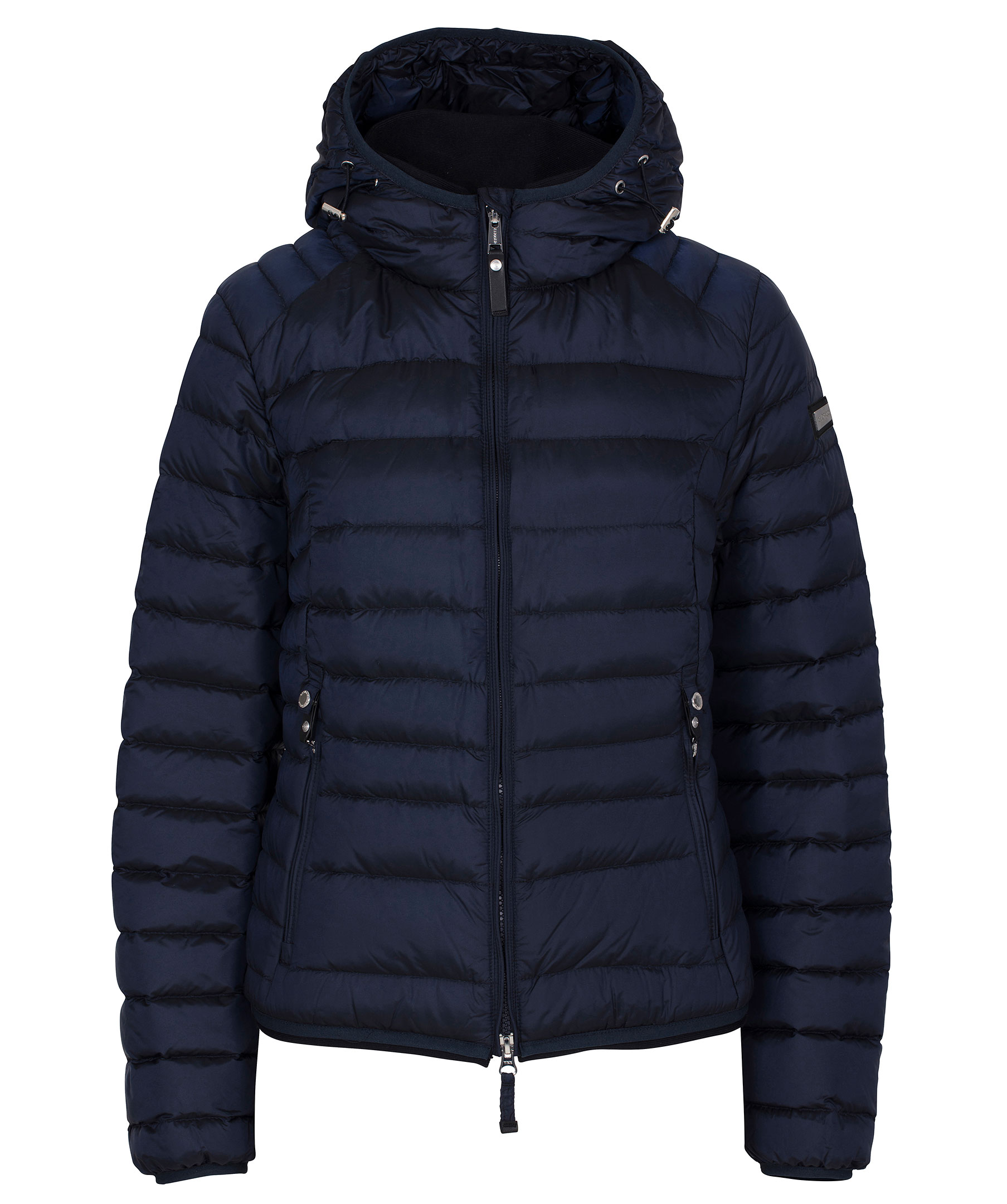 Marinblå lättviktsdunjacka från Cedrico. Tillverkad i nylon med fyllning av dun och fjäder. Jackan stängs med tvåvägsdragkedja och har en hög krage med luva som kan spännas åt med elastisk dragsko. Två fickor fram som stängs med dragkedja och har knapp ovanför som man kan knäppa fast dragflärpen i så att den håller sig på plats och inte åker ner. Tre innerfickor, en med dragkedja. Logga på vänster ärm samt liten mudd i ärmslut och plaggslut. Ventilationshål i armhålorna.