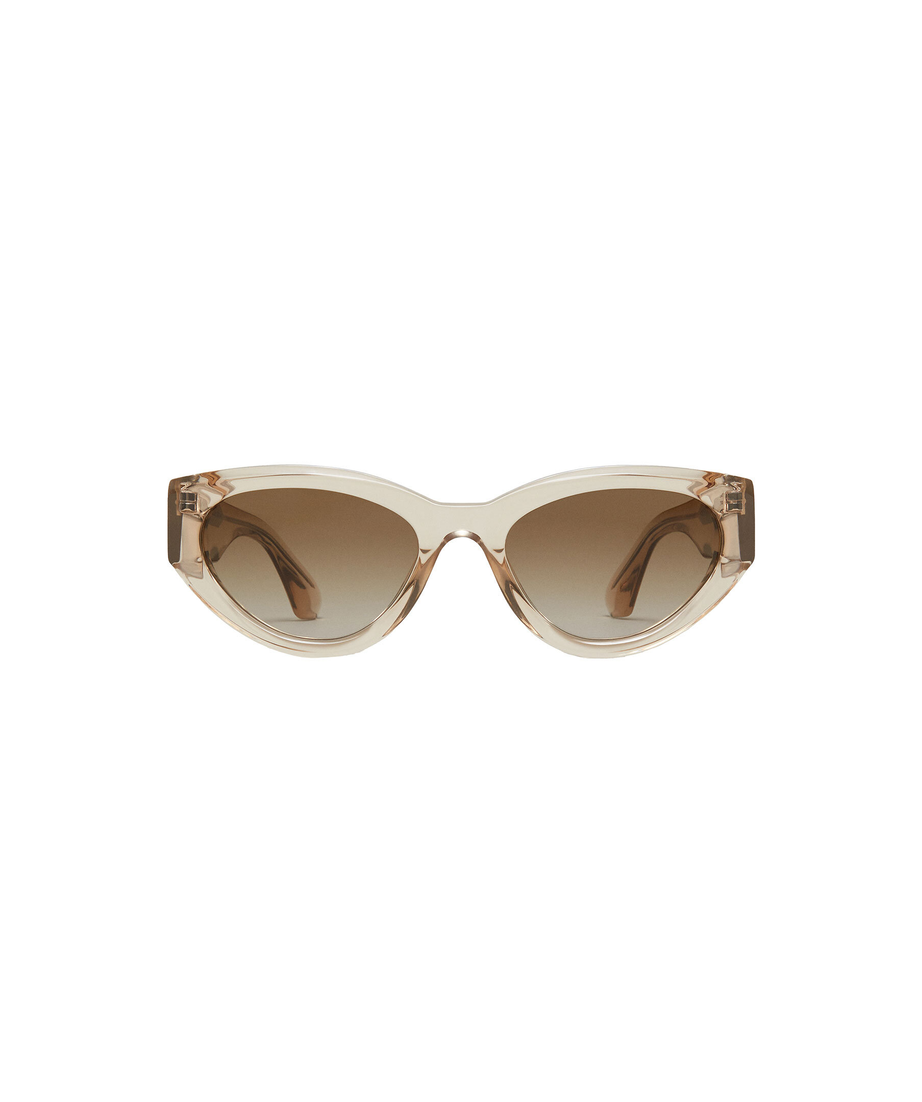Beigea, transparenta solglasögon i modell 06 från Chimi. 06 är en modern kattöga med fyrkantiga vingar. Utrustad med mjukt rundade UV-skyddande CR39-linser.