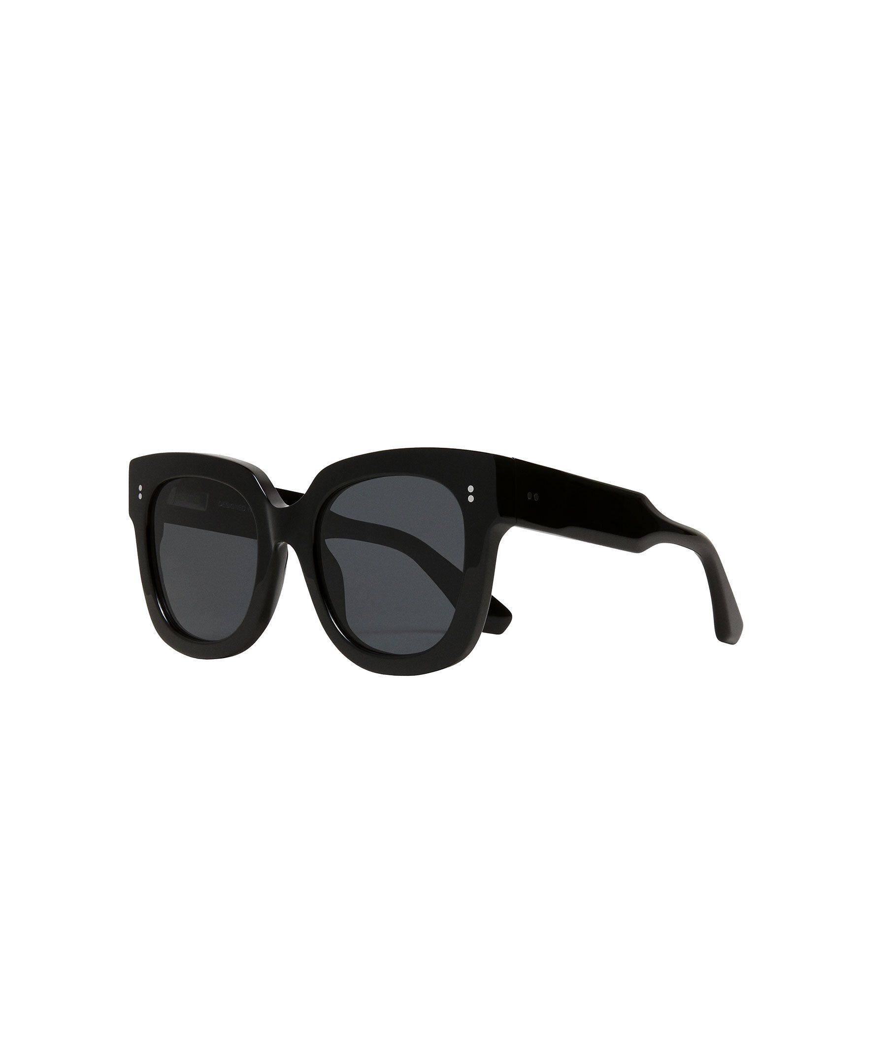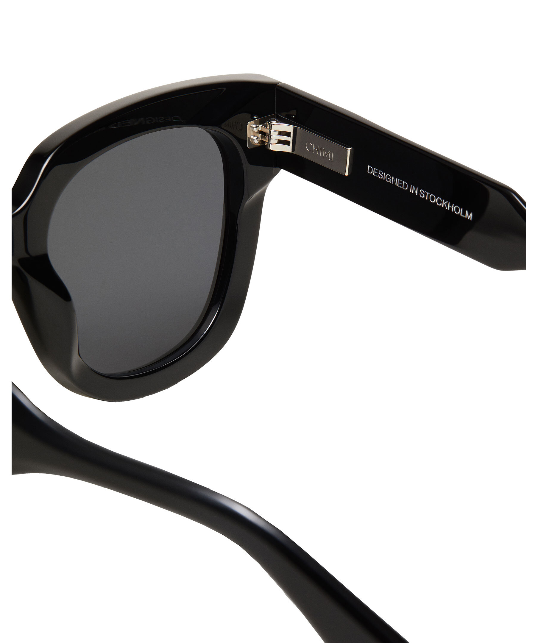 Svarta solglasögon i modell 08 från Chimi. 08 är en djärv D-formad ram som balanserar melodramatiska volymer med ett linjärt utseende. Designad med stora UV-skyddande CR39-linser och avslutad med silverfärgade nitgångjärn.