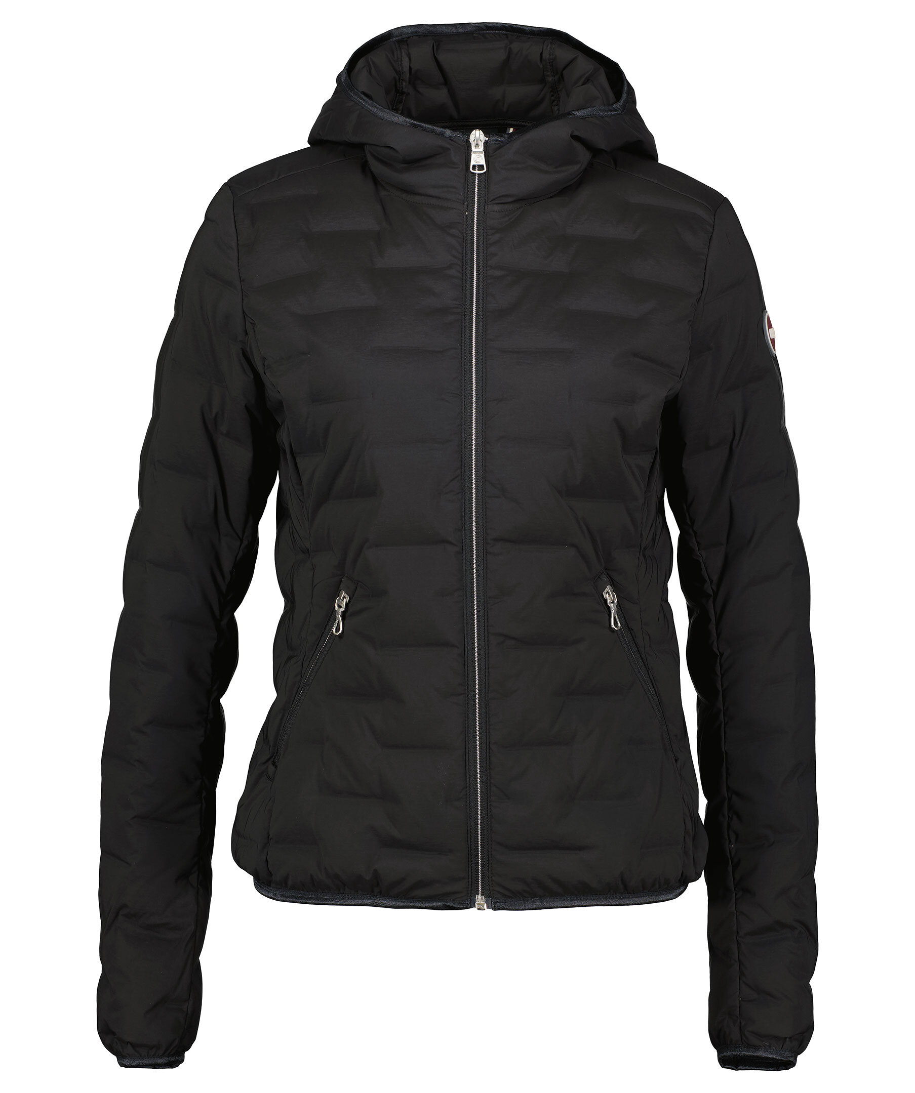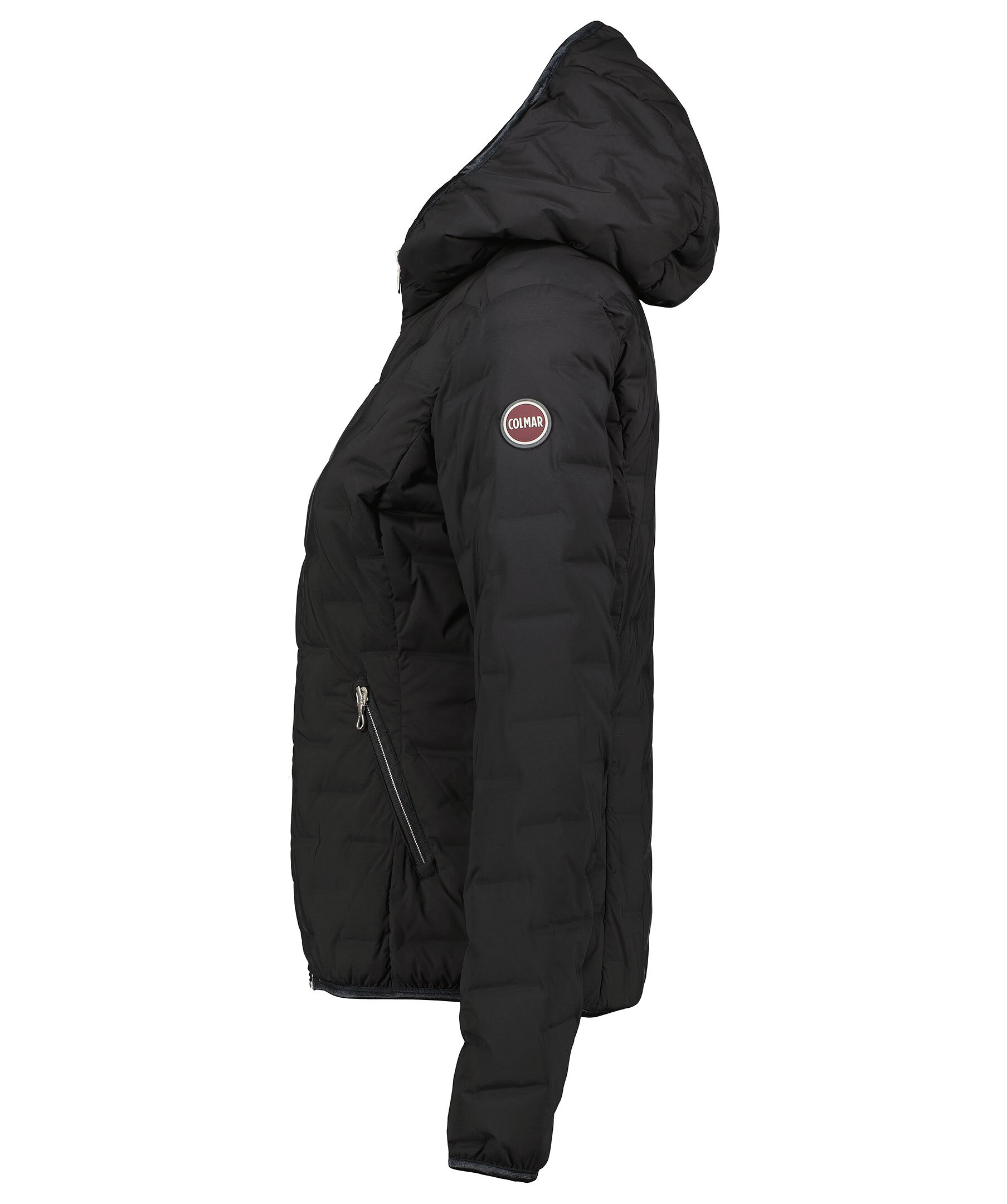 Svart quiltad dunjacka med luva från Colmar. Stängs framtill med tvåvägsdragkedja. Två fickor framtill som stängs med dragkedja. Smal elastisk mudd i ärm- och plaggslut. Gummerad logotyp på vänster ärm.