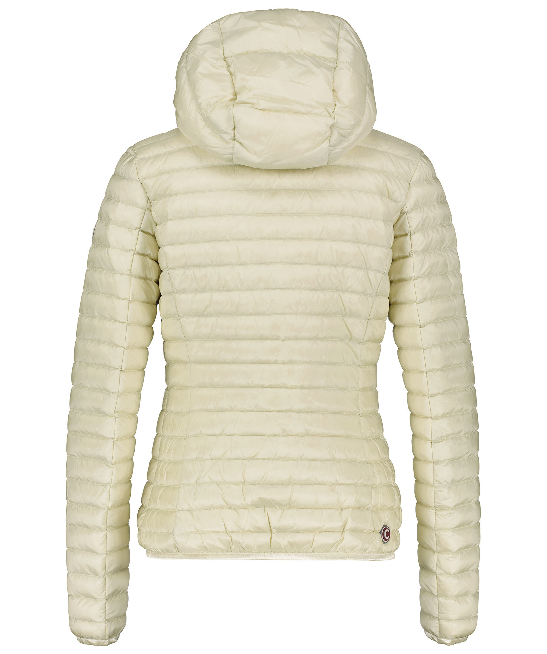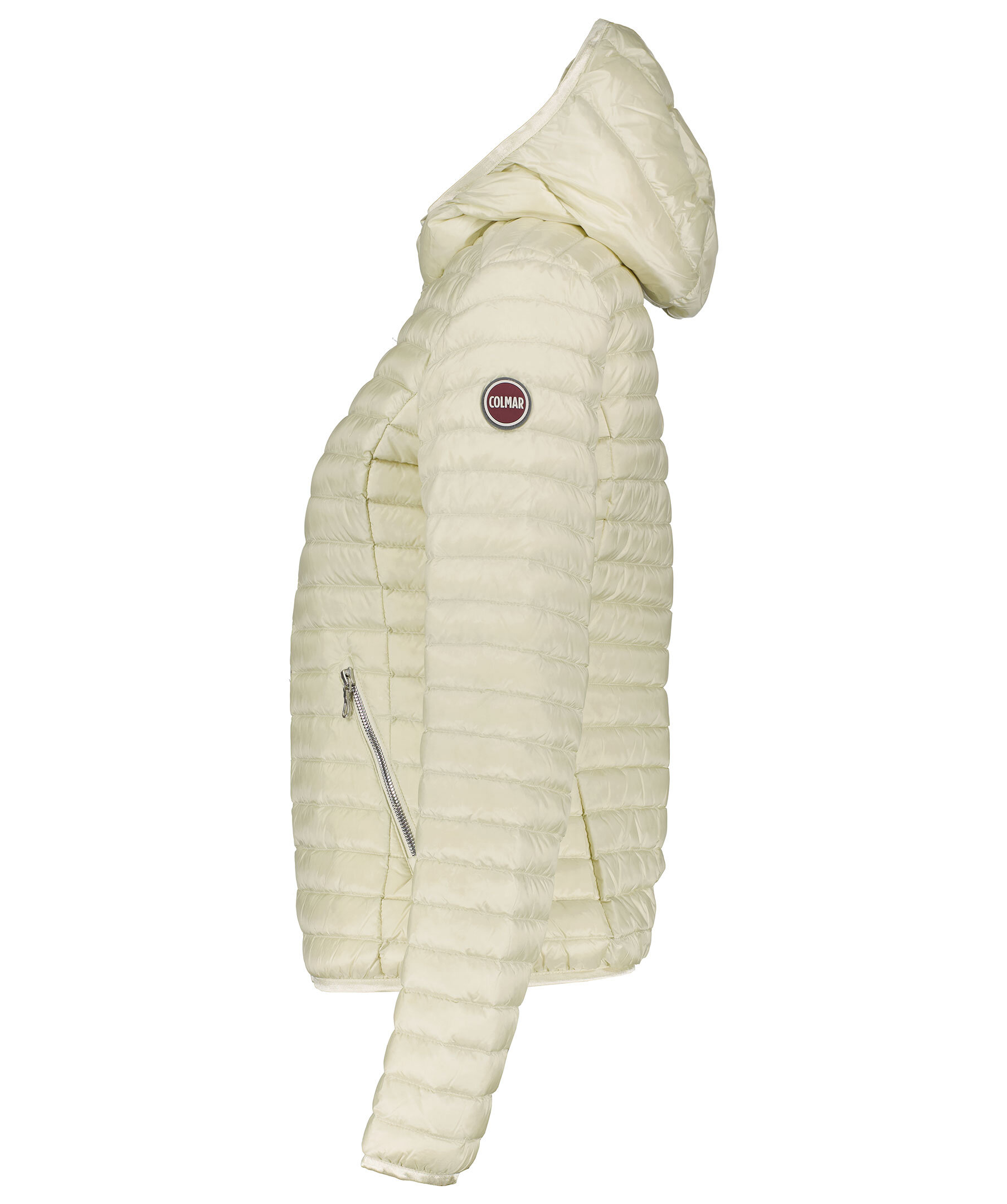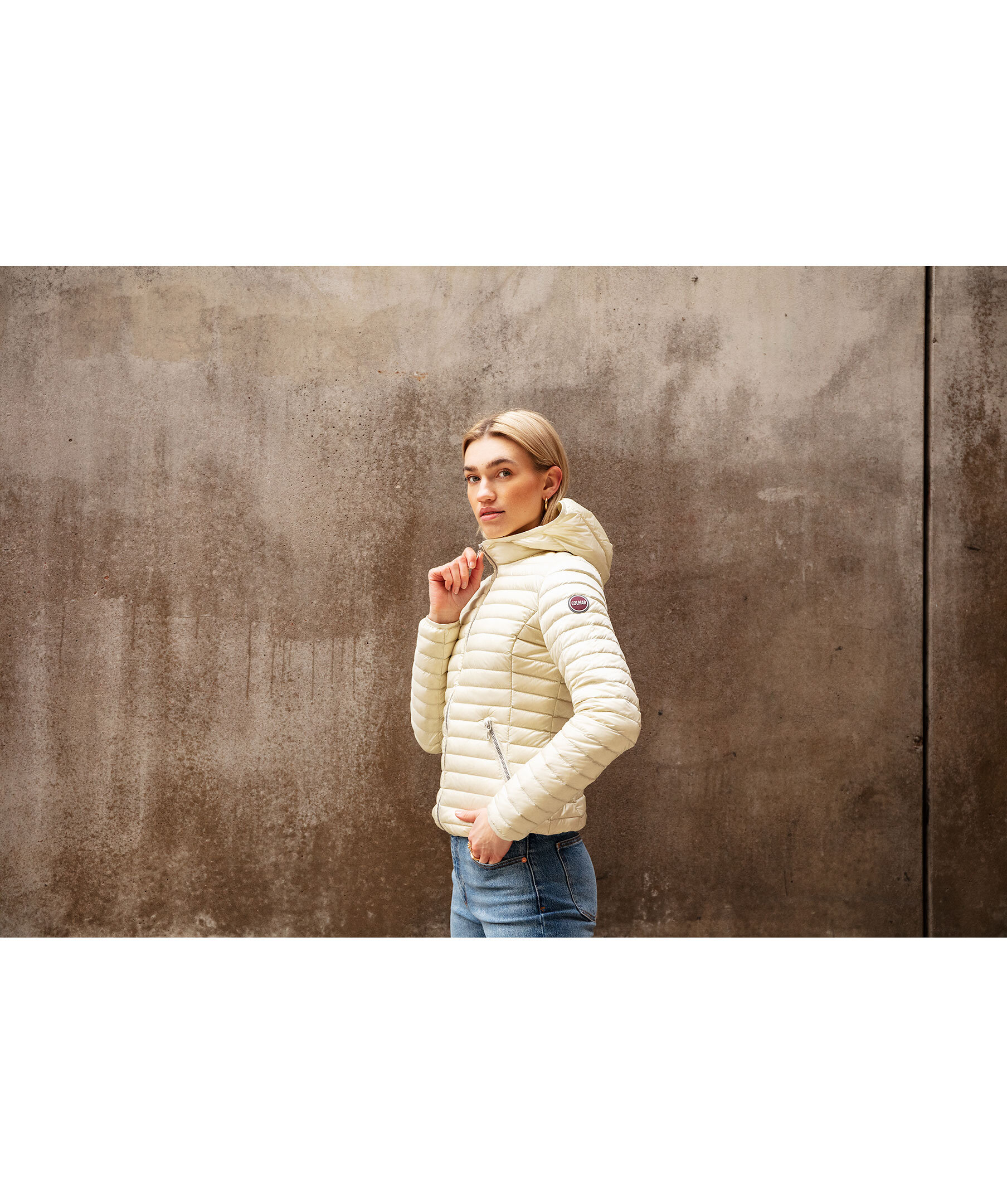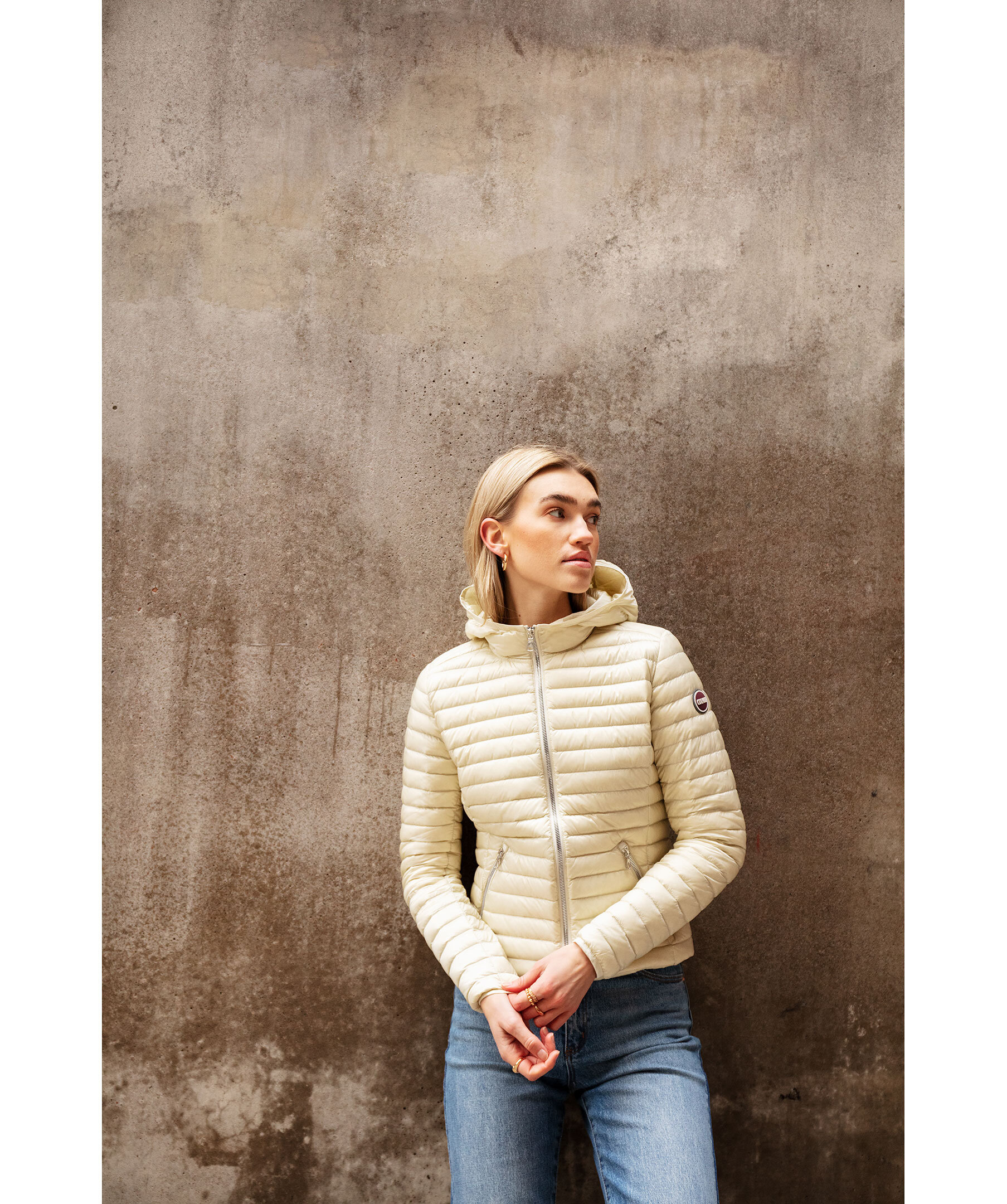 En Ljust beige quiltad dunjacka med ton av gult från Colmar. Stängs framtill med silverfärgad dragkedja. Två snedställda fickor framtill som stängs med dragkedja. Gummerad logotyp på vänster ärm. Smal elastisk mudd i ärm-, plaggslut och luvans kant. Modellen är 179 cm lång och har på sig storlek S.