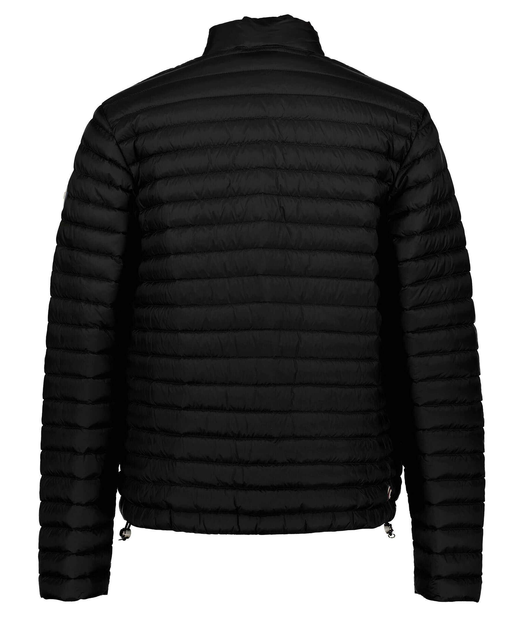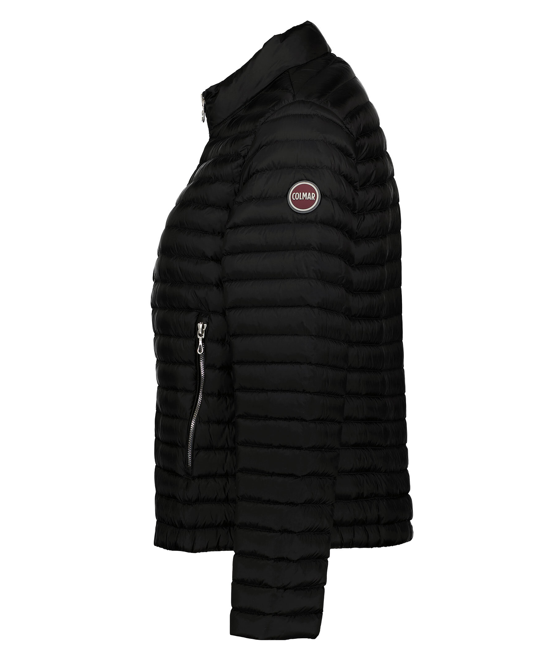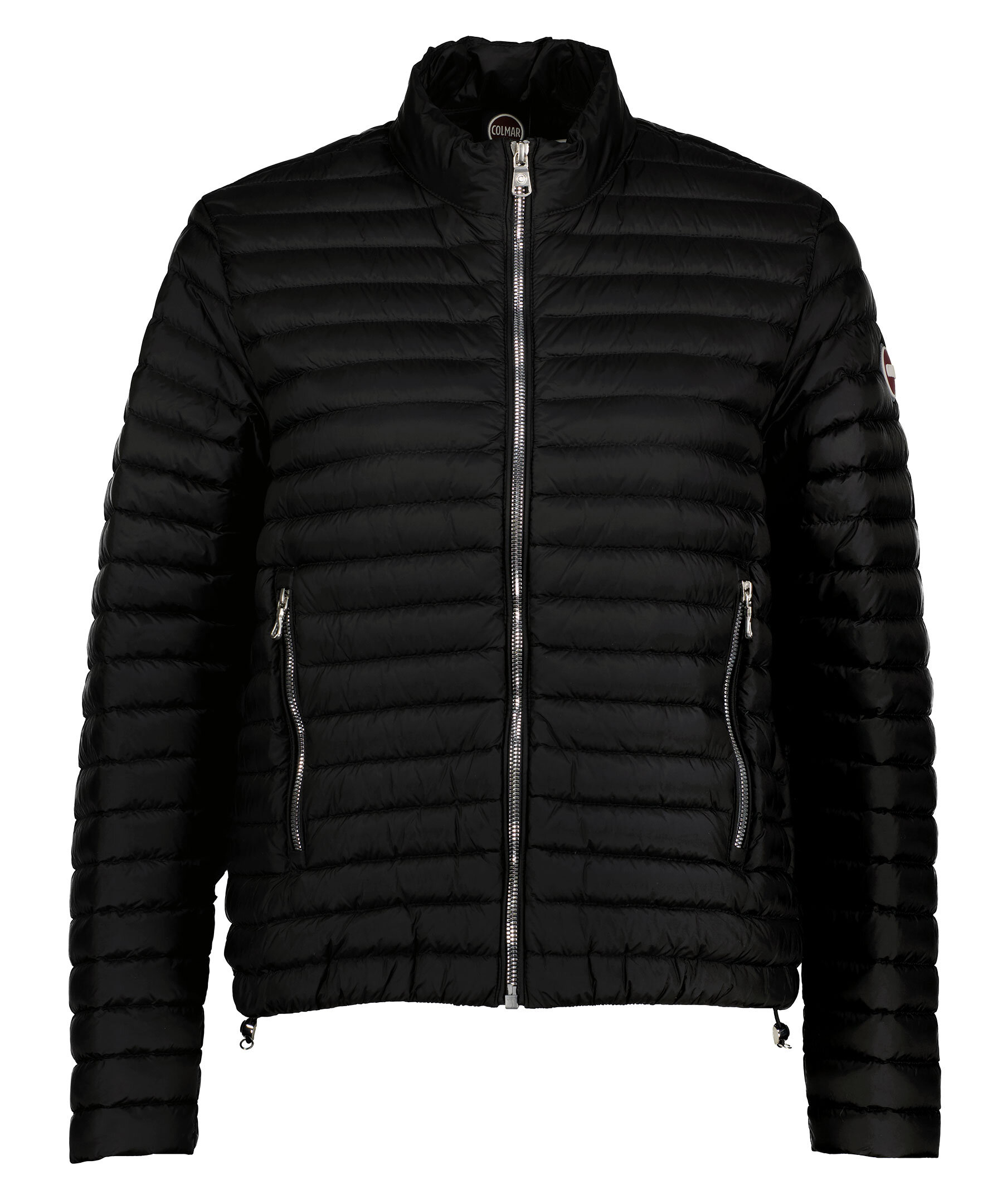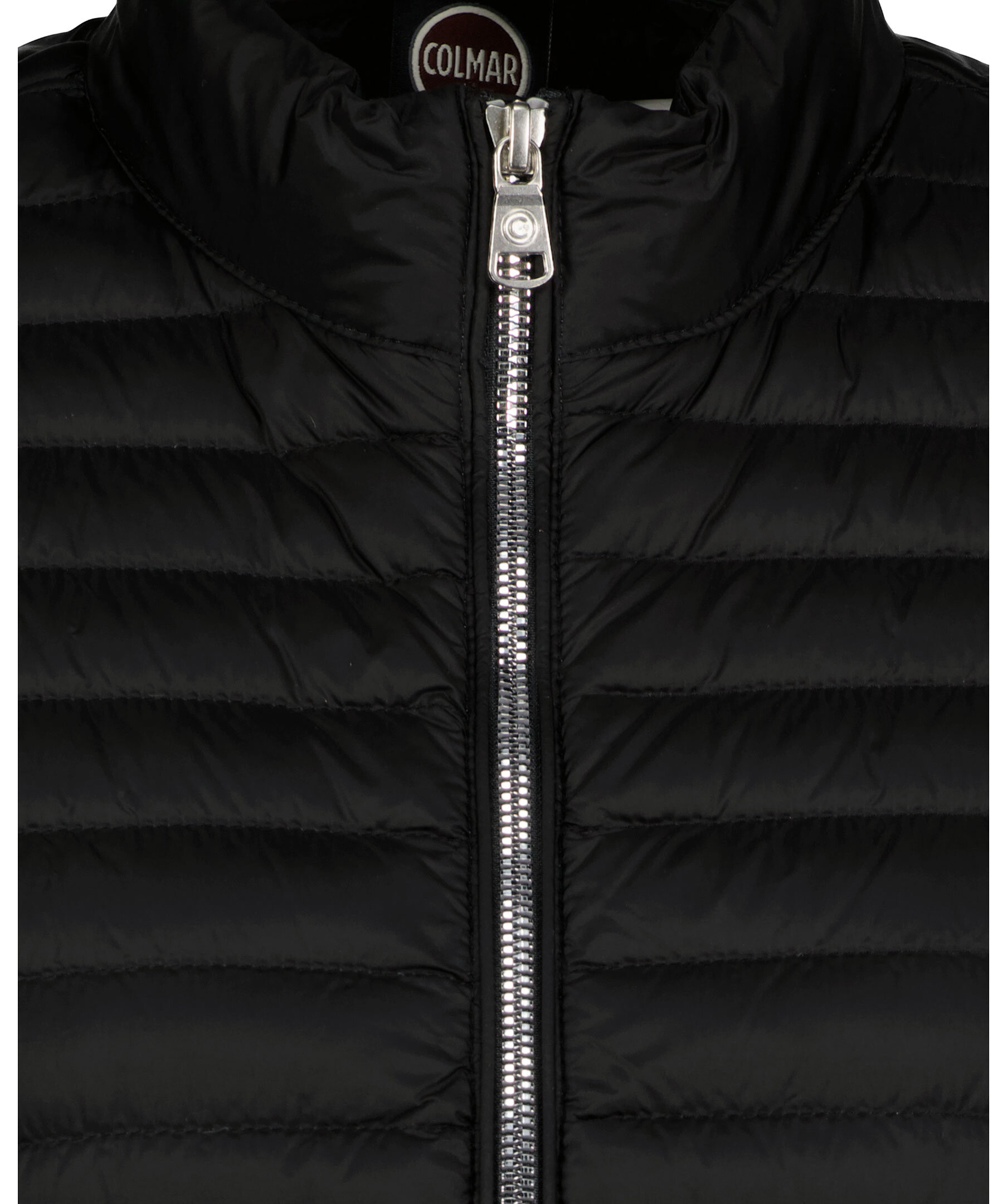 Svart, quiltad dunjacka med medelhög krage från Colmar. Stängs med silverfärgad dragkedja ända upp och har två snedställda fickor framtill som stängs med dragkedja. Gummerad logotyp på vänster ärm och bak på höger höft. Elastisk dragsko i jackans nederkant. Jackans längd är tänkt att sluta vid höften.