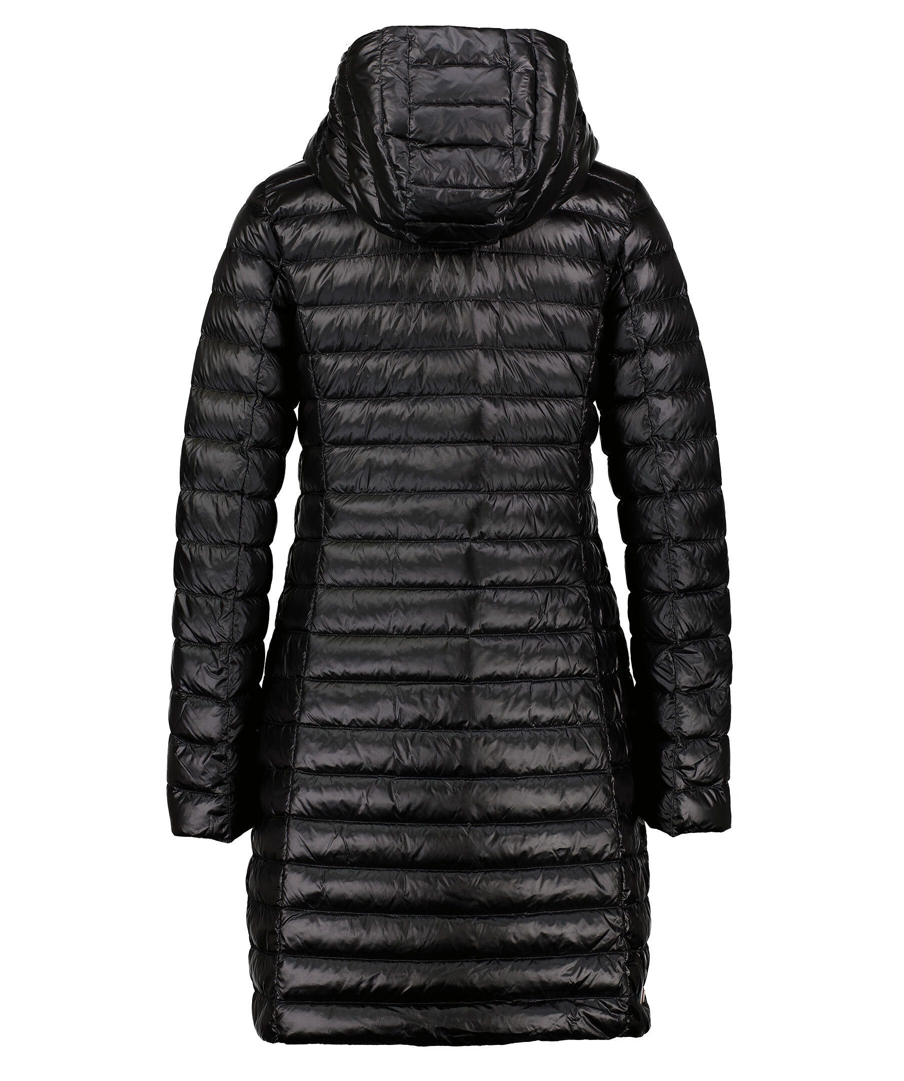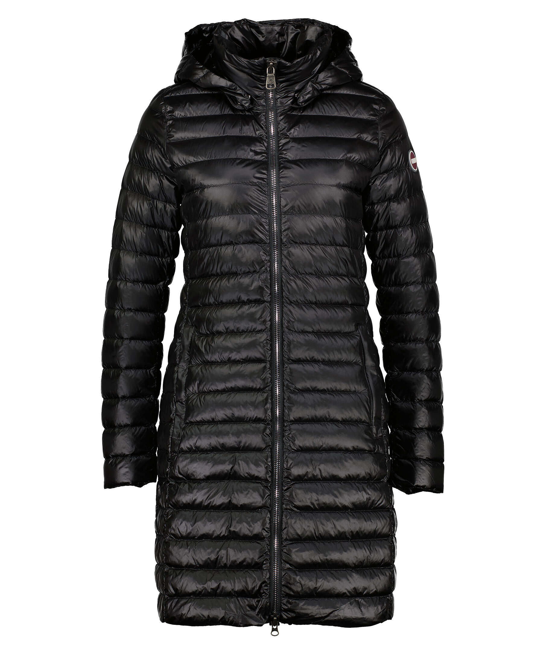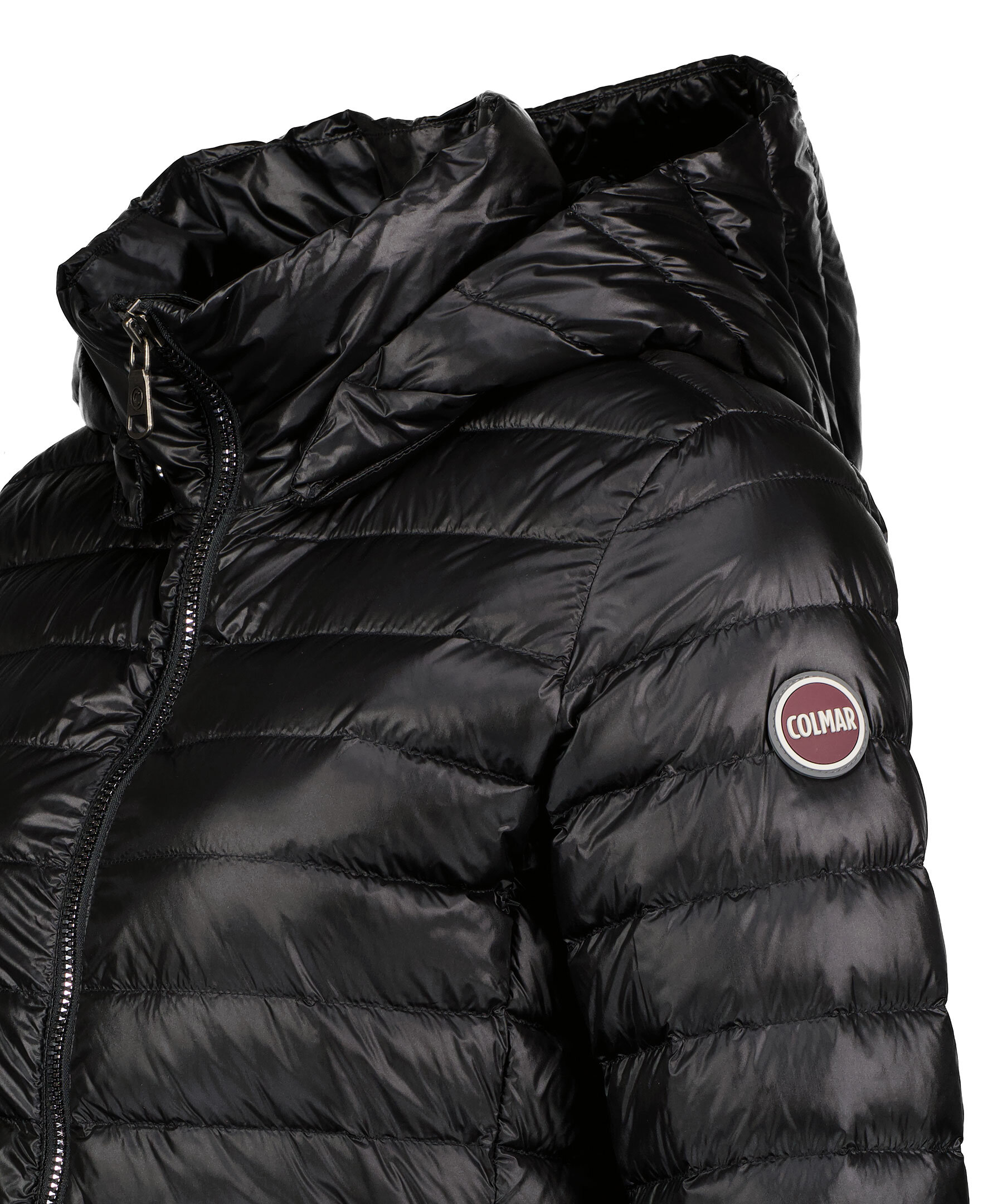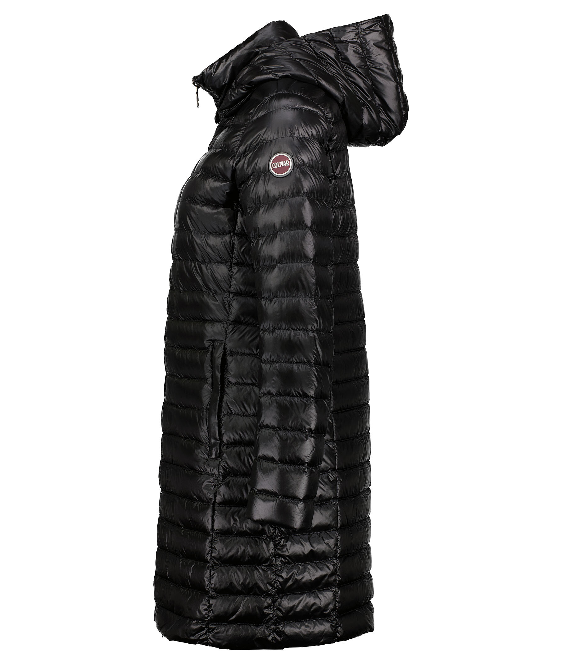 Svart, lång quiltad dunjacka från Colmar. Stängs med silverfärgad dragkedja och har två snedställda fickor framtill som stängs med dragkedja. Gummerad logotyp på vänster ärm och bak vid höger plaggslut. Elastisk dragsko i jackans nederkant. Jackans längd är tänkt att sluta mitt på låret. Avtagbar luva.