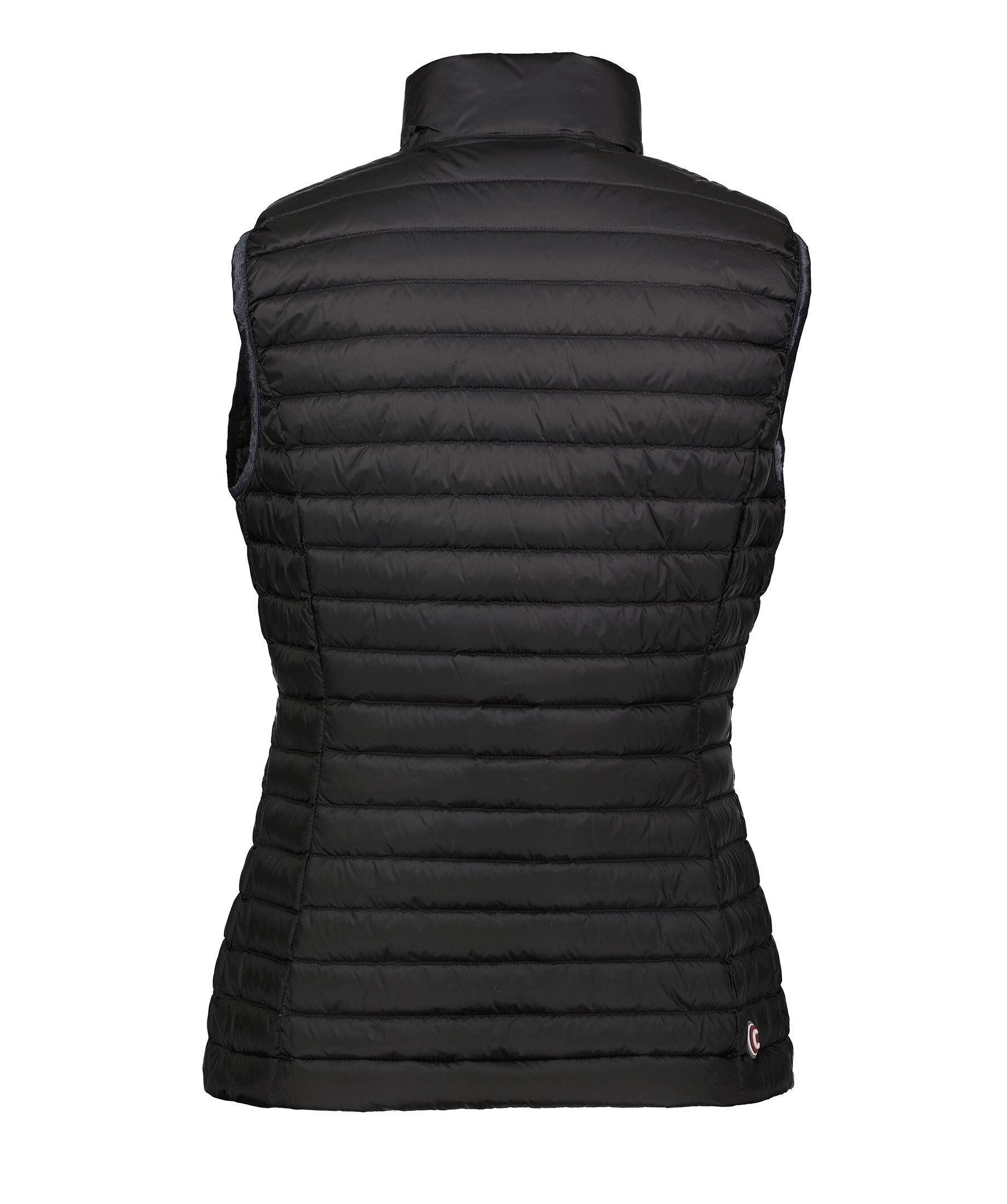 Svart dunväst från Colmar. Stängs framtill med silverfärgad dragkedja. Två fickor framtill som stängs med dragkedja. Smal elastisk mudd i ärm-och plaggslut. Gummerad logotyp på vänster sida vig plaggslut.