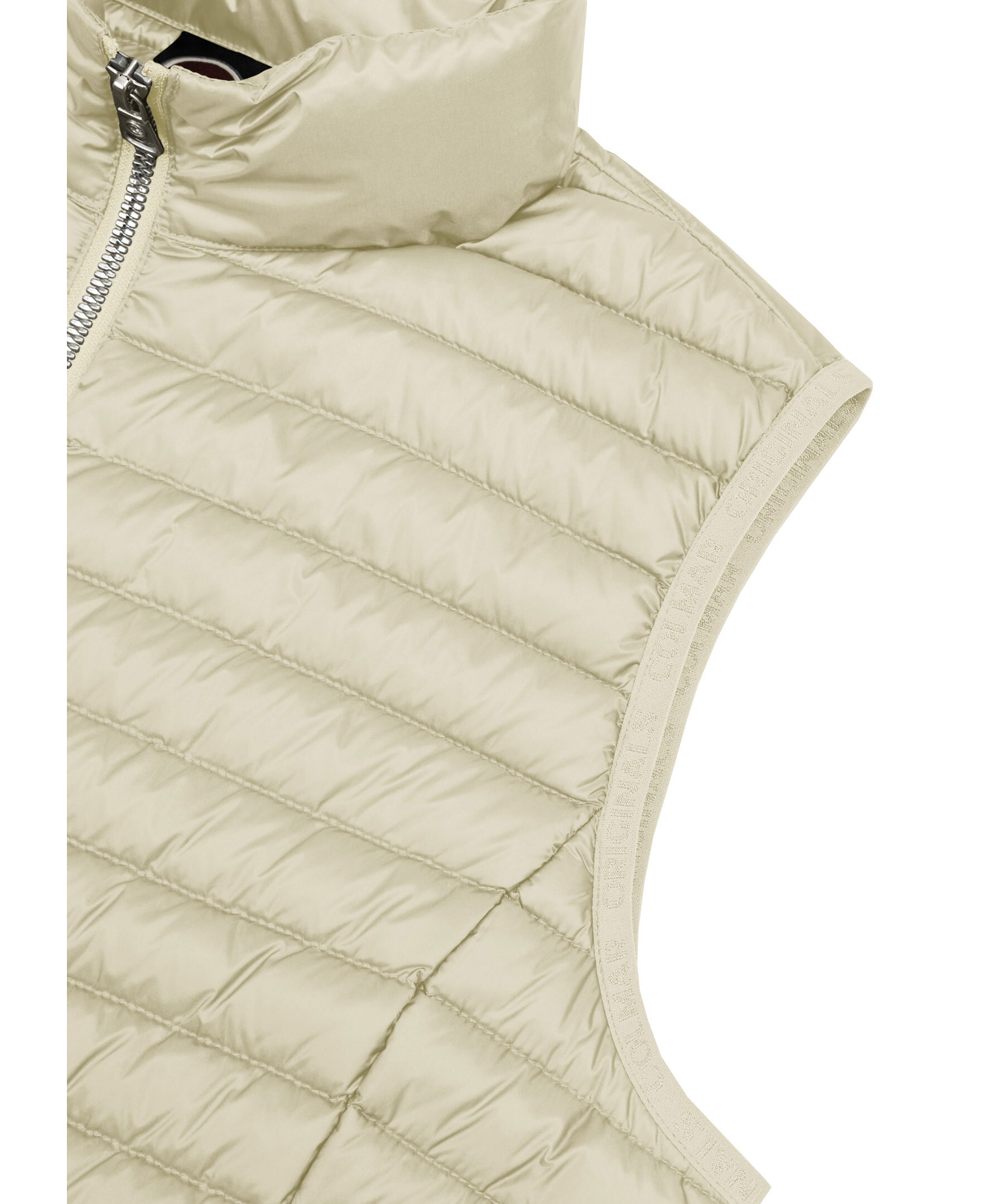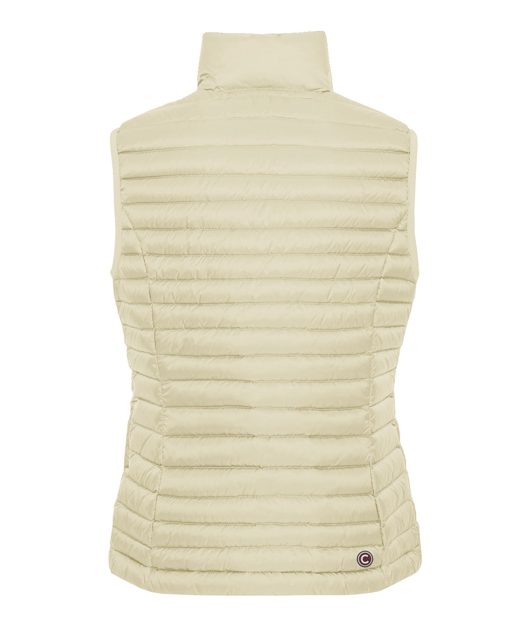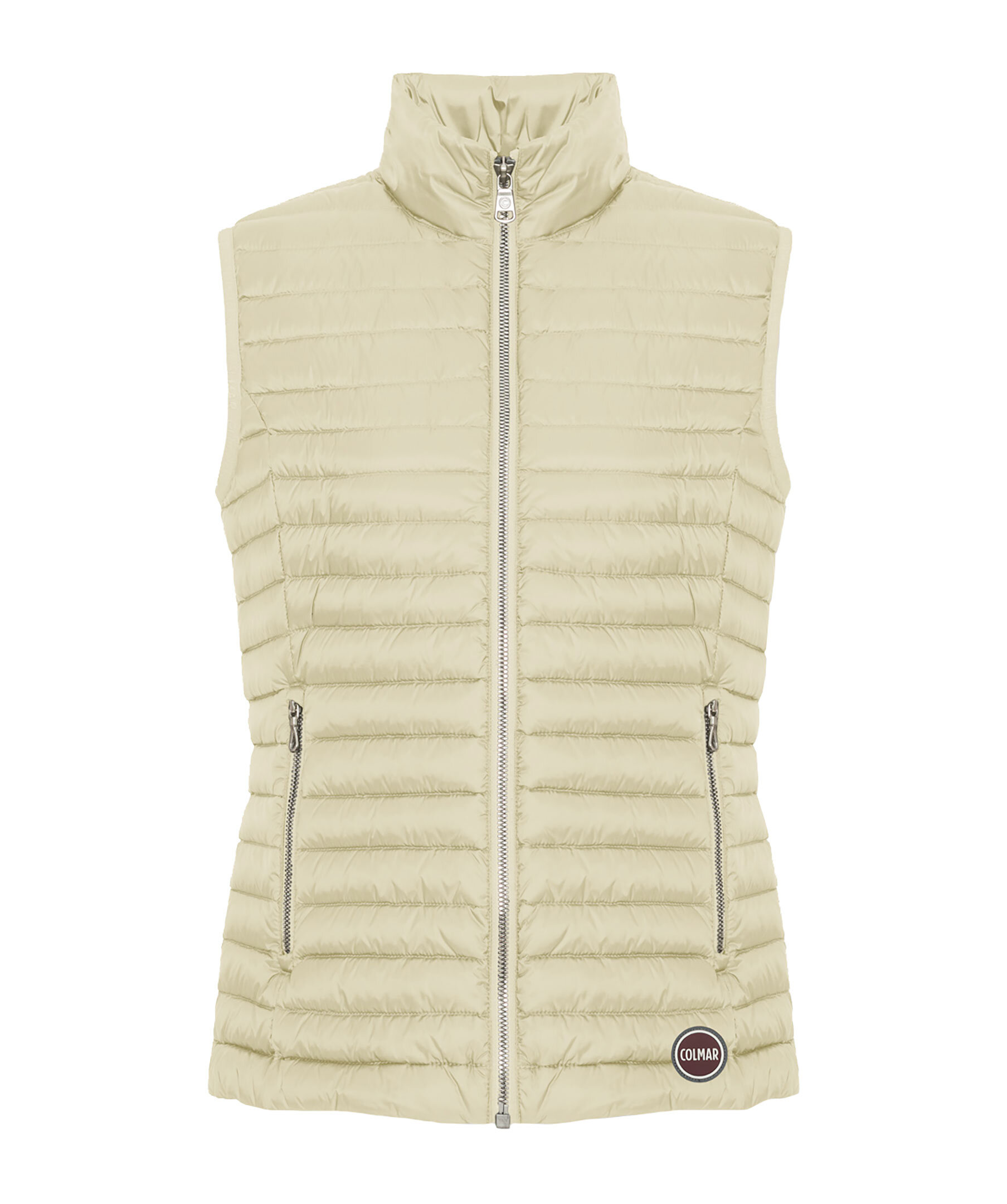 Krämvit dunväst från Colmar. Stängs framtill med silverfärgad dragkedja. Två fickor framtill som stängs med dragkedja. Smal elastisk mudd i ärm-och plaggslut. Gummerad logotyp på vänster sida vig plaggslut.