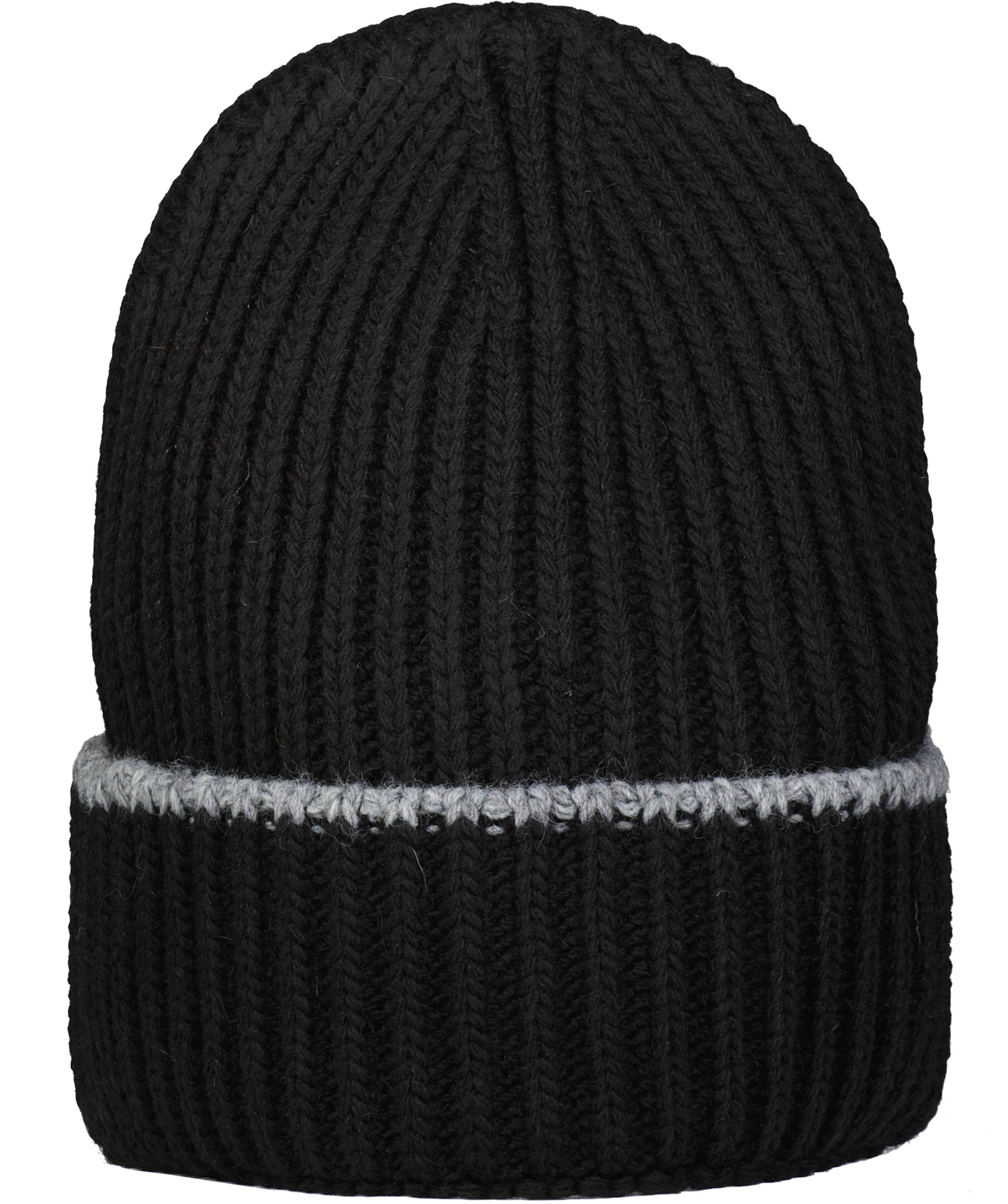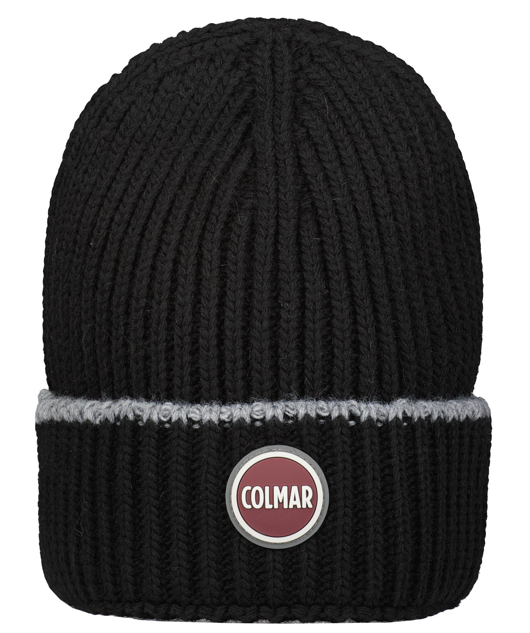 Svart ribbstickad mössa från Colmar. Tillverkad av alpacka och ullblandning, har en uppvikt kant med kontrastrand i grått. Patch i gummi med logga på framsidan av mössan.