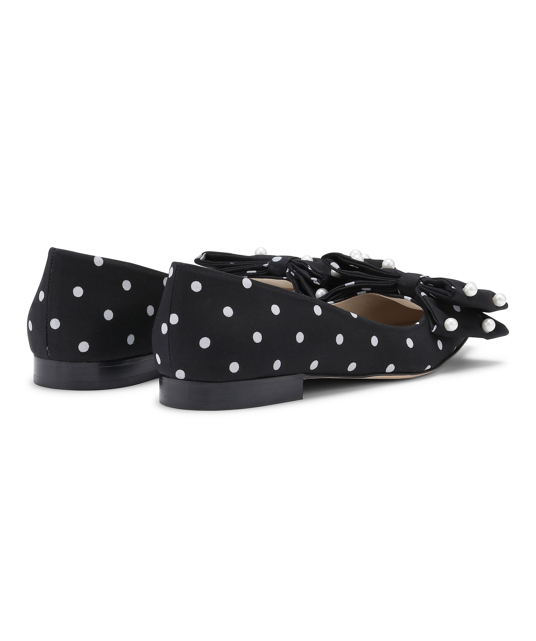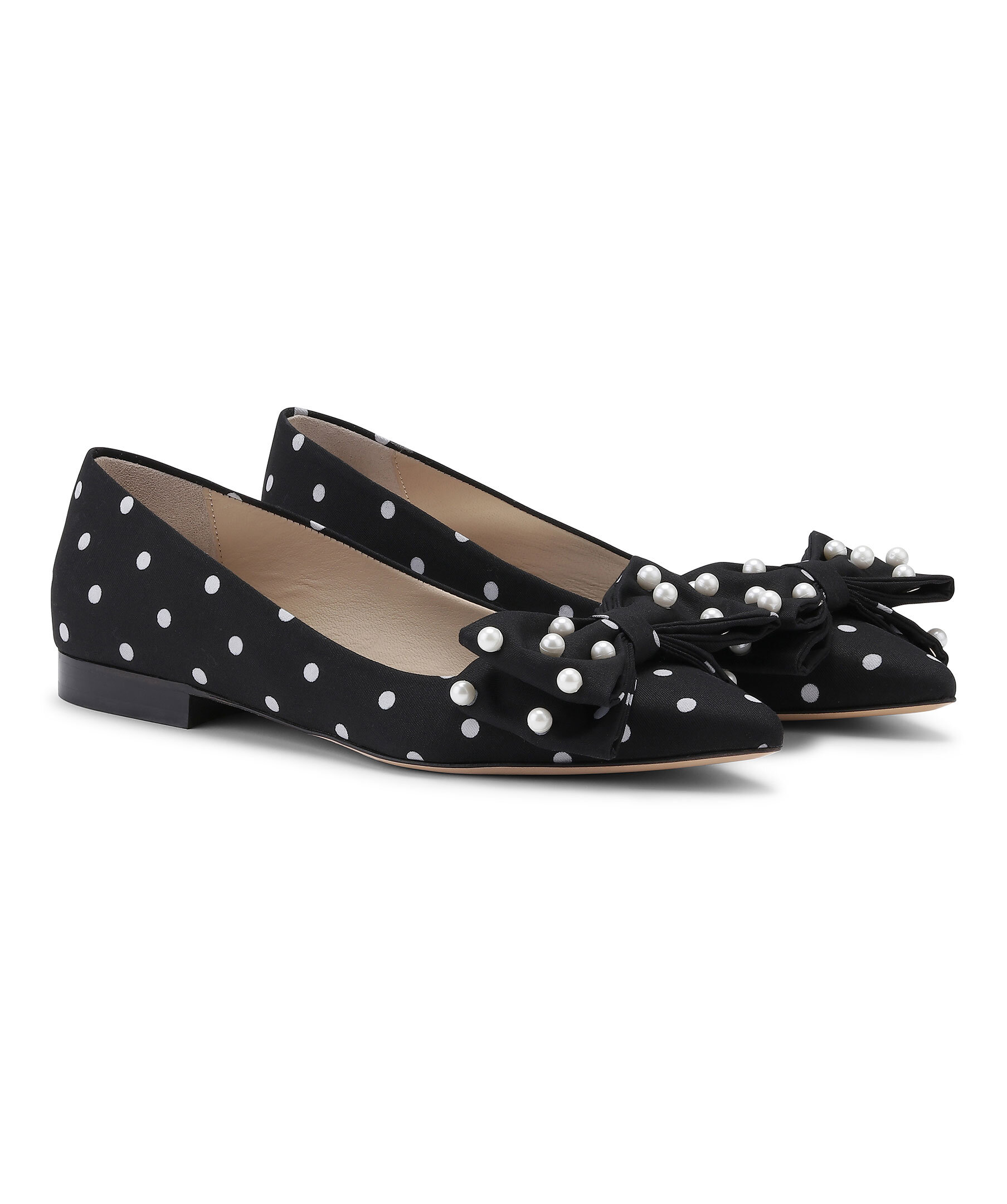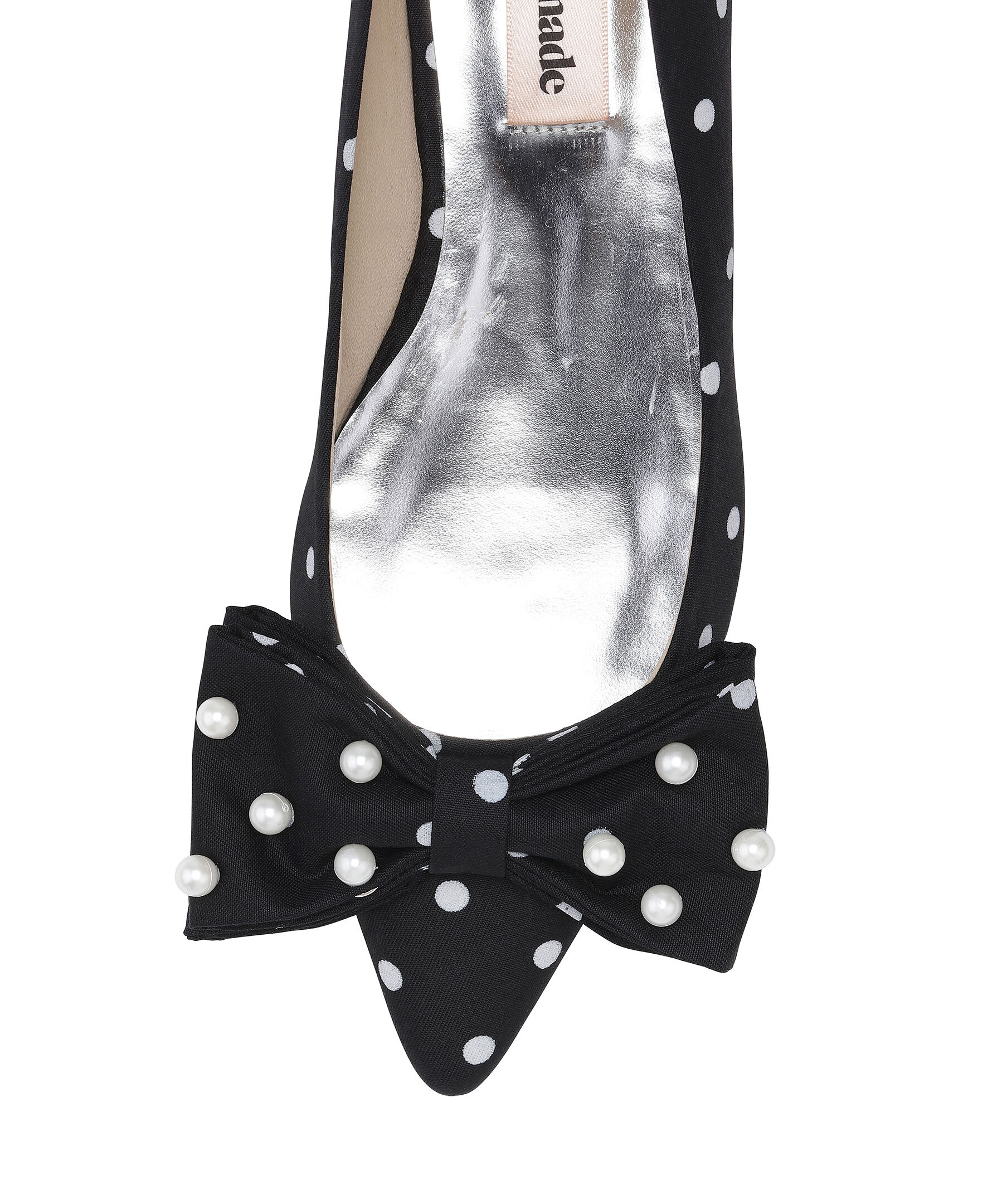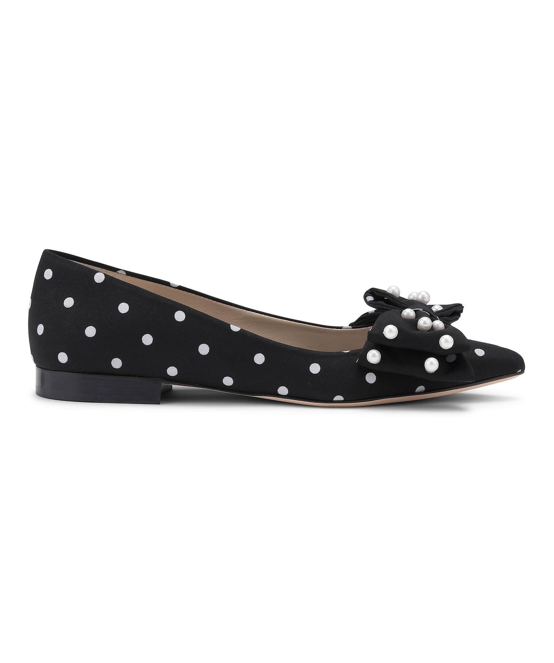 Svarta, platta skor med ett vitt prickigt tryck från Custommade. Liten rosettdetalj framtill med vita pärlor och spetsig tå fram. Det är den perfekta festskon med en unik design. Den är normal i storleken och handgjorda i Portugal. Tillverkade i 100% polyester.