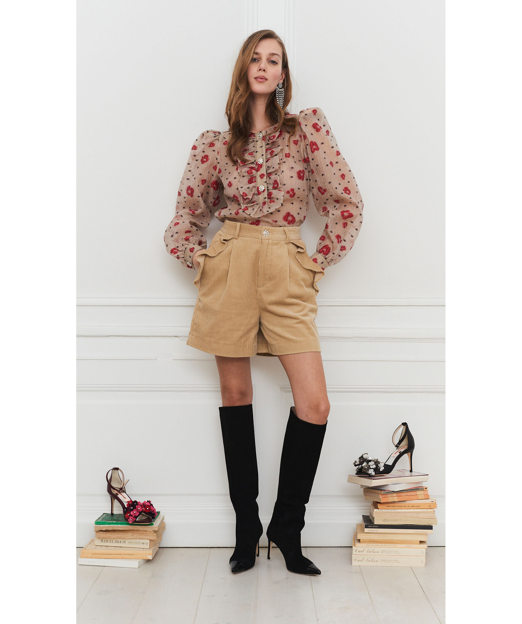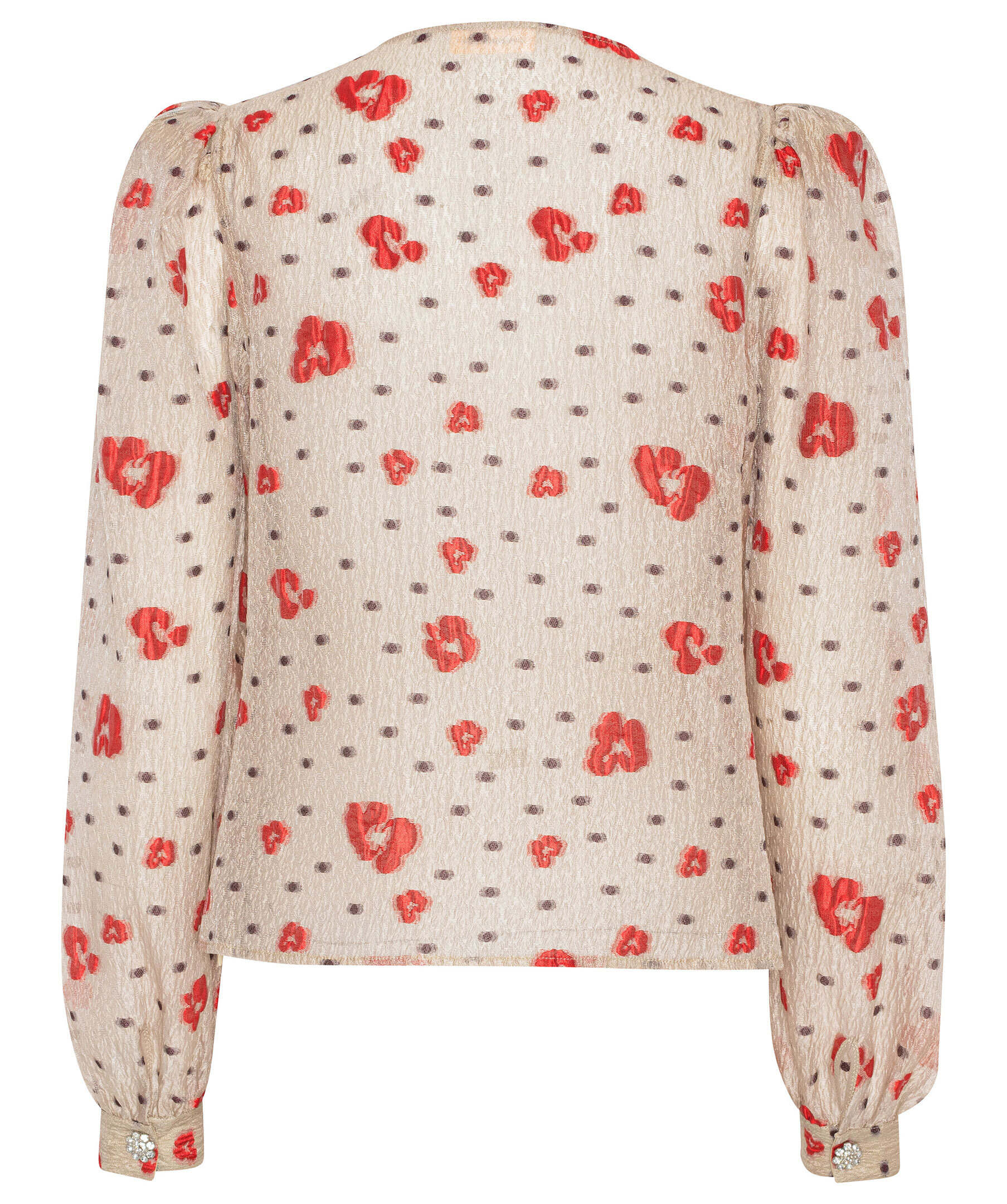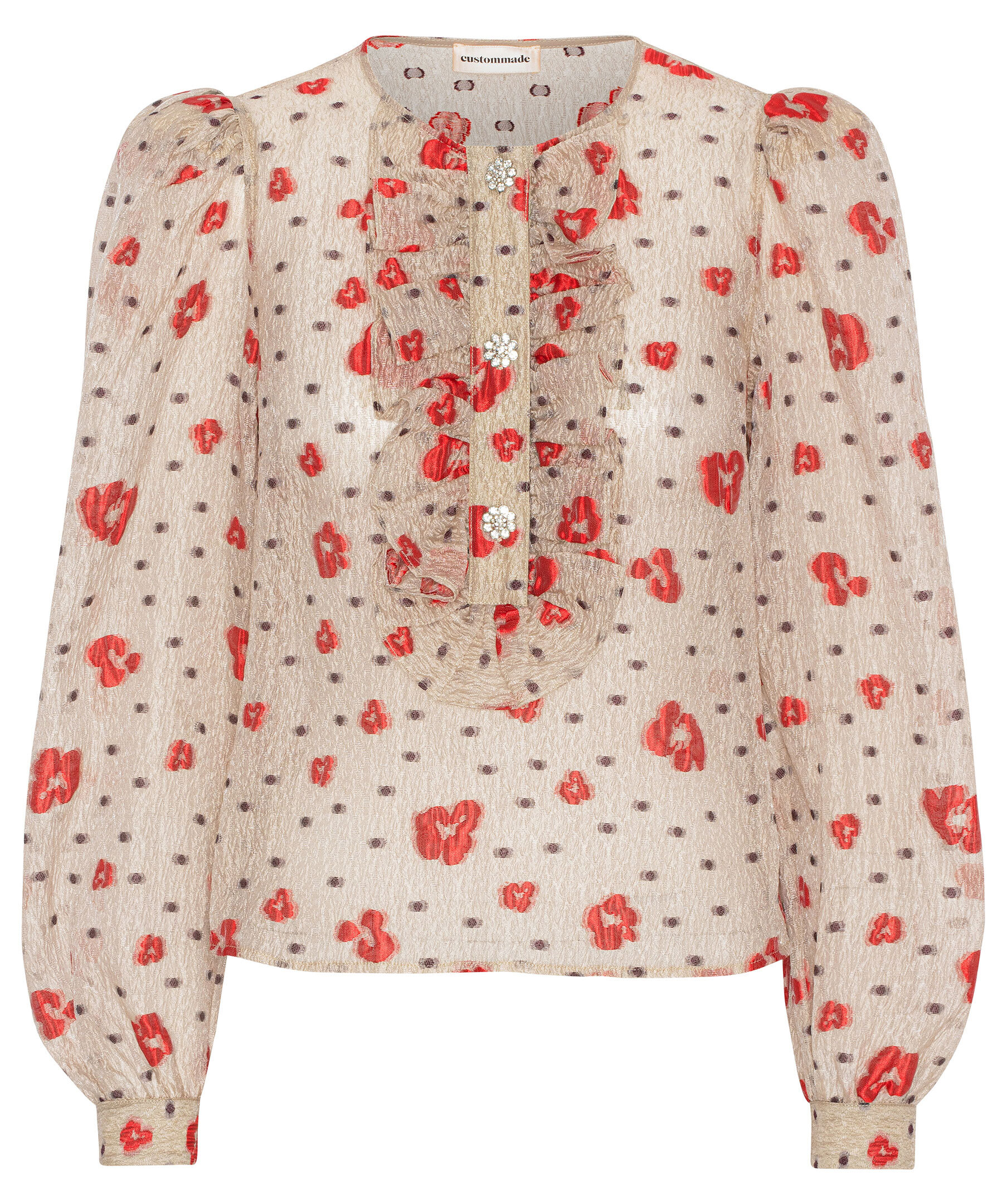 Beige och röd mönstrad blus från Custommade. Rundad halsringning, knappar med strass framtill, Volang längst knäppningen. Puffärm och manschetter vid ärmslut.