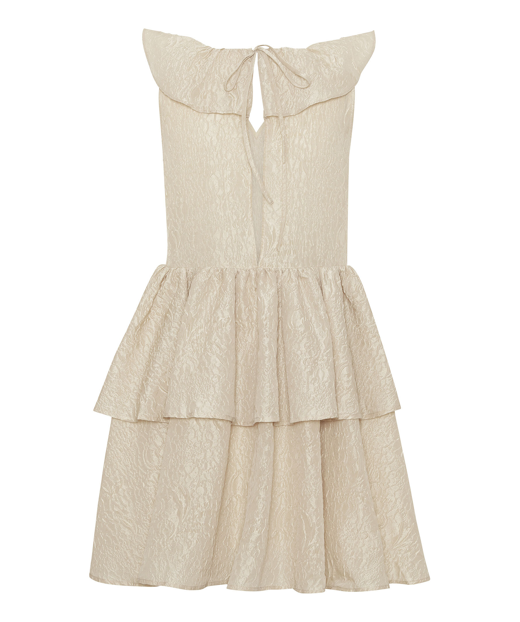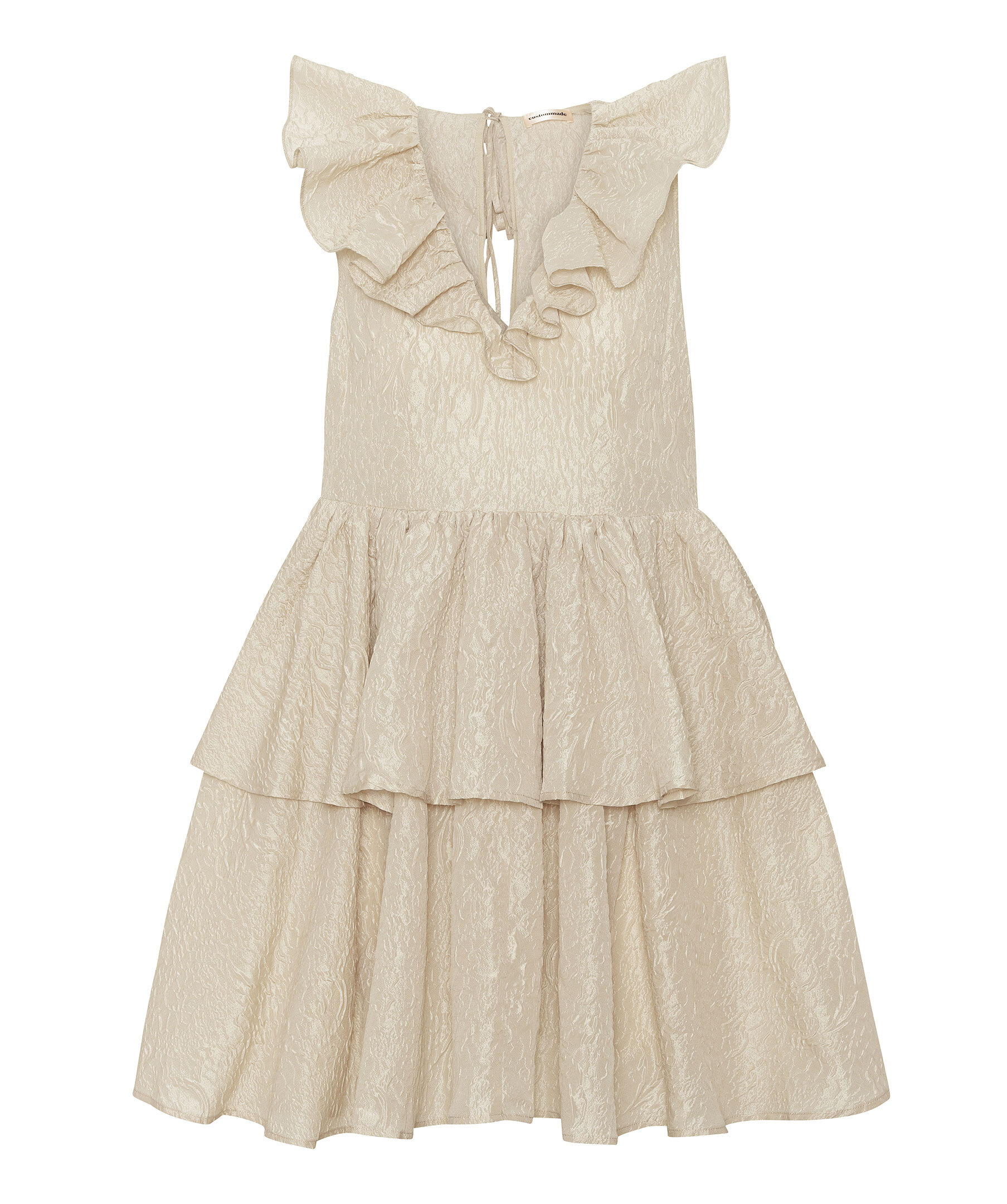 Sandfärgad klänning utan ärmar från Custommade. Tillverkad i ett mjukt tyg i polyesterblandning. Har volang fram över bysten och v-ringning fram samt stängning med snörning i nacken som knyts som en rosett. Figursydd i midjan med sön som bryter av mot en fylligare nederdel med två volanger.