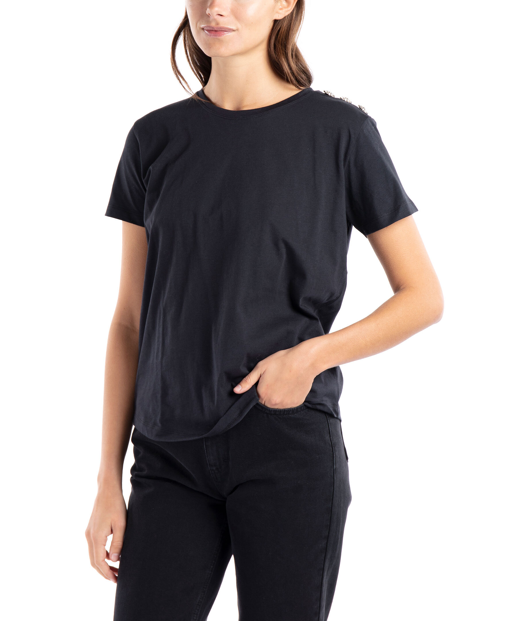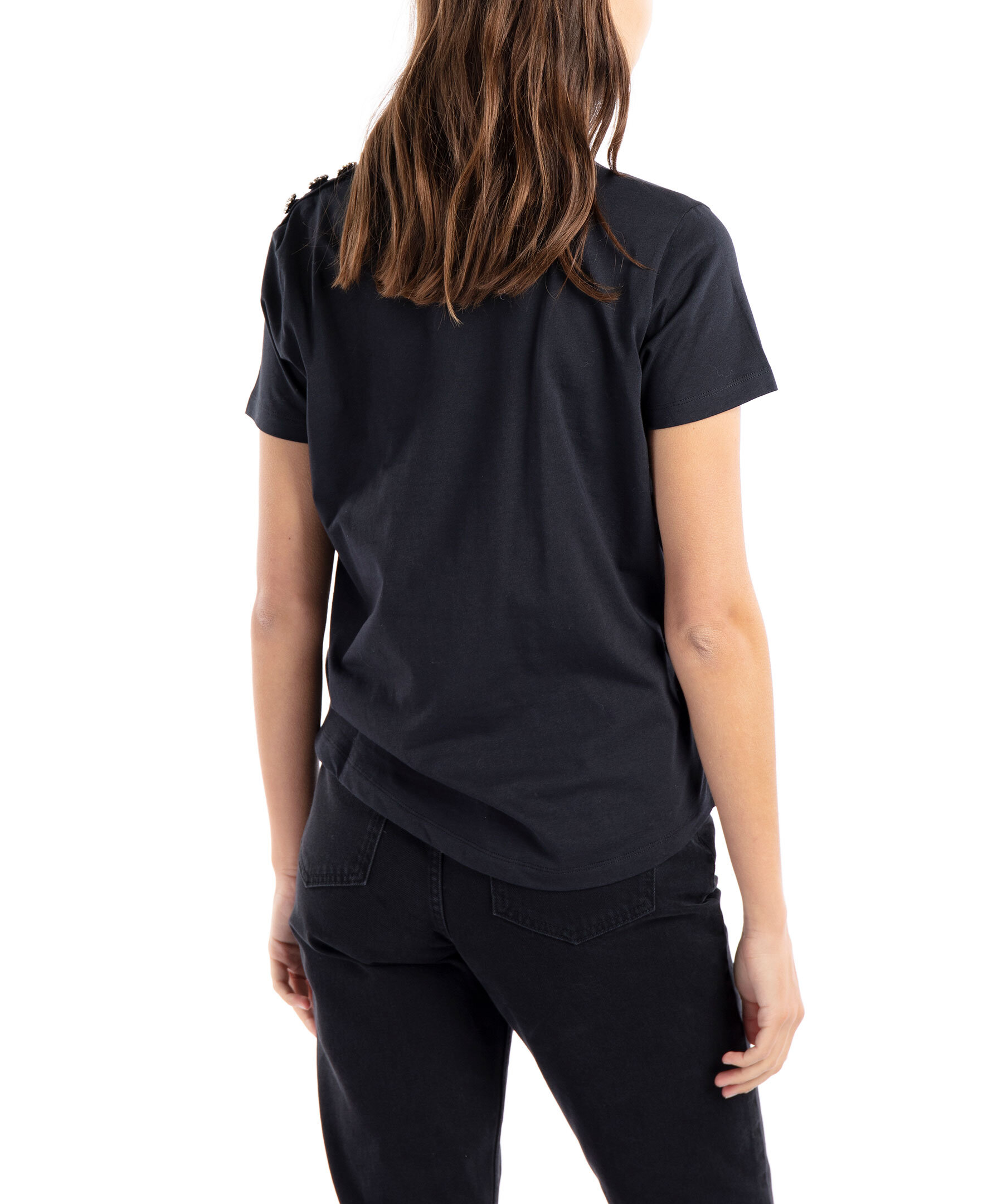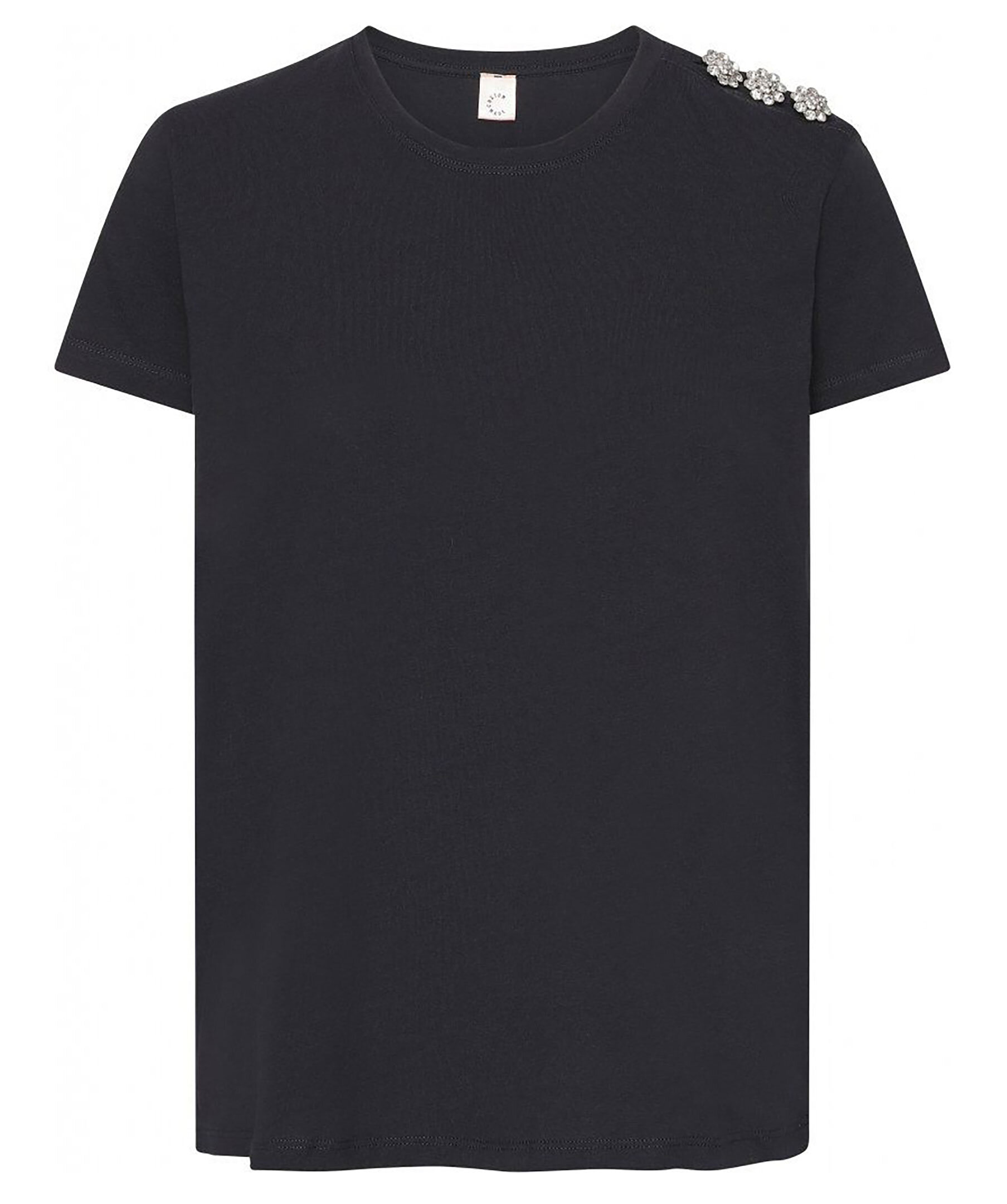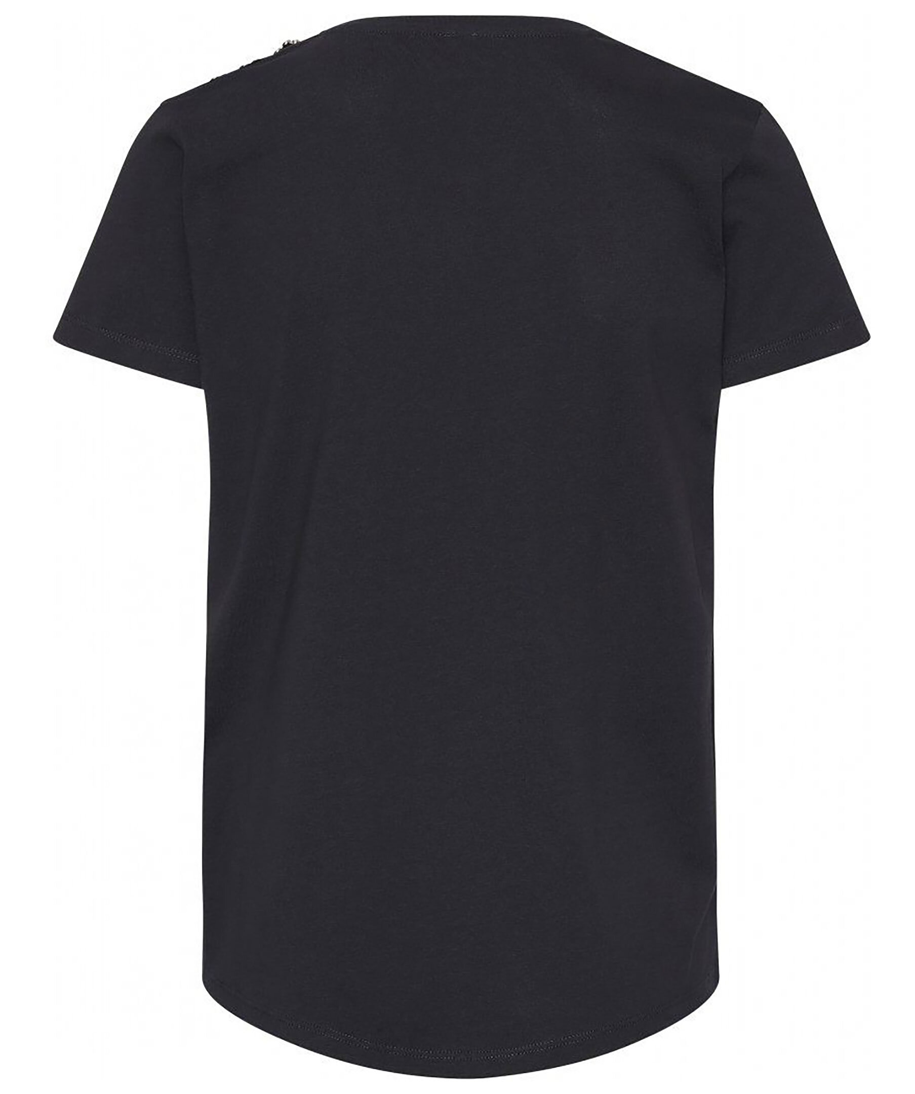 Antracitgrå t-shirt i 100% ekologisk bomull från Custommade. Tre stycken knappar som är utformade som blommor med glittriga stenar på vänster axel. Hög, rundad halsringning och har en rak modell. Modellen är 178cm lång och har på sig storlek 36.