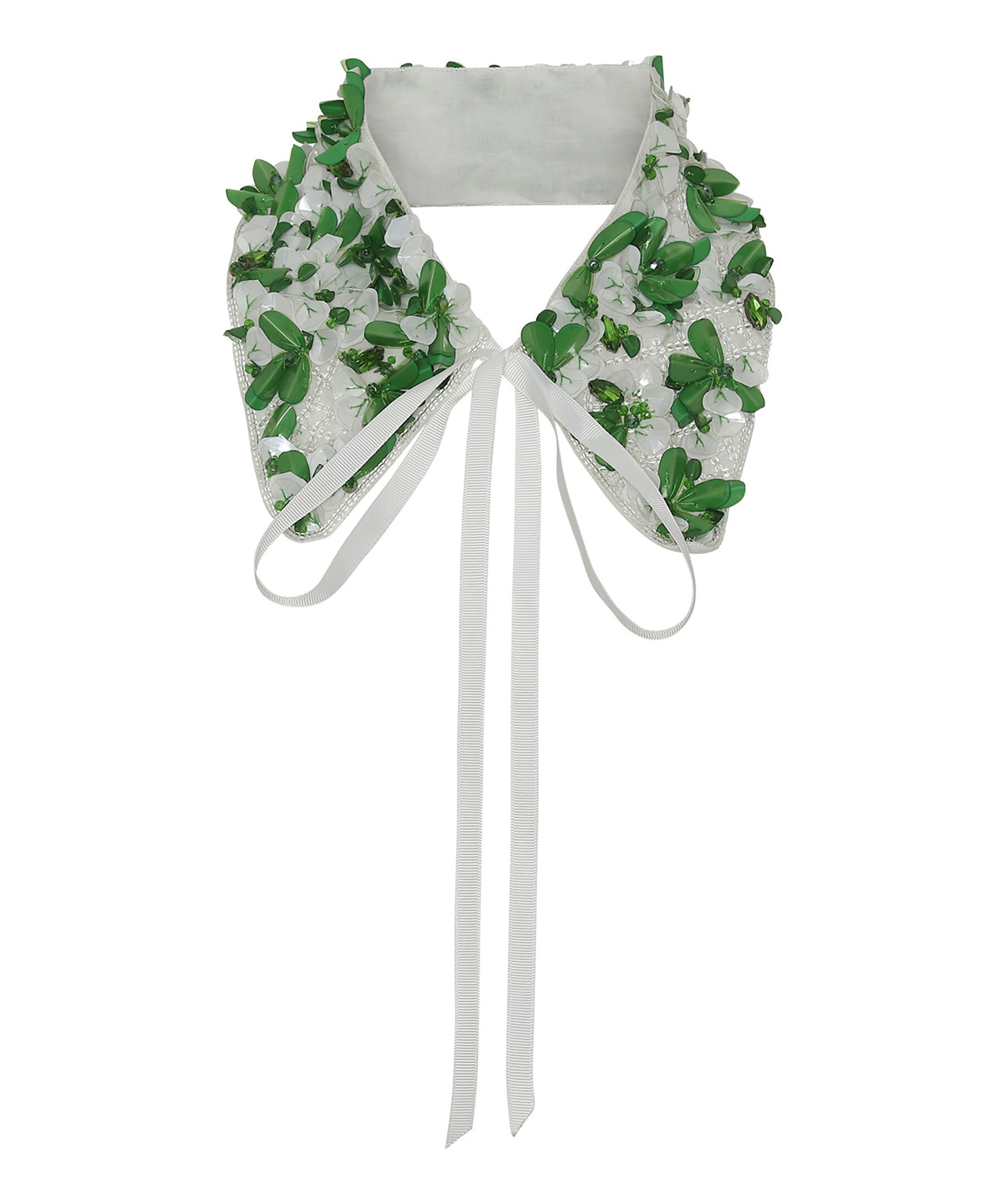 Vit vacker krage med handgjorda detaljer från Custommade. Kan knytas över alla slags ringningar över blusar, klänningar eller jackor. Olika sorters pärlor och paljetter i blommönster i vitt och grönt och vitt band fram som knyts som rosett.