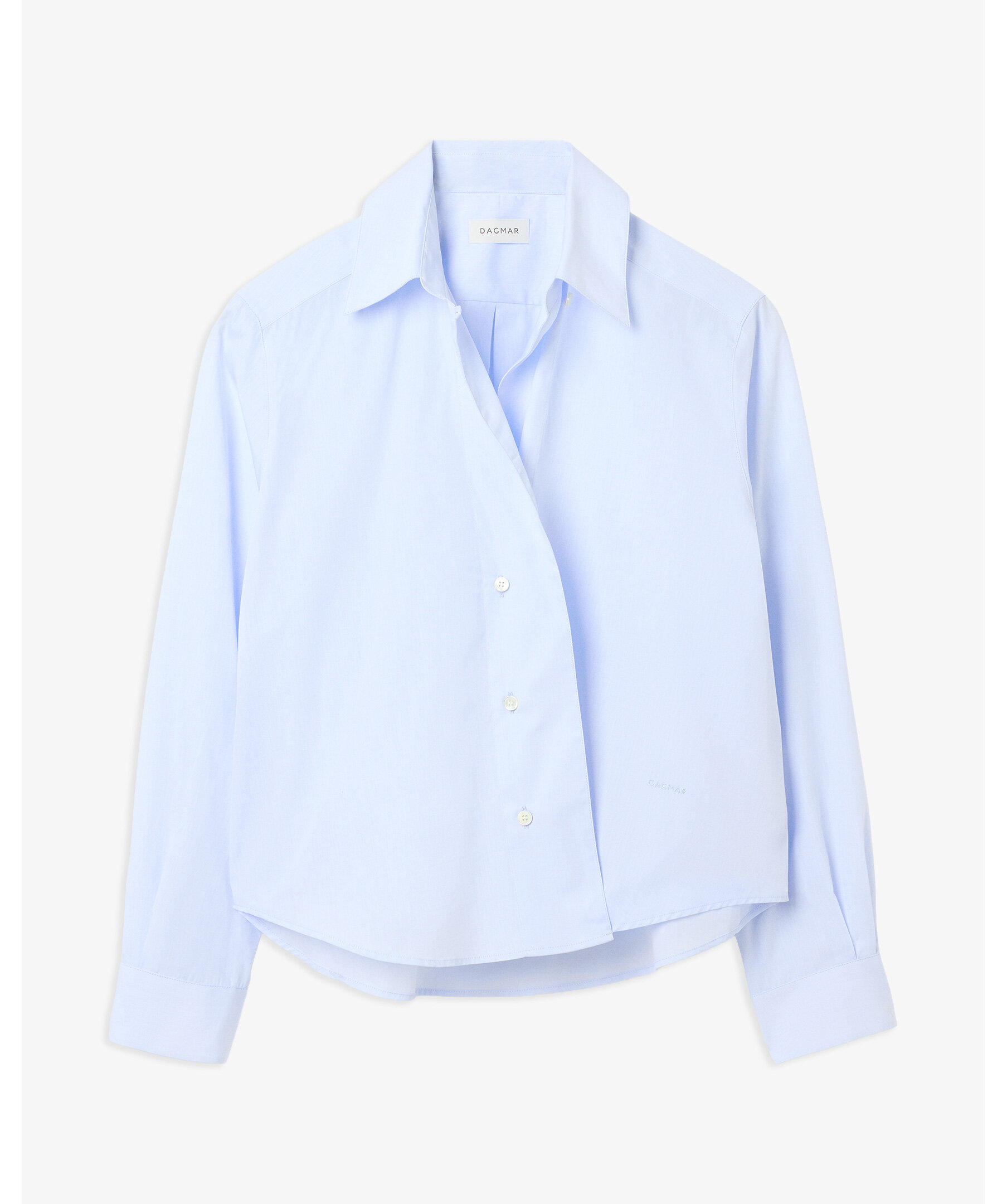 Cropped ljusblå skjorta frånDagmar i krispig ekologisk bomullspoplin med avslappnad, något kort passform, asymmetrisk vikkrage och knappstängning fram – en modern twist på klassisk skjorta som passar till jeans eller skräddade byxor.